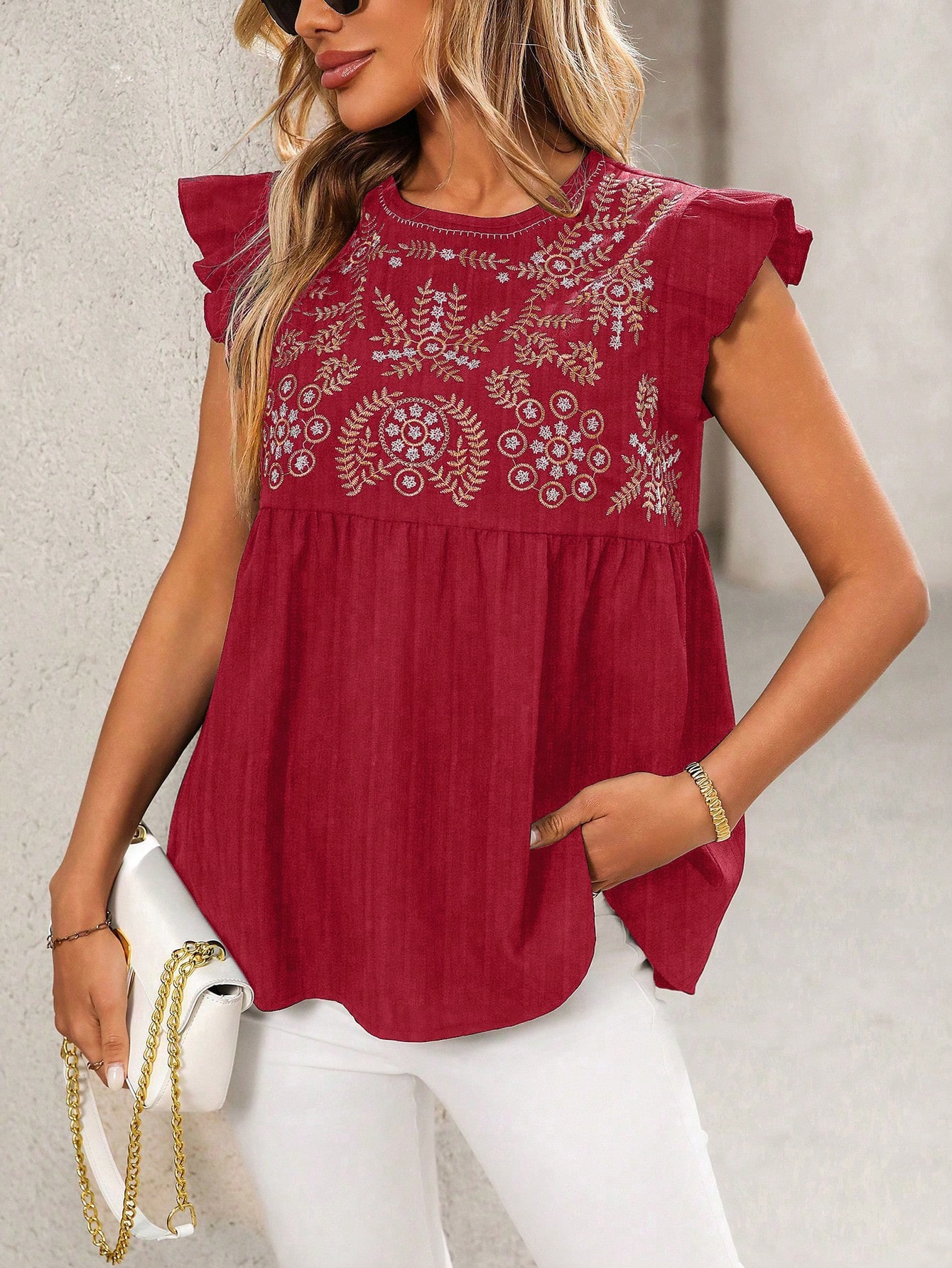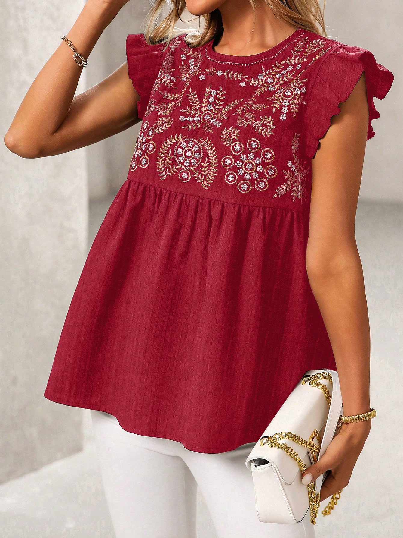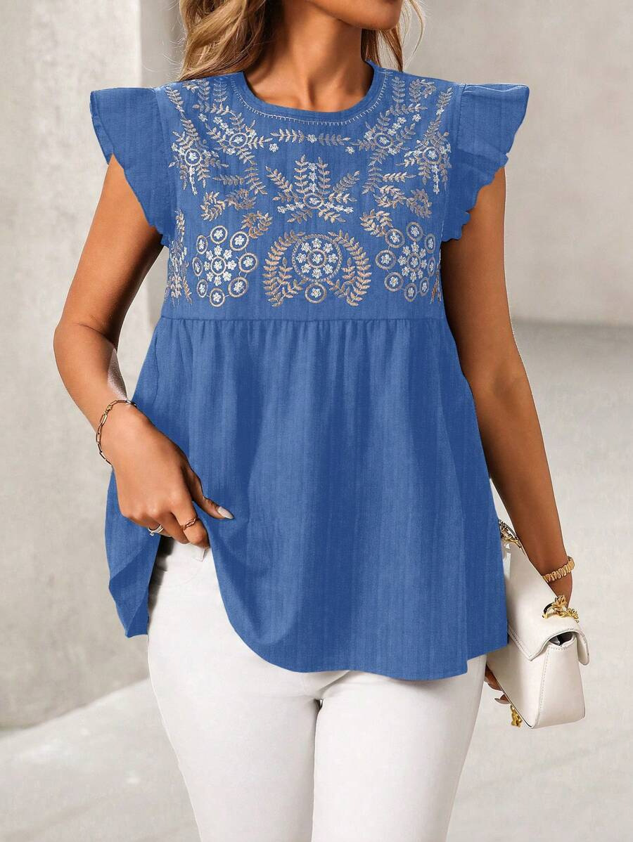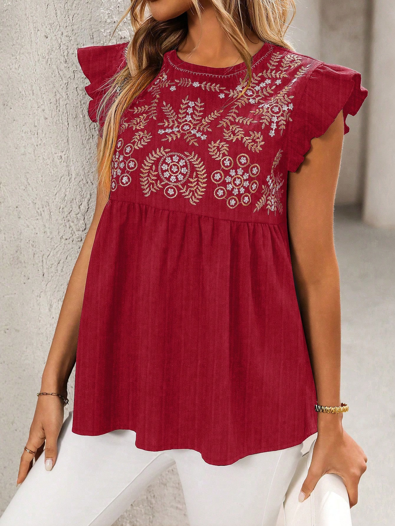 2025 크로스보더 아마존 새로운 민족 스타일 자수 오른쪽 어깨 플라잉 슬리브 여성을위한 세련된 루즈 캐주얼 셔츠