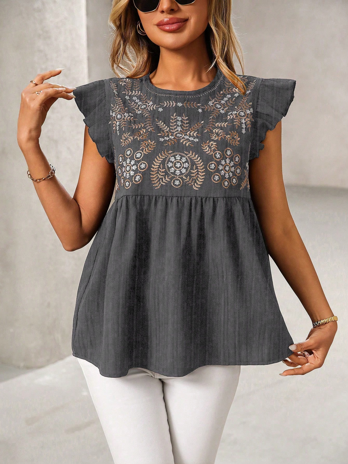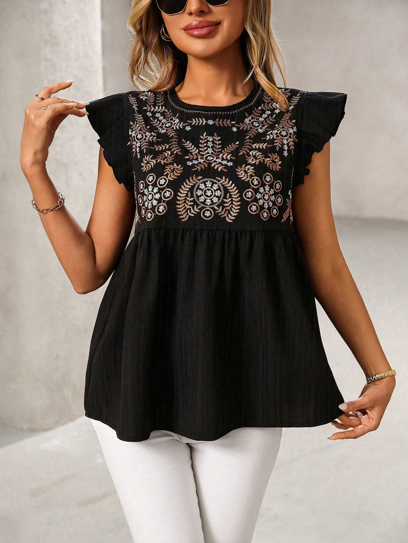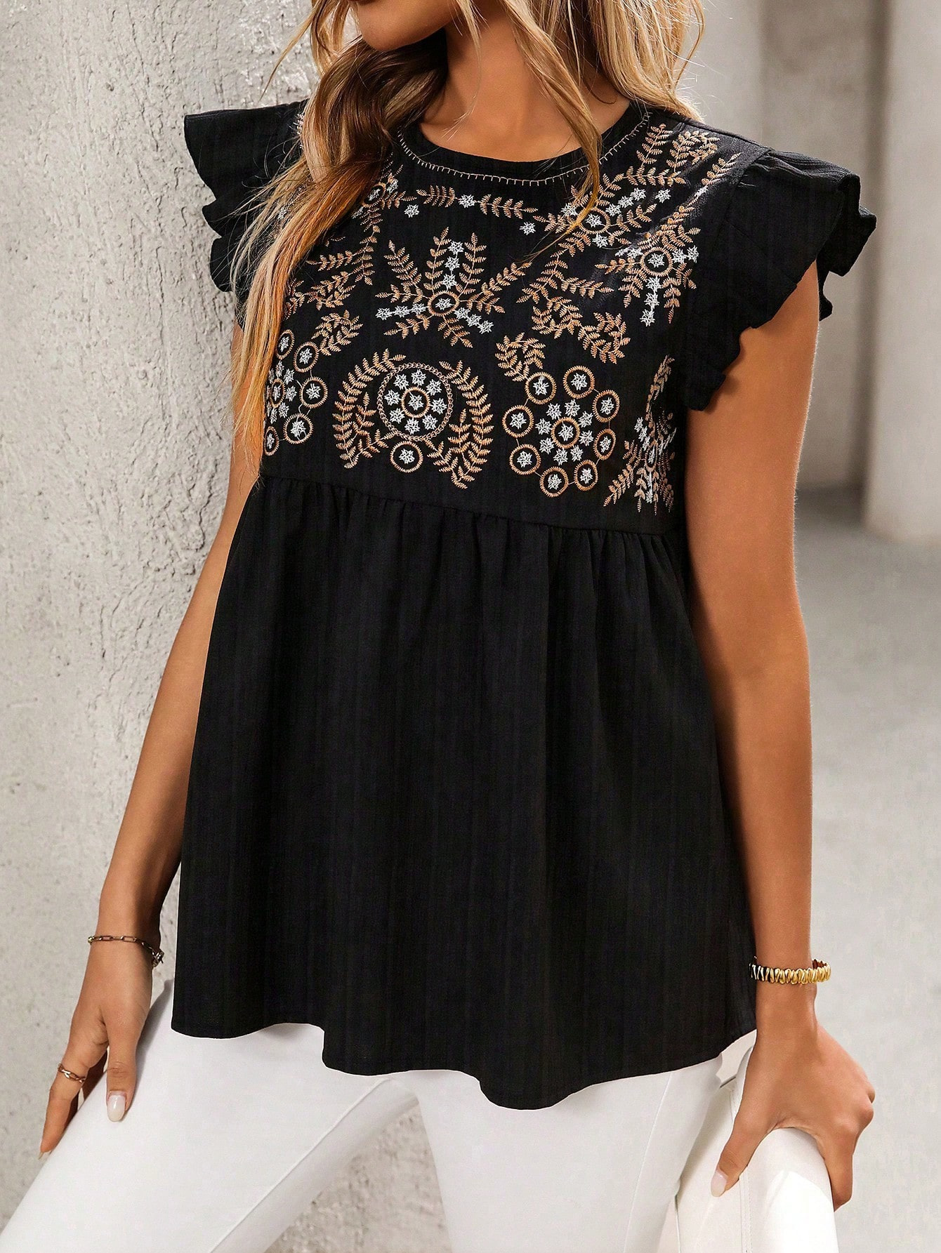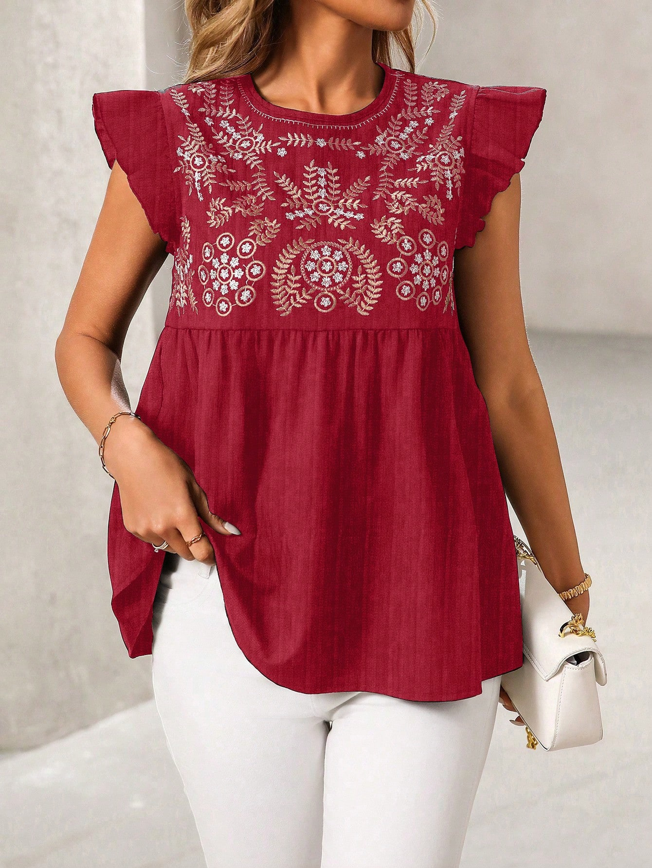 2025 크로스보더 아마존 새로운 민족 스타일 자수 오른쪽 어깨 플라잉 슬리브 여성을위한 세련된 루즈 캐주얼 셔츠