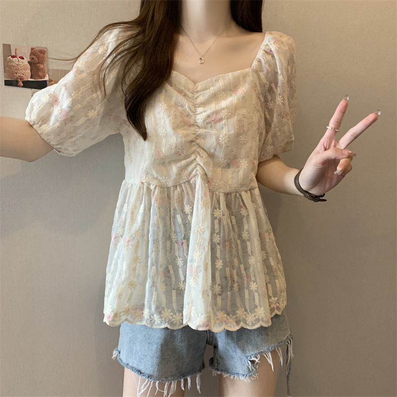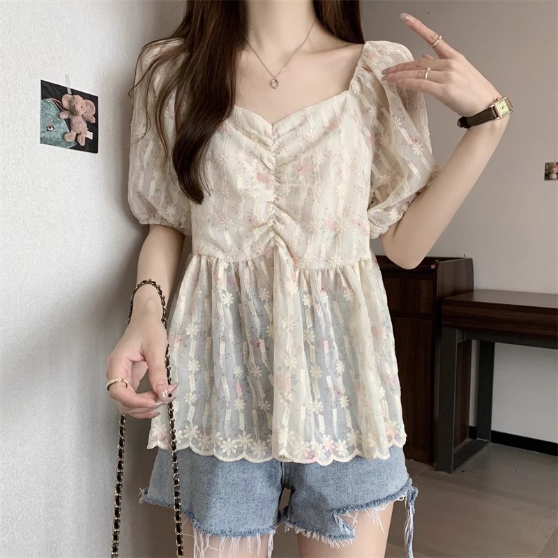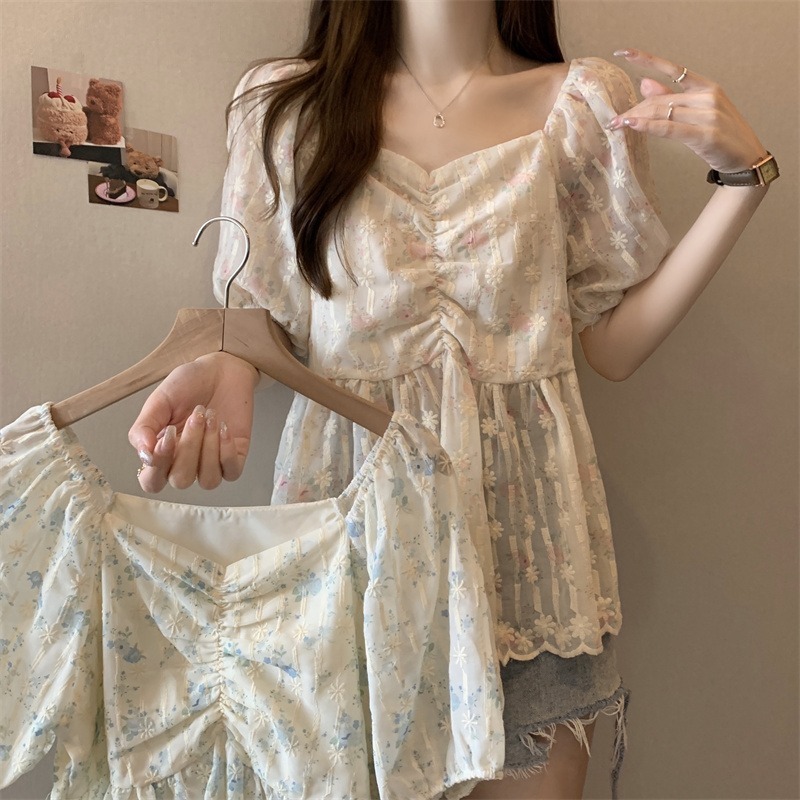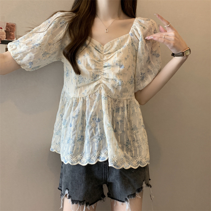 플러스 사이즈 여성 여름 신작 꽃무늬 쉬폰 셔츠 뚱뚱한 mm 배를 커버하고 슬림하고 우아한 반팔 달콤한 살을 숨기는 탑스토어 가기