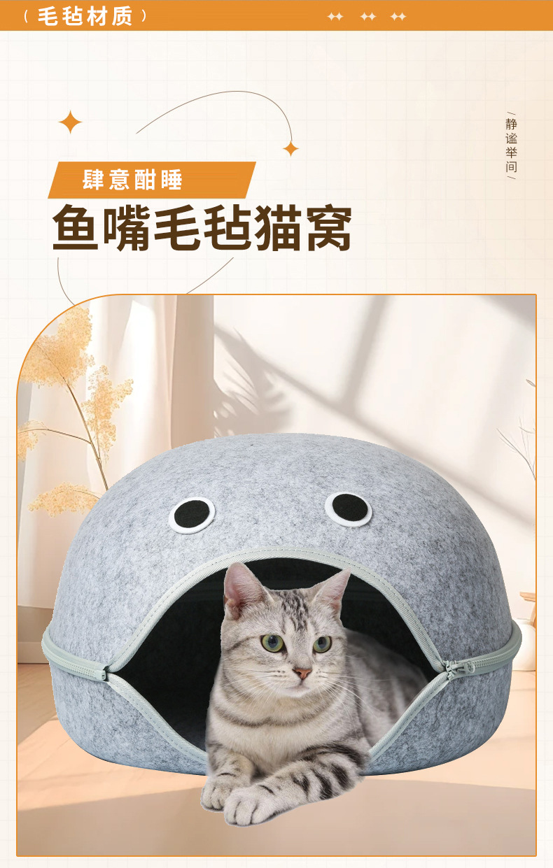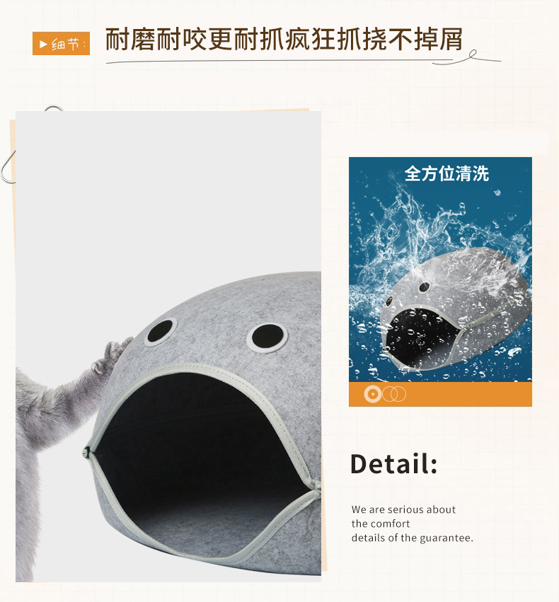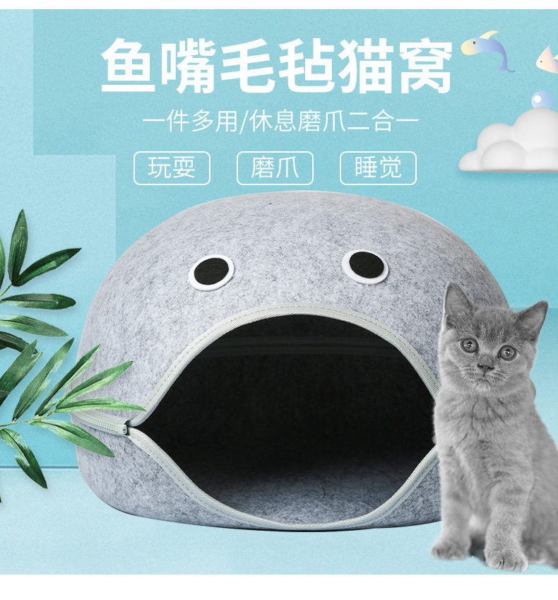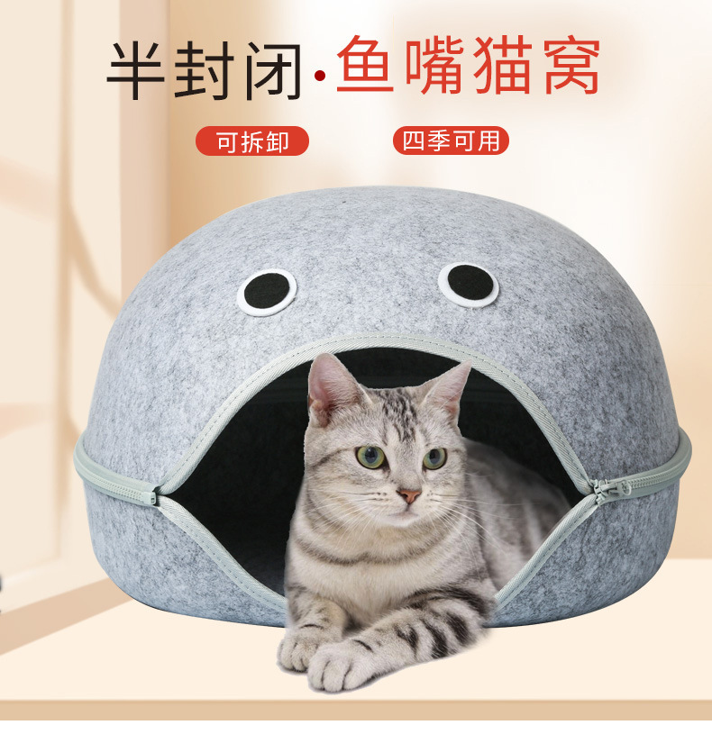 새로운 사계절 사용 가능한 펠트 고양이 둥지, 물고기 입 모양 디자인, 반밀폐형 펠트 둥지, 탈부착 및 세척 가능한 고양이 집, 고양이 집스토어 가기