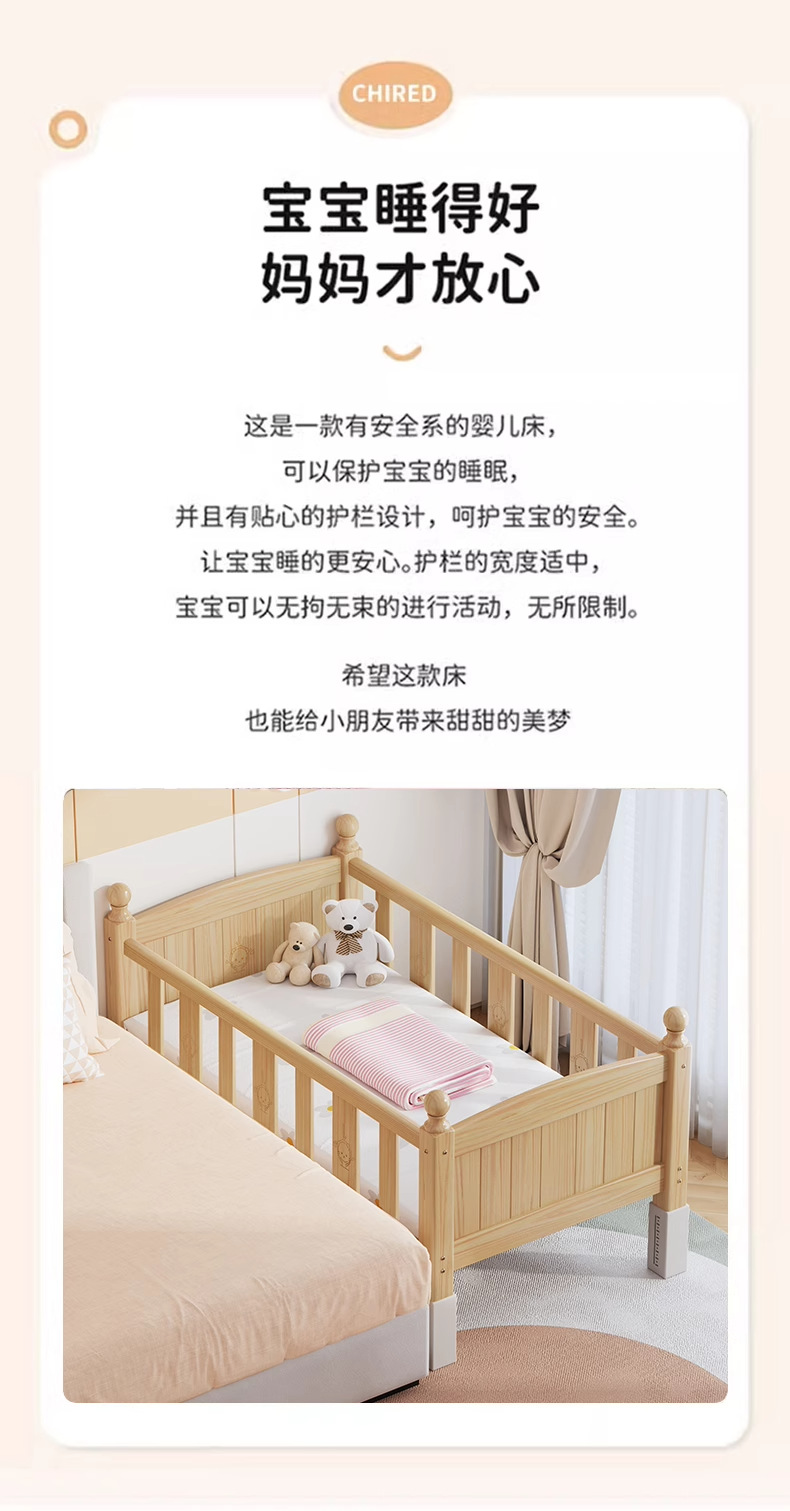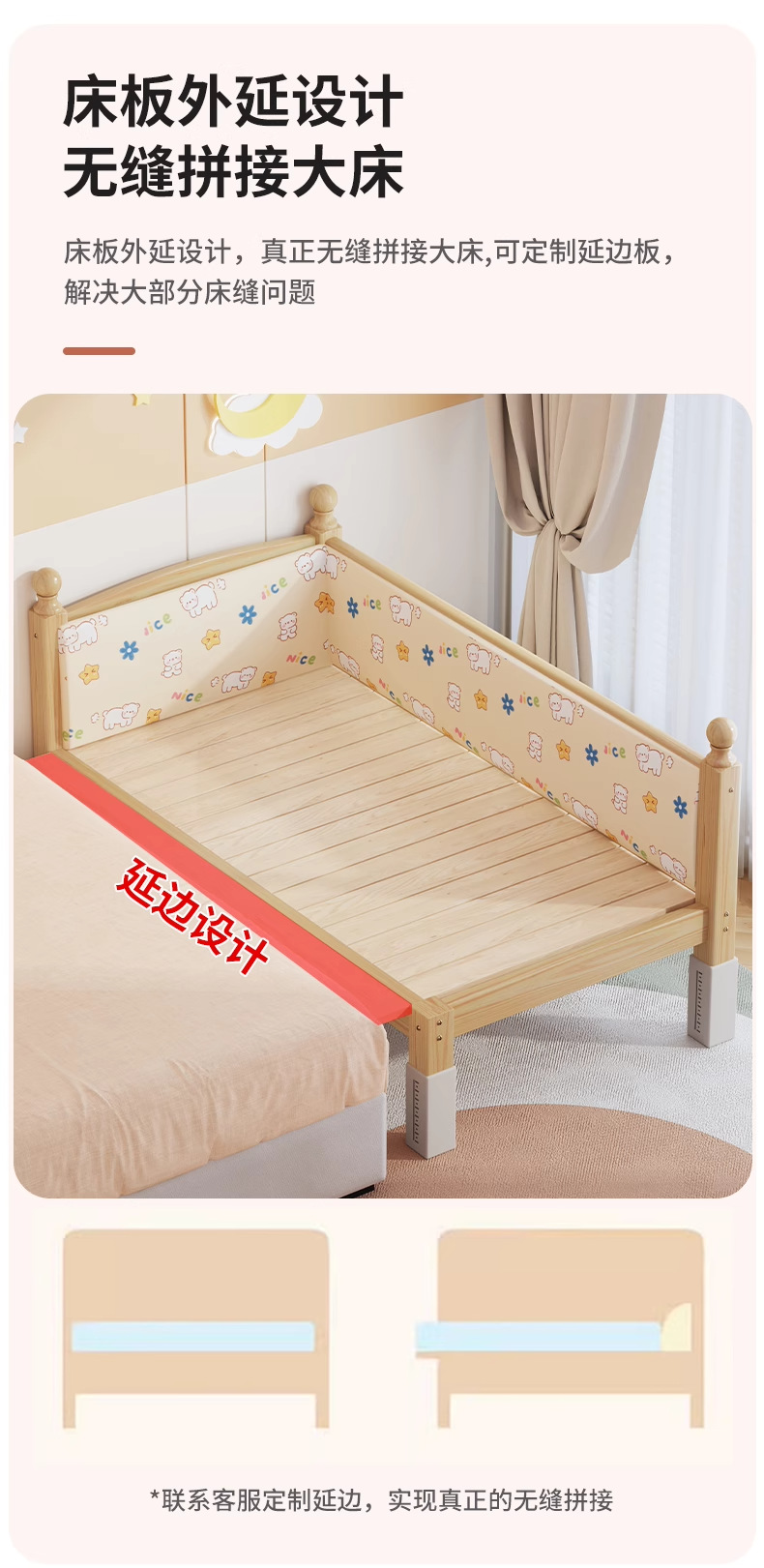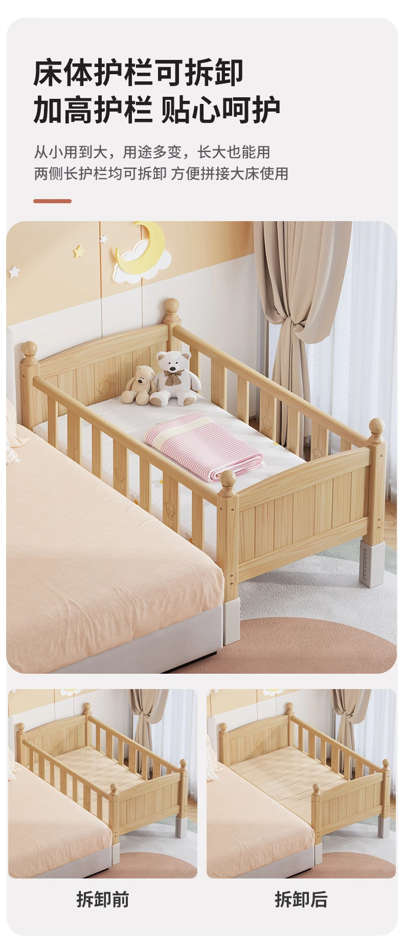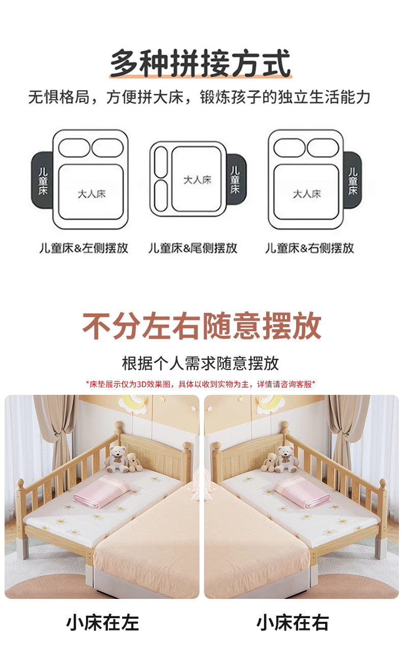 단단한 나무 어린이 침대, 가드레일이 있는 조절식 리프팅 다리, 침대 울타리, 유아용 침대, 대형 침대 접합, 싱글 사이드 침대 확장