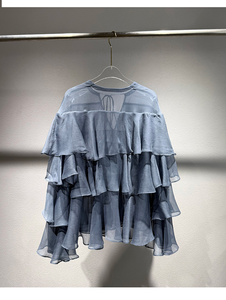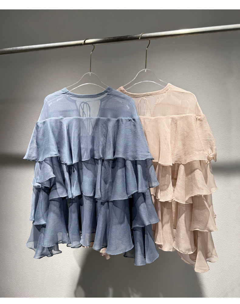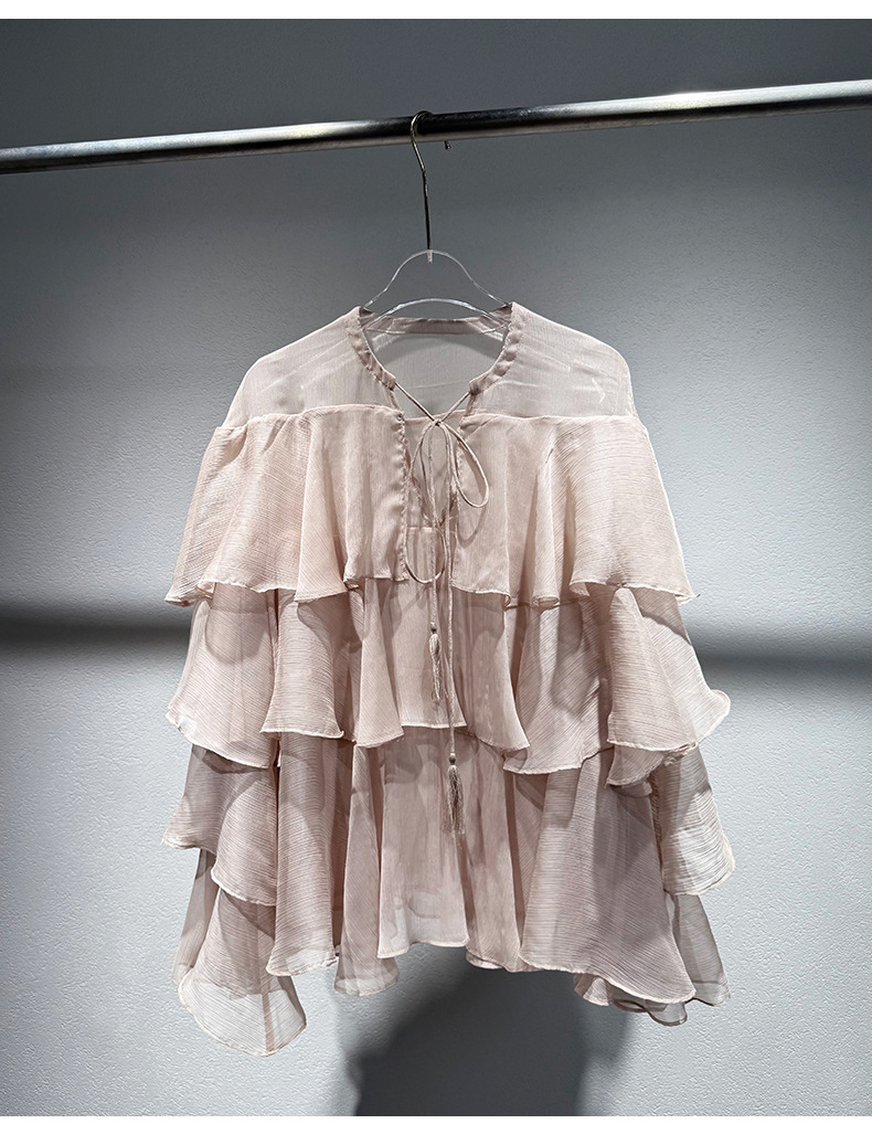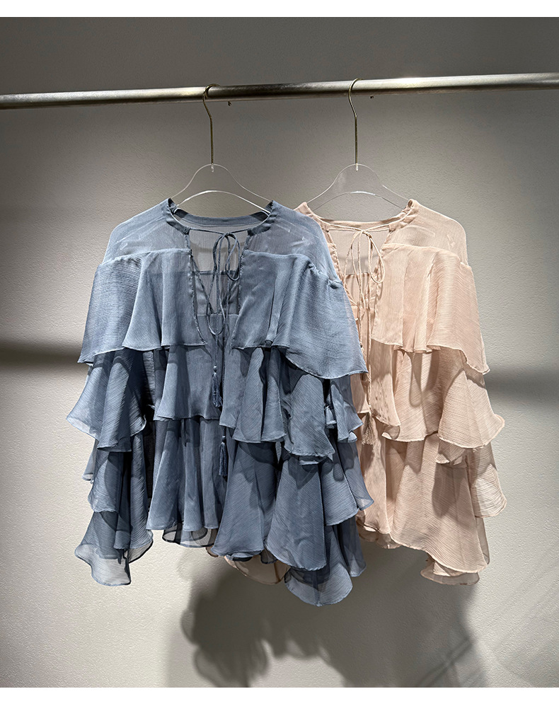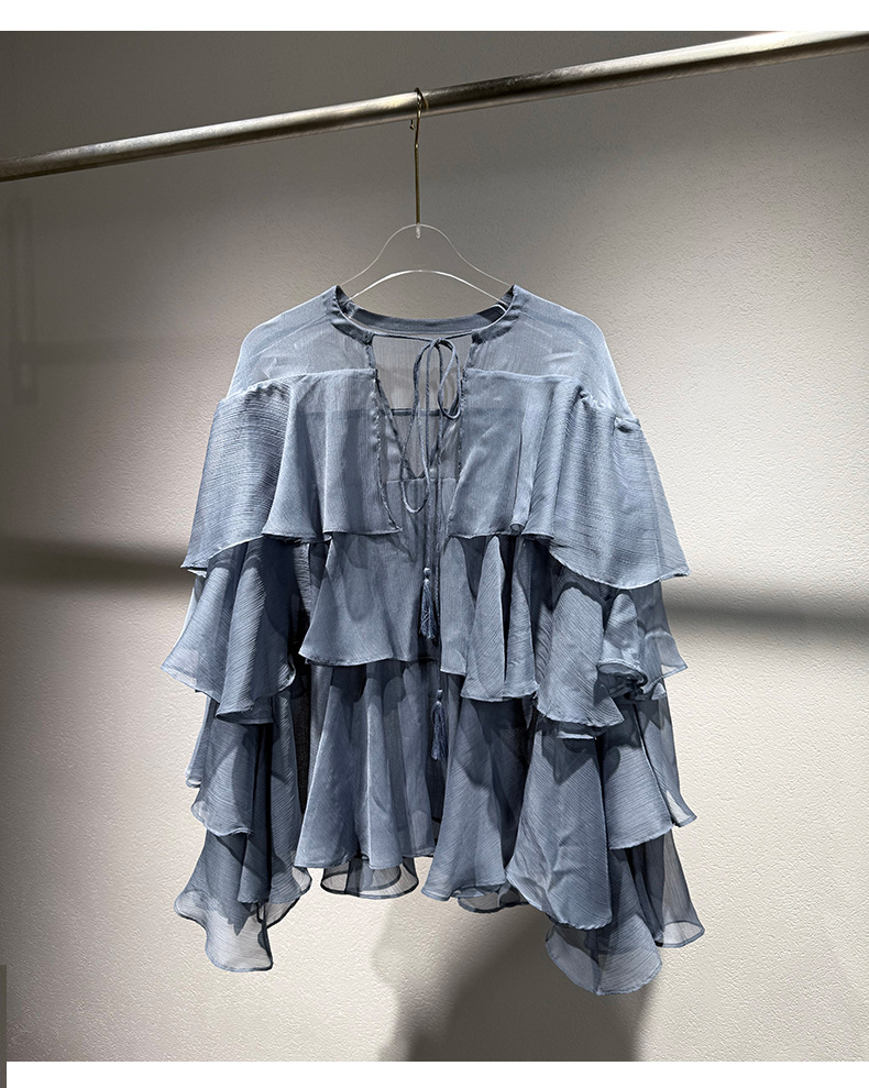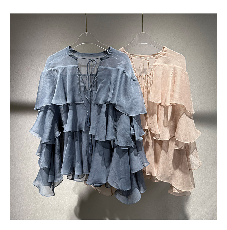 2025 여름 새로운 솔리드 컬러 프릴 레이스 업 스플 라이스 셔츠 루즈 피팅 시스루 긴 소매 탑 여성스토어 가기