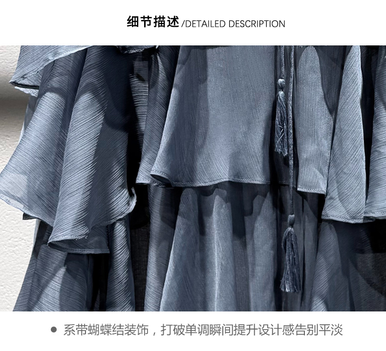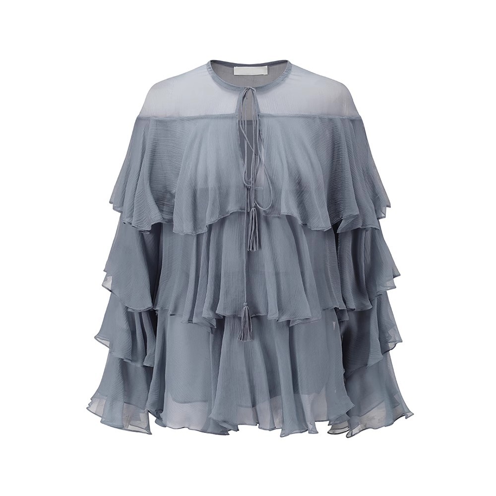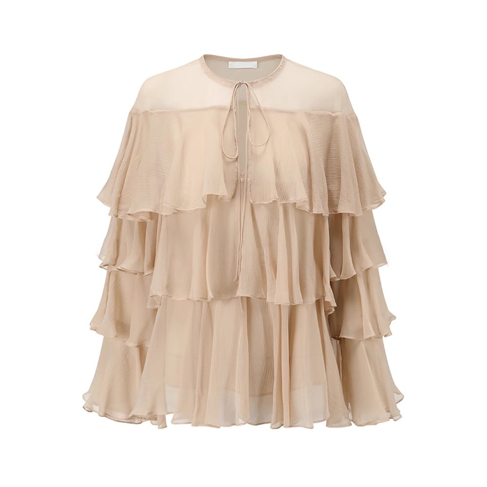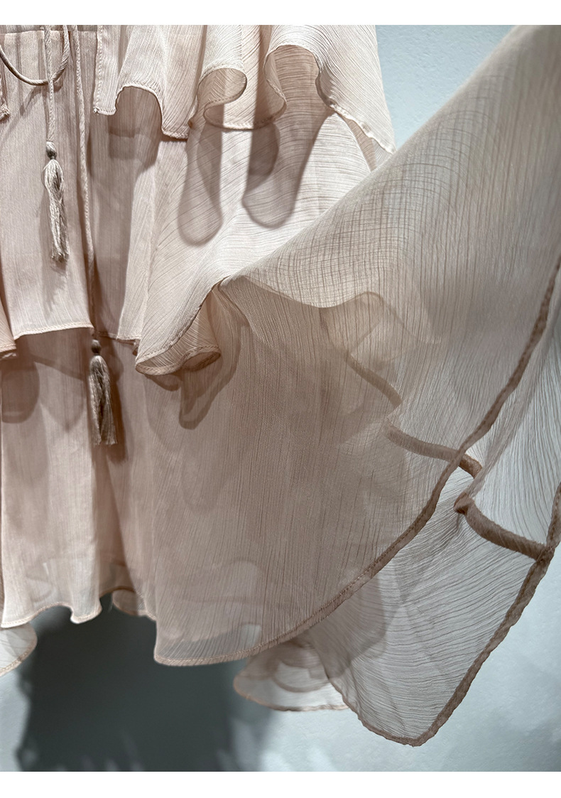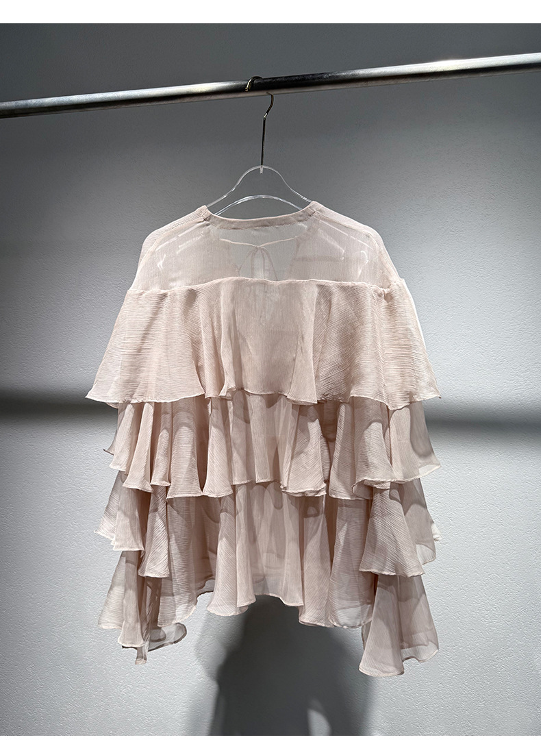 2025 여름 새로운 솔리드 컬러 프릴 레이스 업 스플 라이스 셔츠 루즈 피팅 시스루 긴 소매 탑 여성스토어 가기
