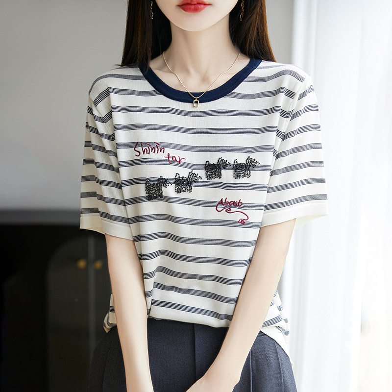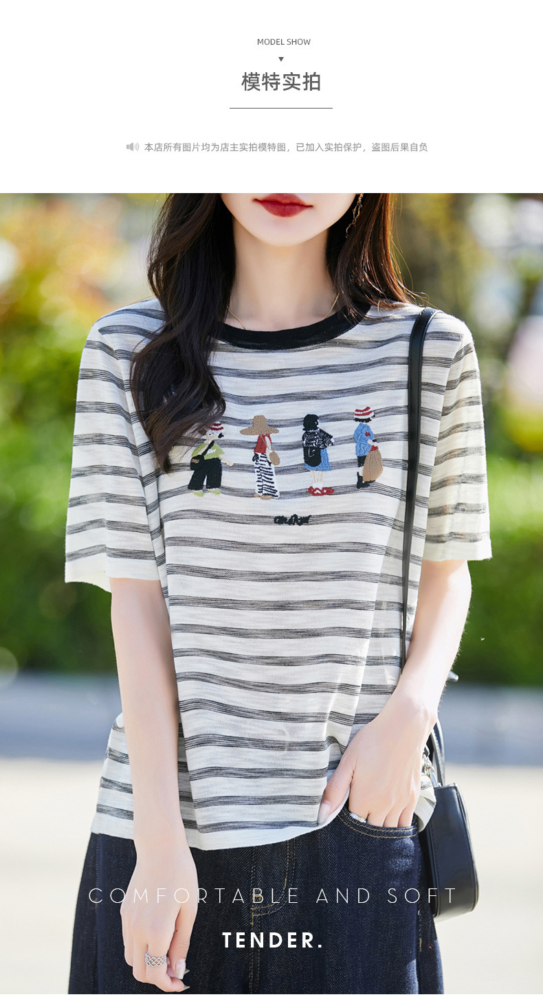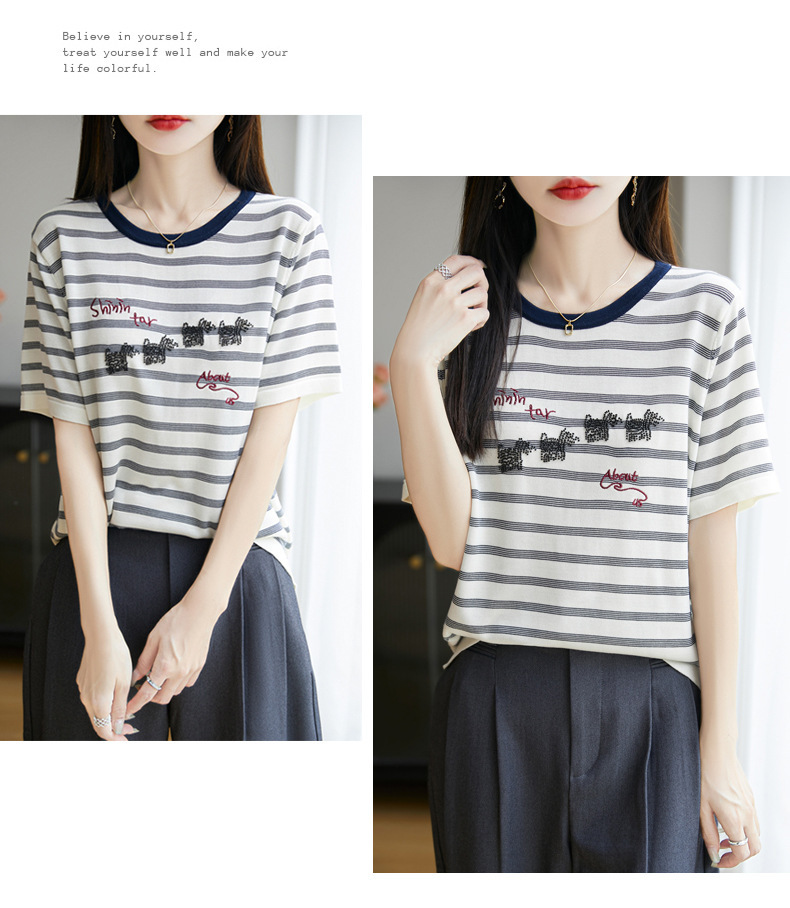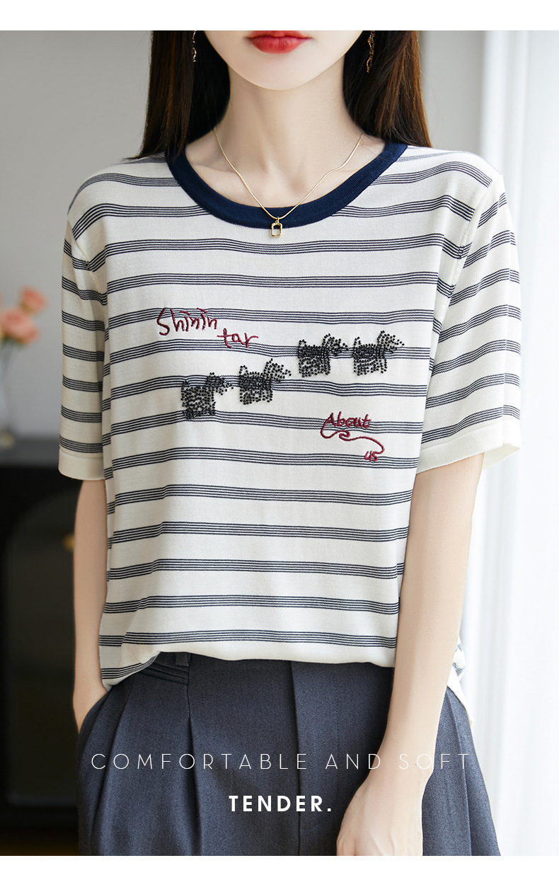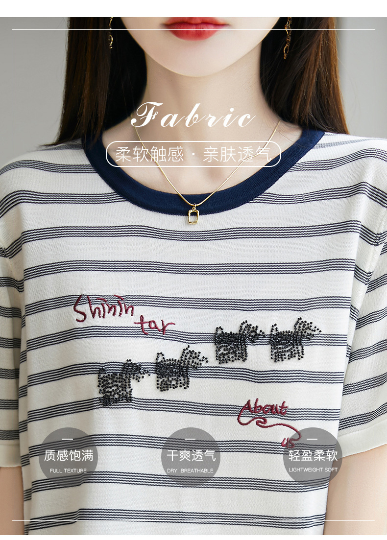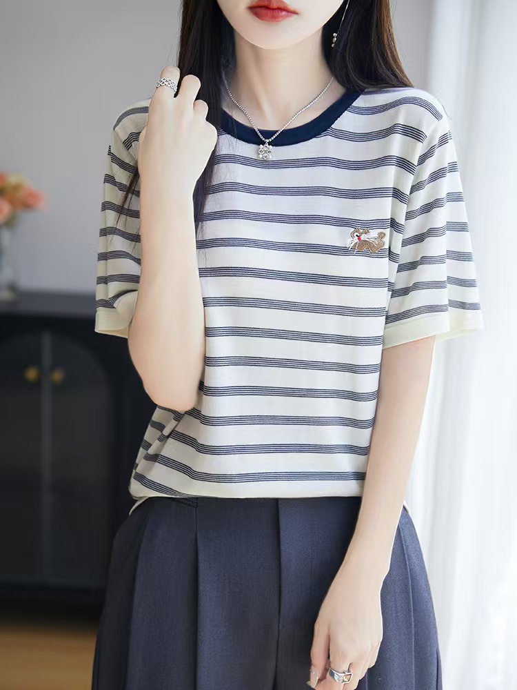 제조 업체 도매 2025 여름 새로운 Tencel 라운드 넥 스트라이프 스웨터 탑 캐주얼 반팔 티셔츠 여성스토어 가기