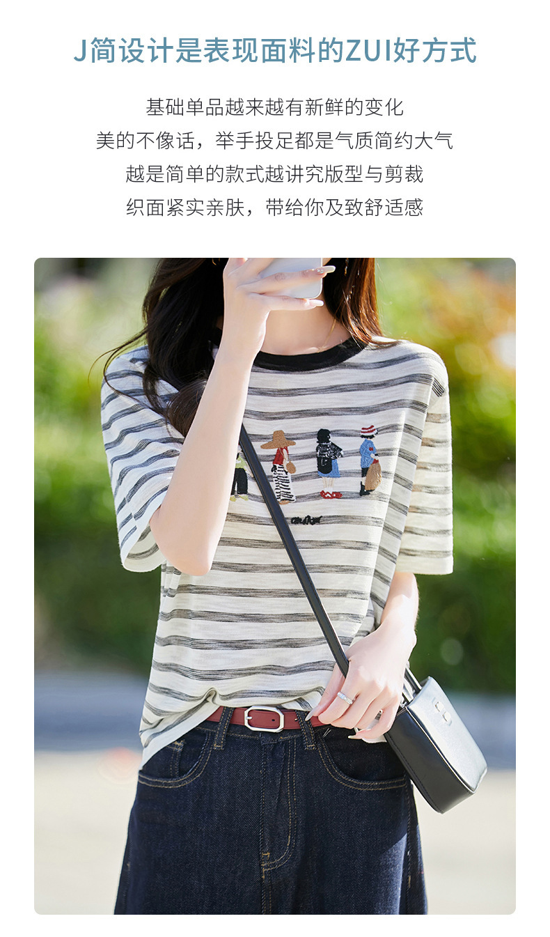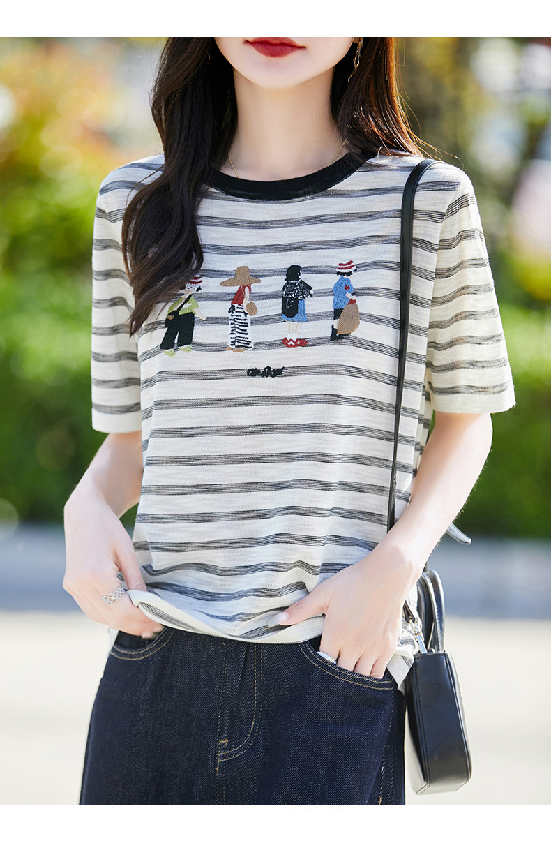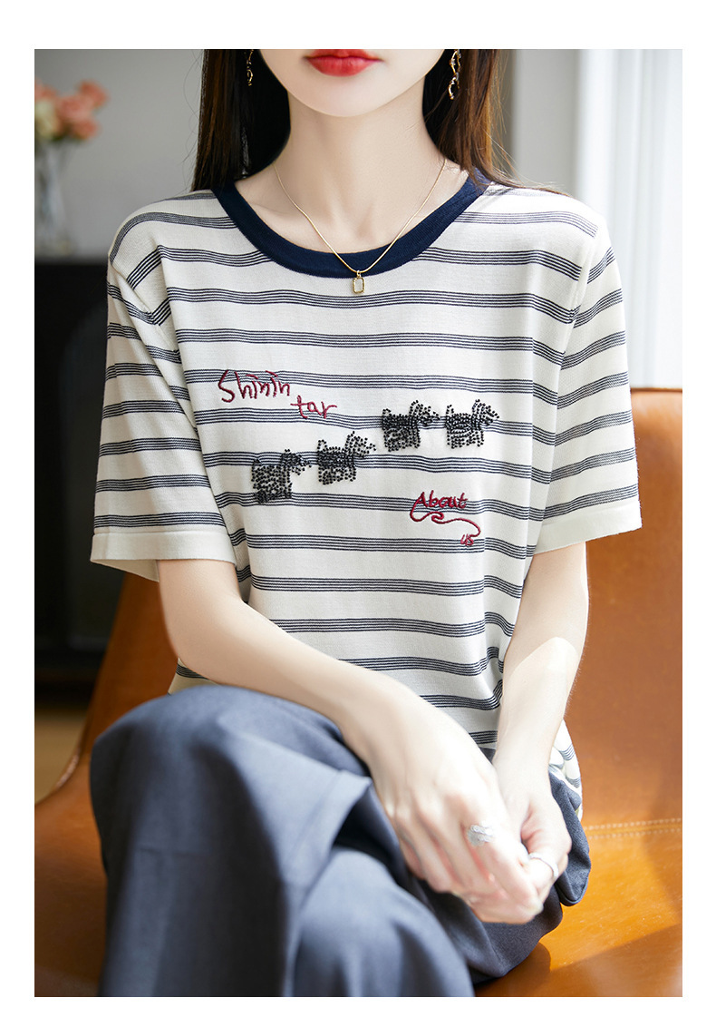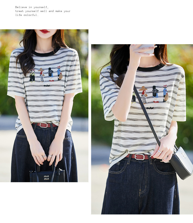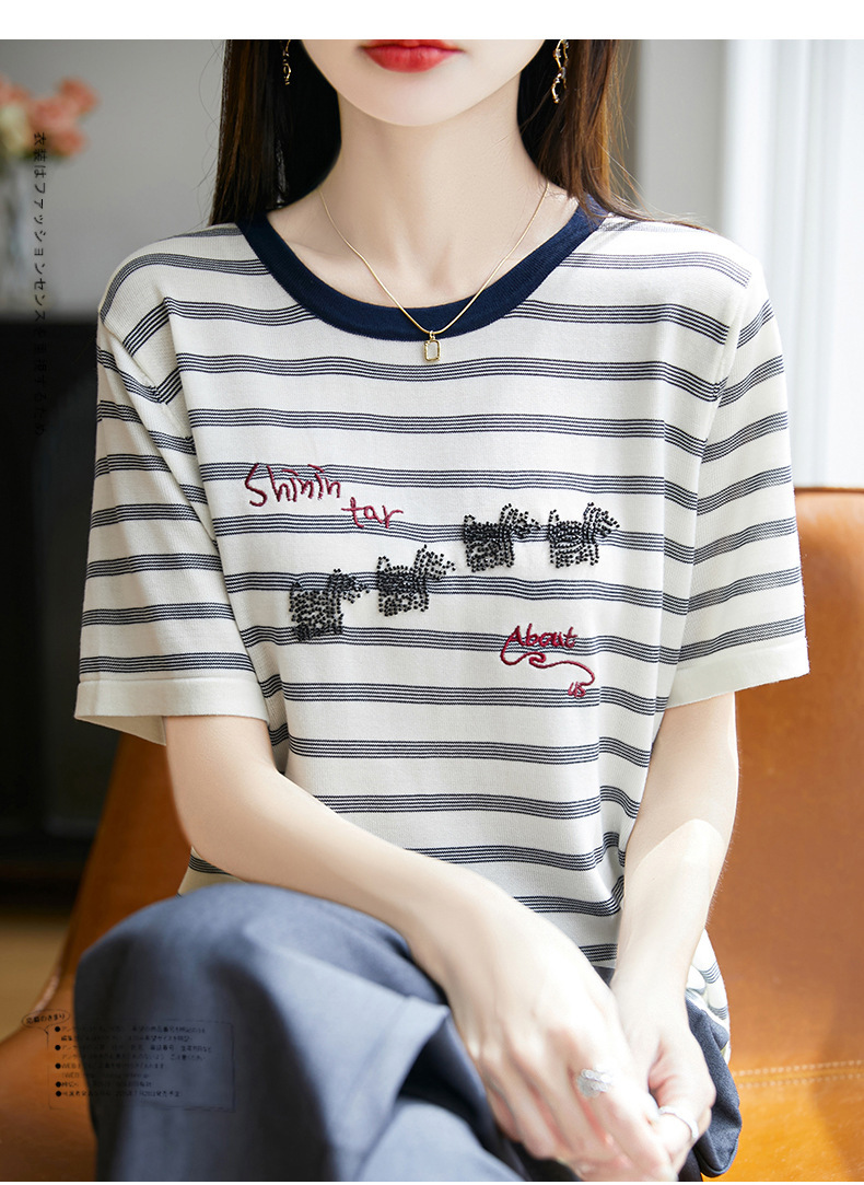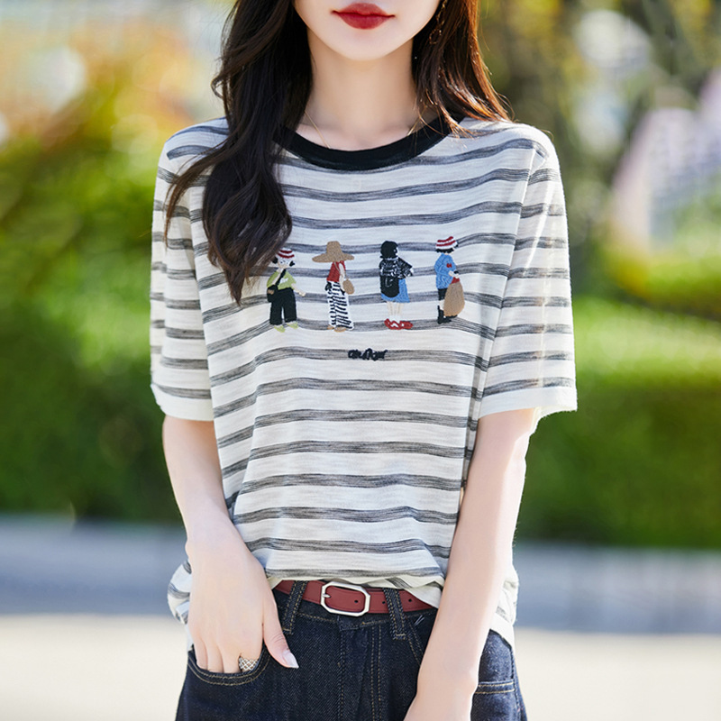 제조 업체 도매 2025 여름 새로운 Tencel 라운드 넥 스트라이프 스웨터 탑 캐주얼 반팔 티셔츠 여성스토어 가기