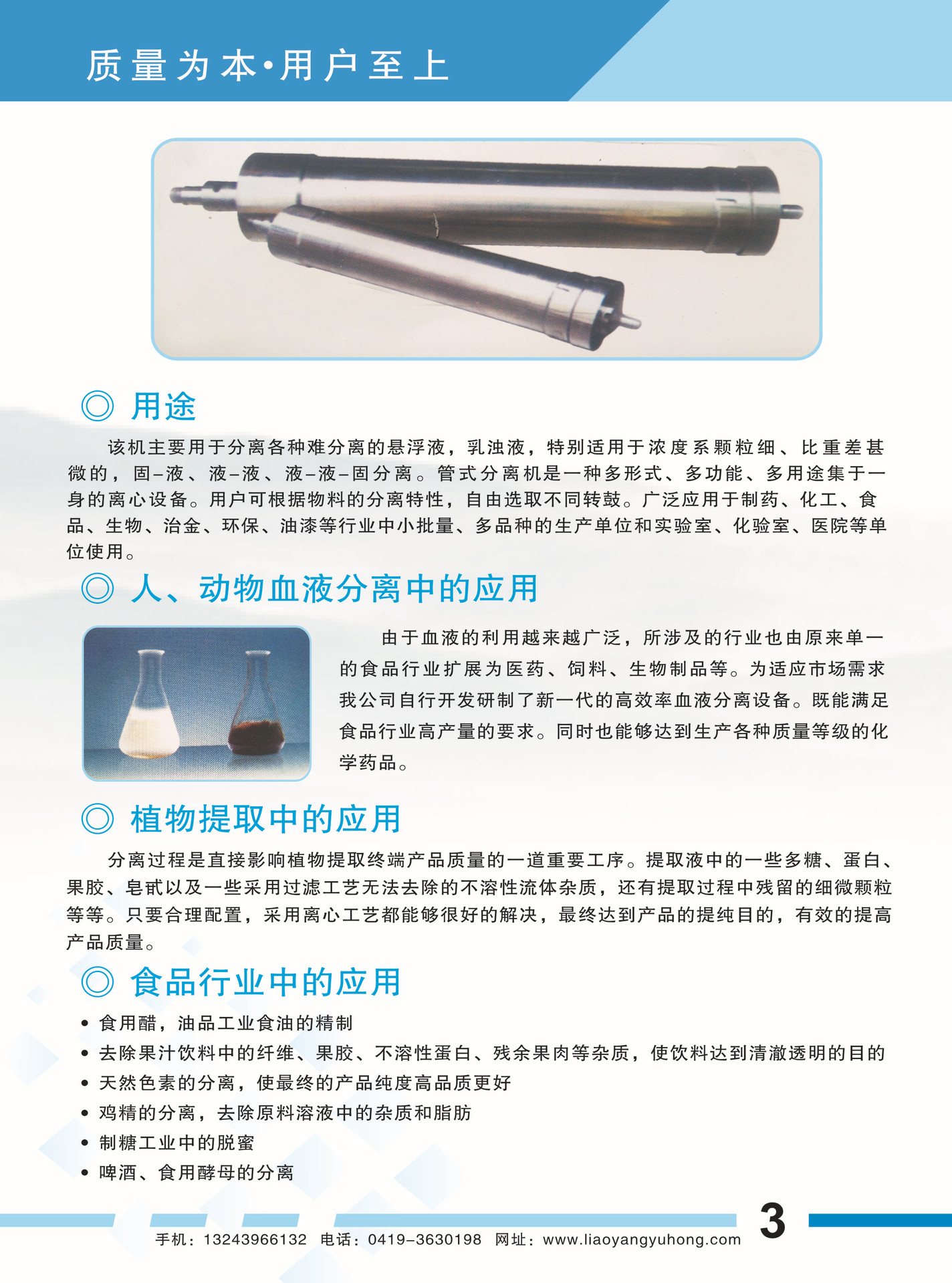 血液制品:可应用于人、鸡、猪、牛、羊等多种血液的血浆与血细胞的分离。可用于制备血浆(血球)蛋白粉、白蛋白、血红素、凝血酶、SOD等。