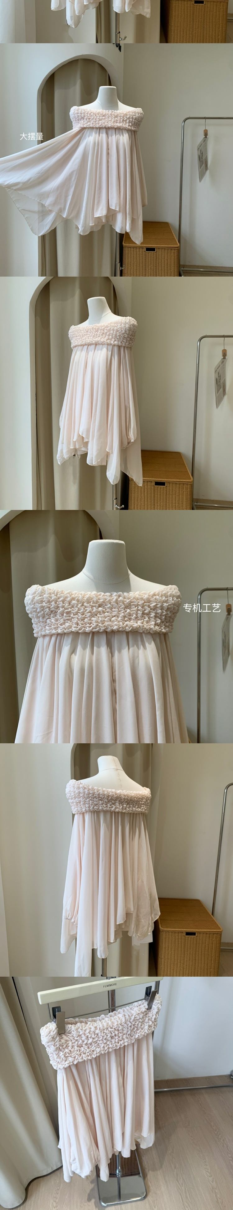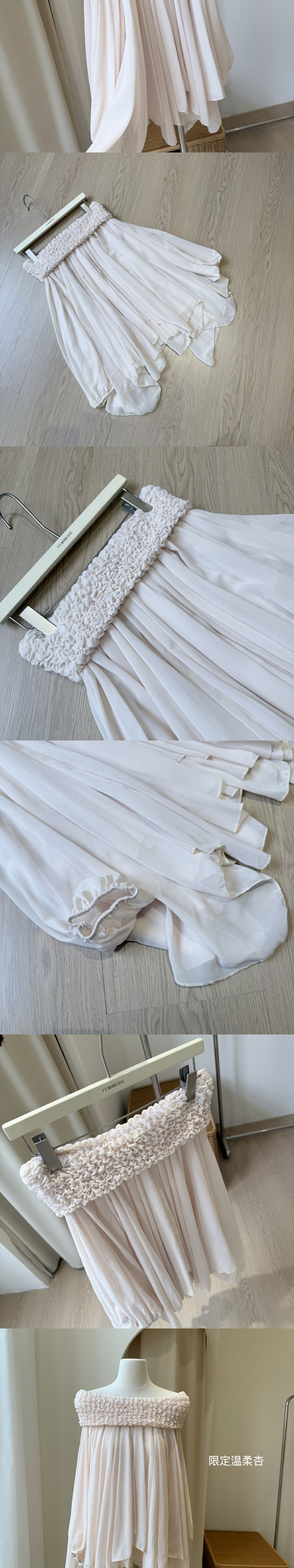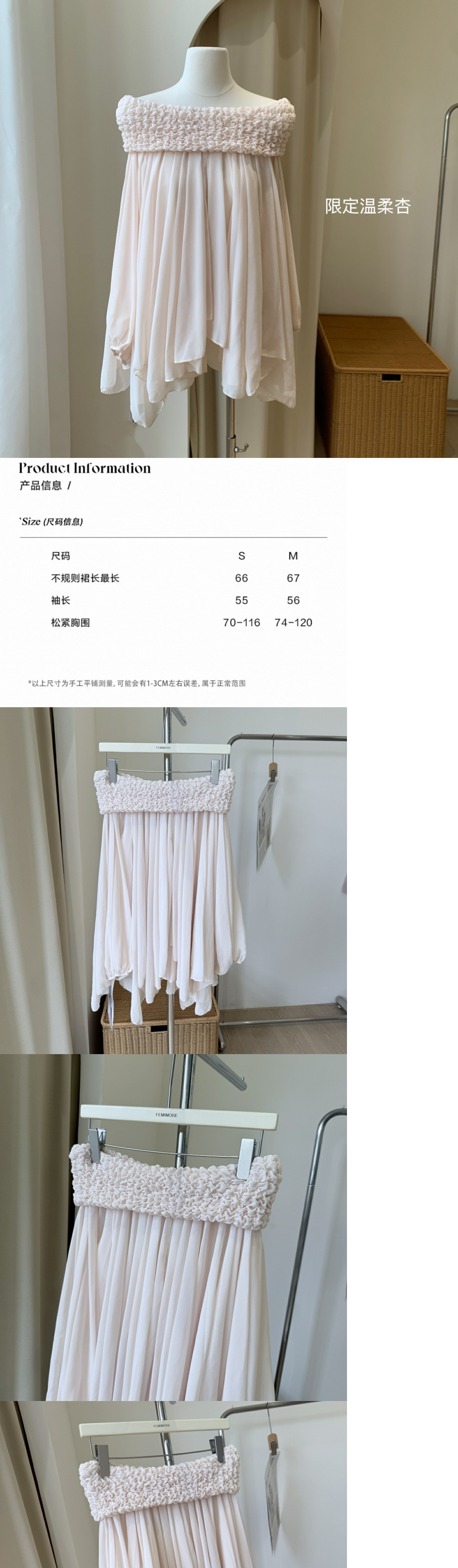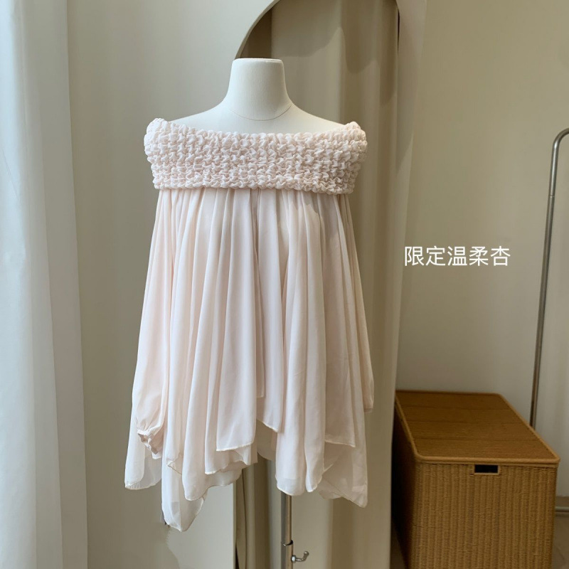 페어리탑, 슈퍼페어리, 스위트, 헤비듀티 플리츠 원라인 칼라, 오프숄더, 퓨어 프렌치 퍼프슬리브, 불규칙 쉬폰 셔츠