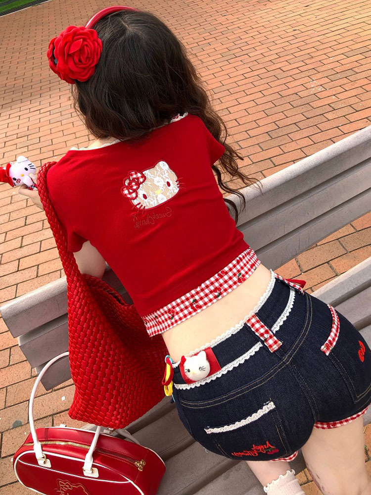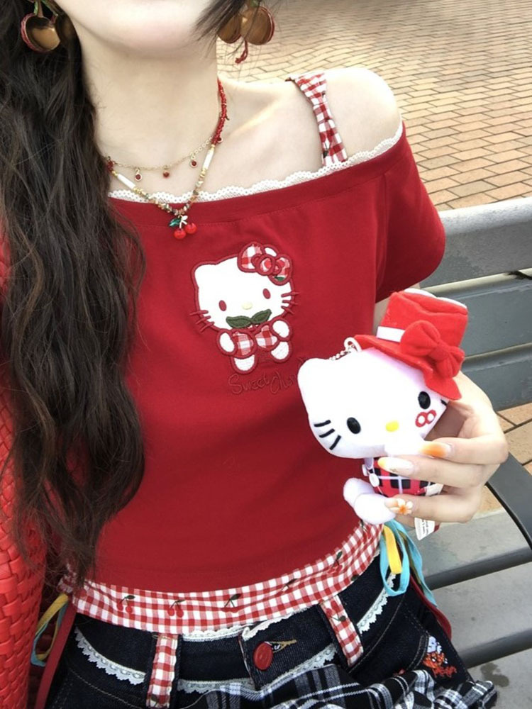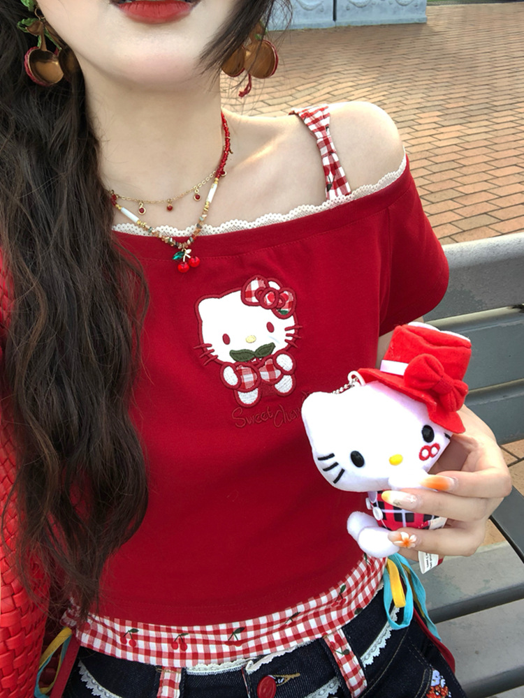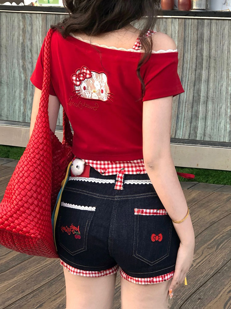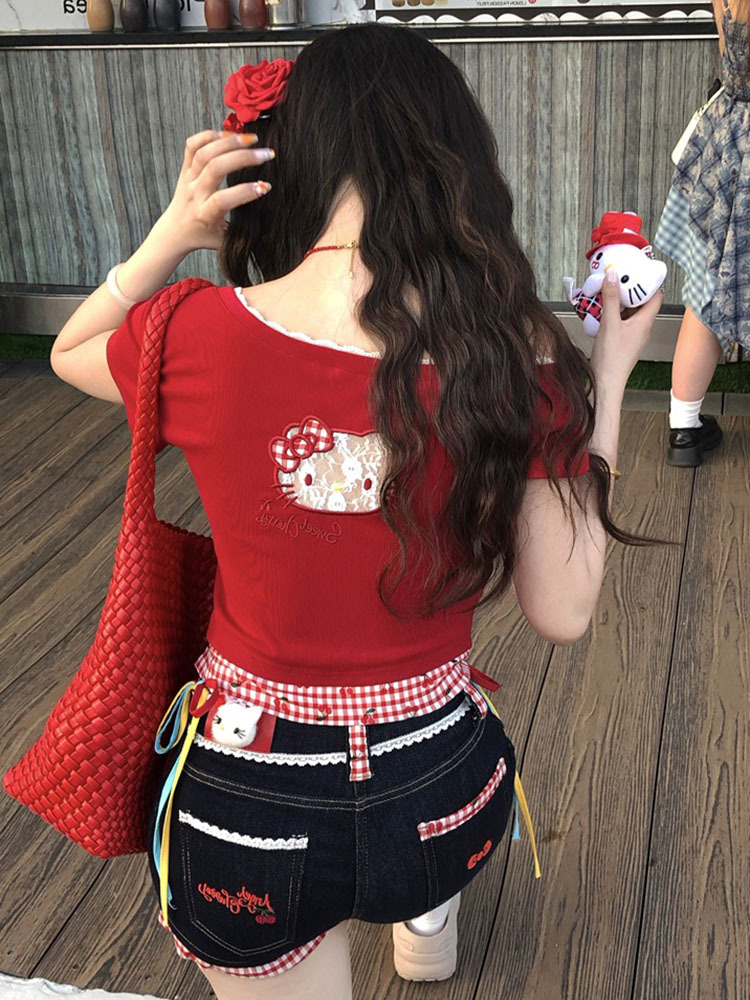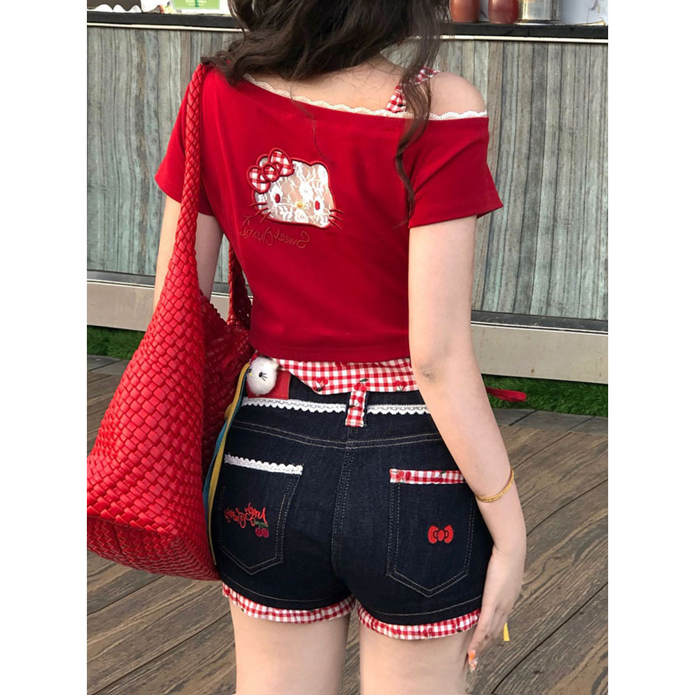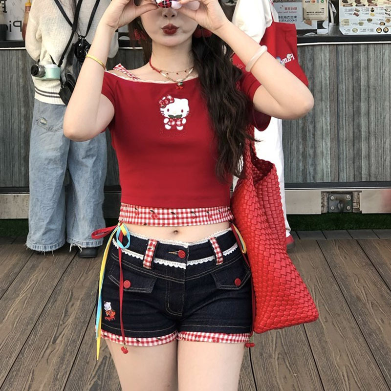 키티 머리! Pure Desire Hot Girl Bow Slanted Shoulder Plaid Splicing Hollow Design 여성용 반팔 티셔츠 탑스토어 가기