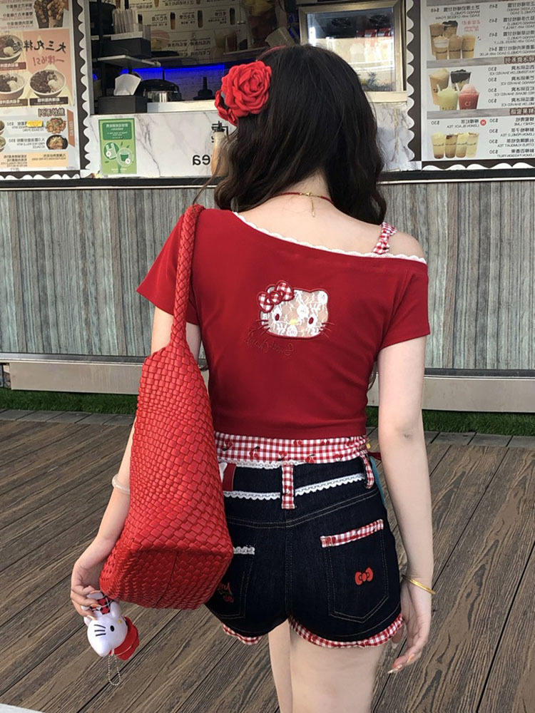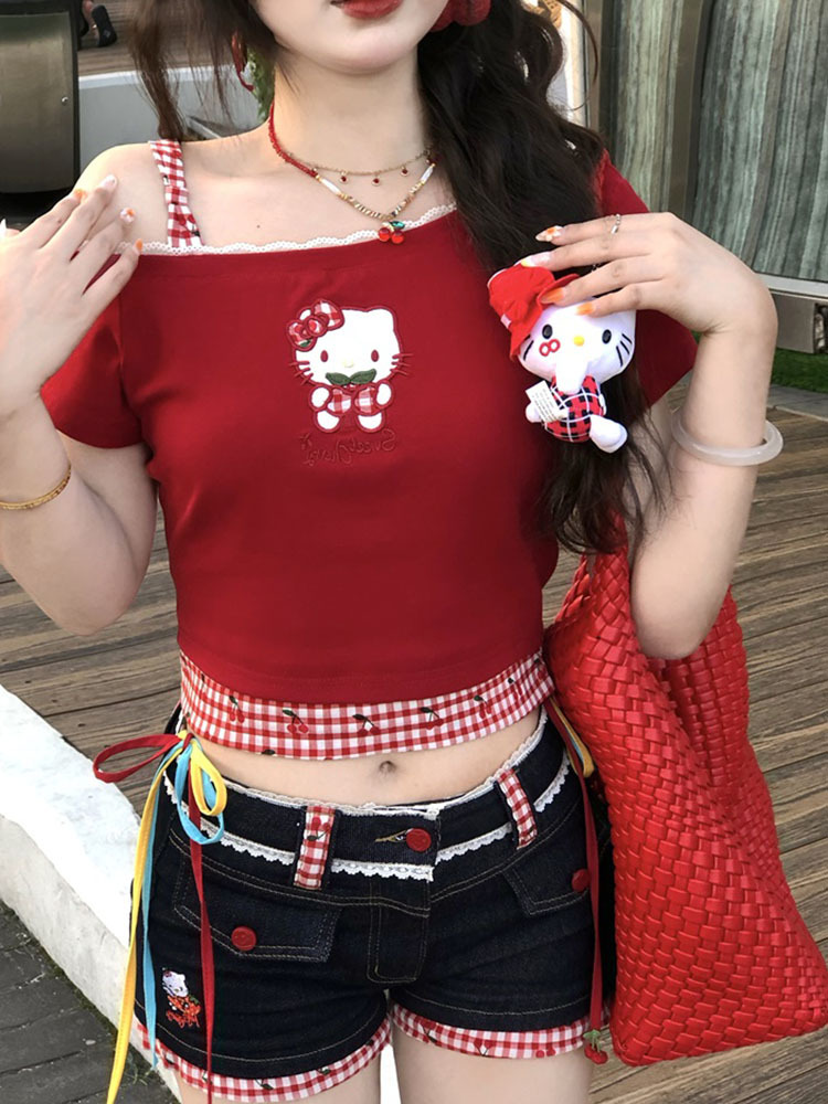 키티 머리! Pure Desire Hot Girl Bow Slanted Shoulder Plaid Splicing Hollow Design 여성용 반팔 티셔츠 탑