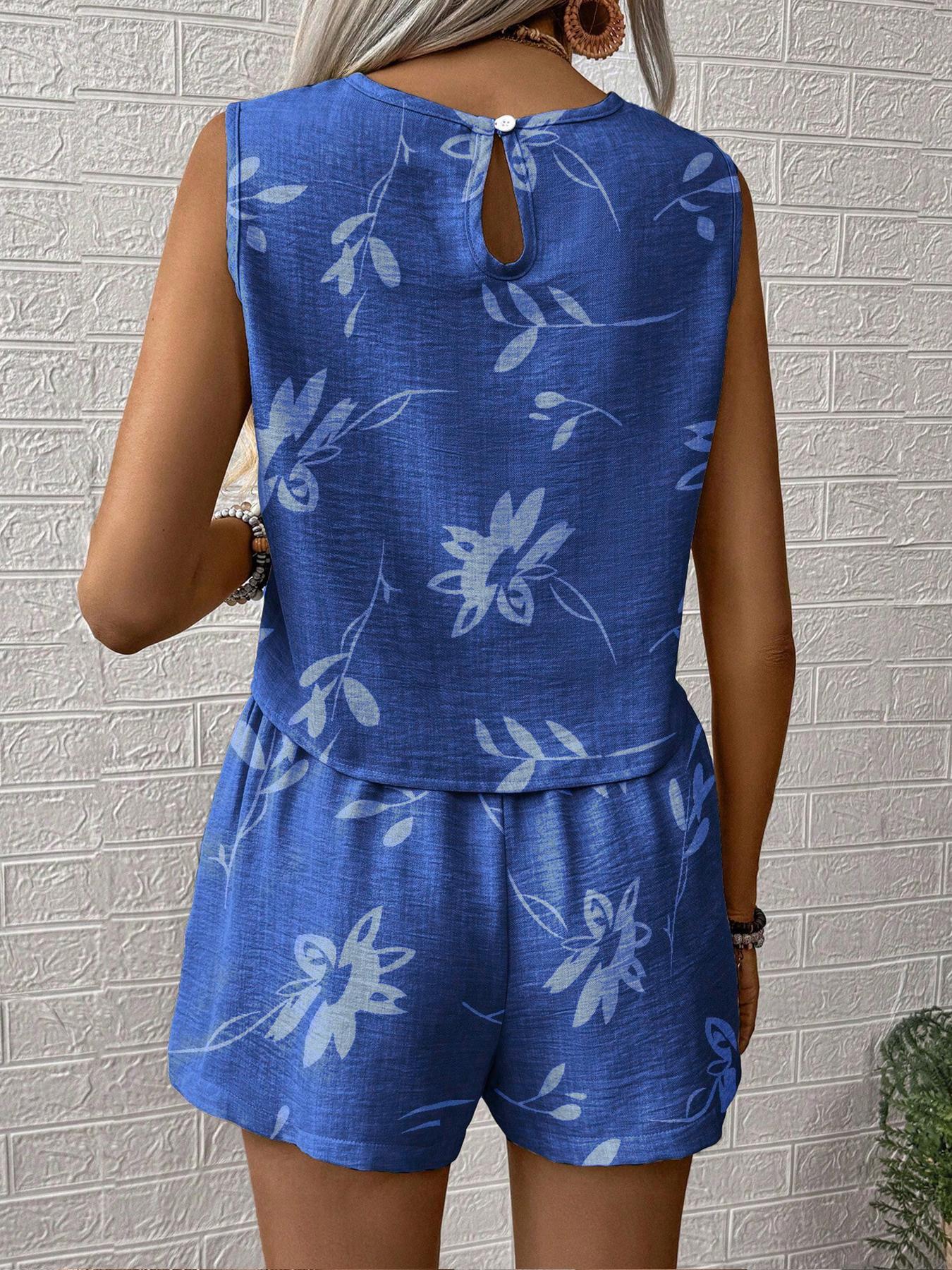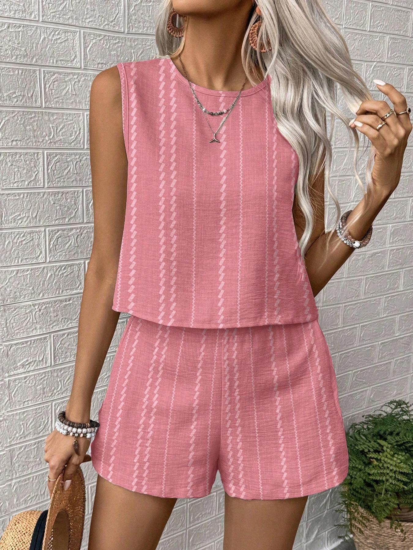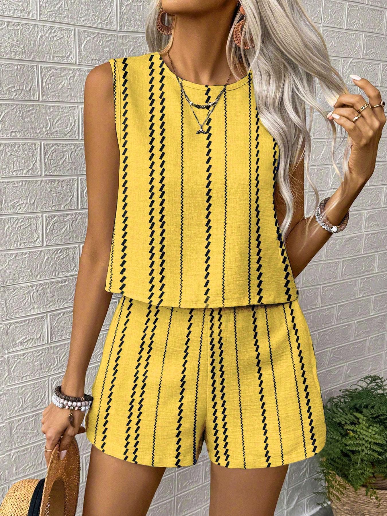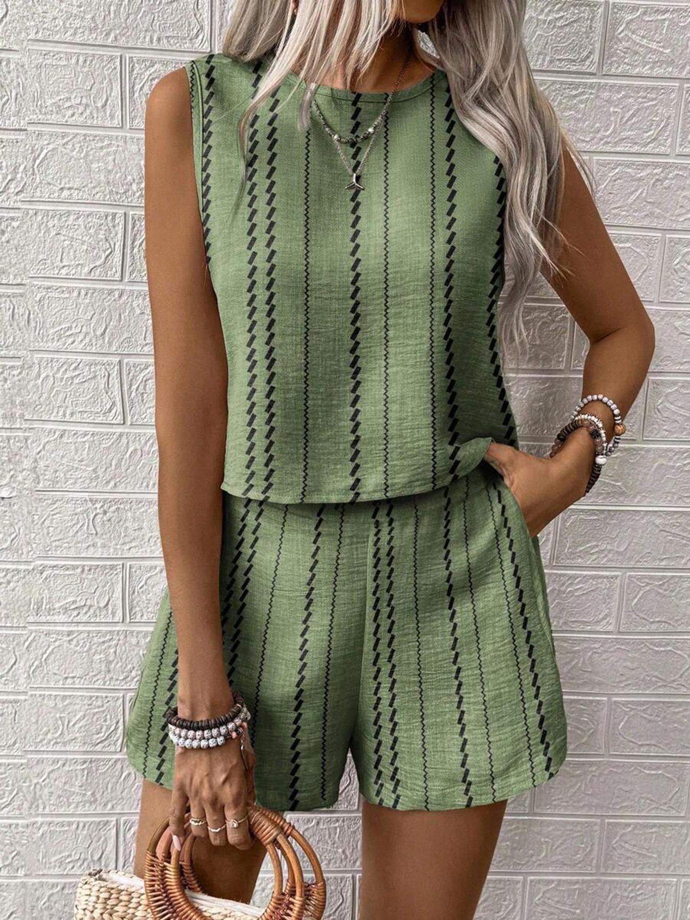 유럽과 미국의 아마존 국경 간 2025 여름 캐주얼 공예 줄무늬 프린트 민소매 조끼 반바지 투피스 슈트스토어 가기