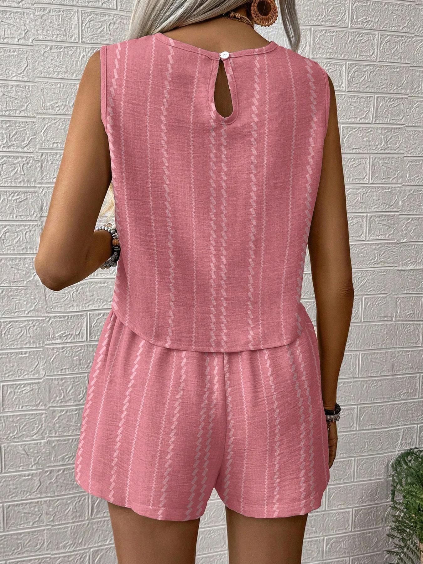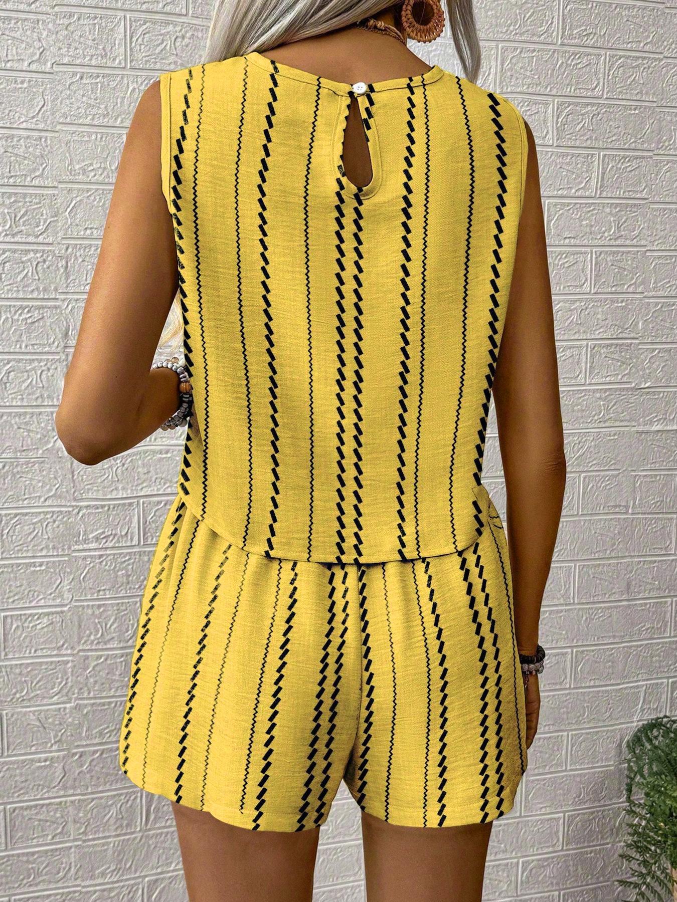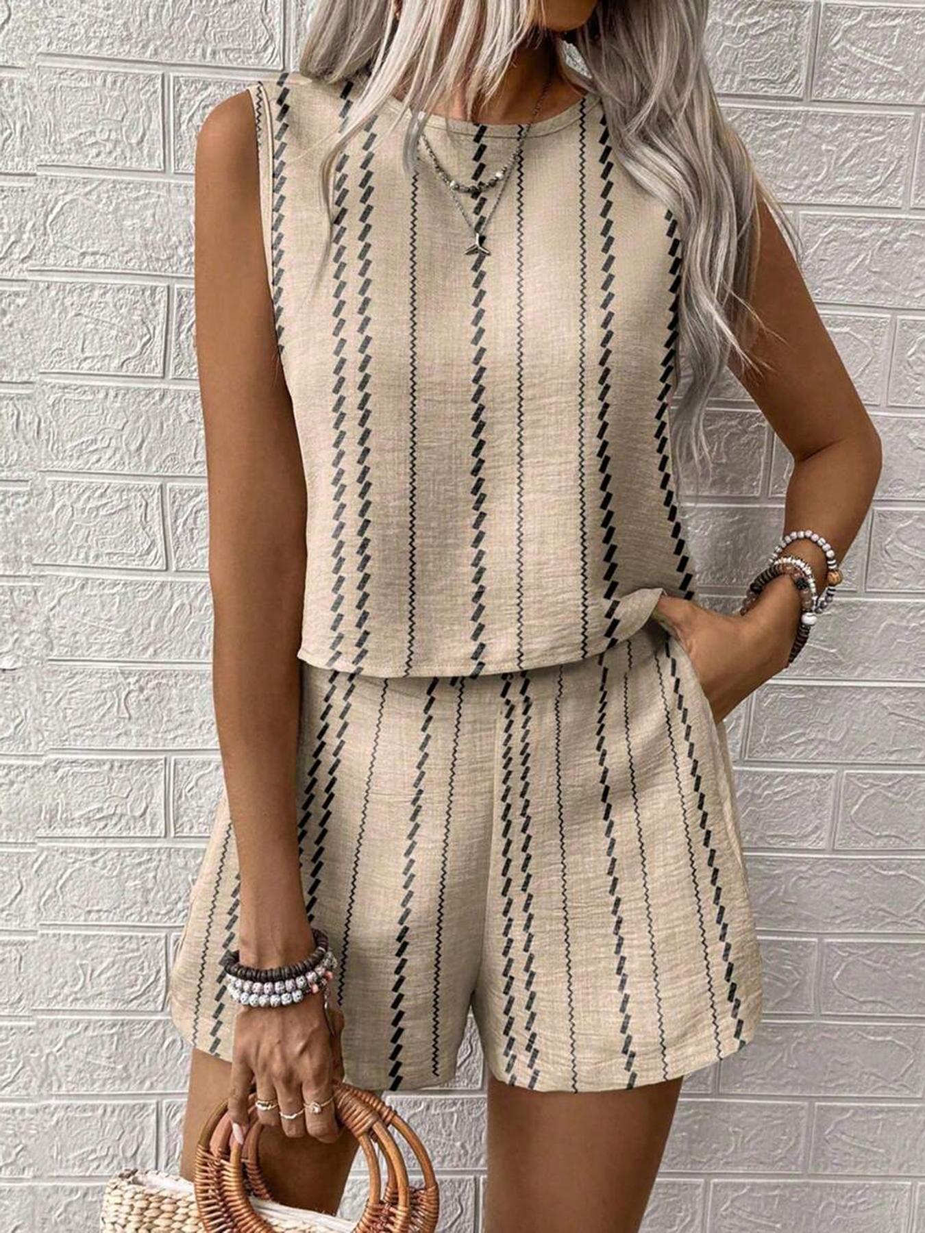 유럽과 미국의 아마존 국경 간 2025 여름 캐주얼 공예 줄무늬 프린트 민소매 조끼 반바지 투피스 슈트