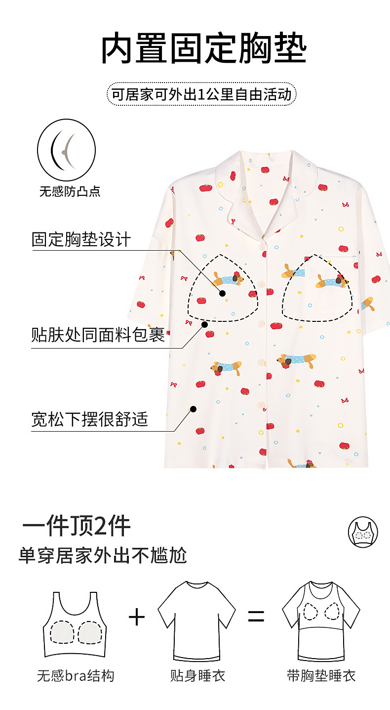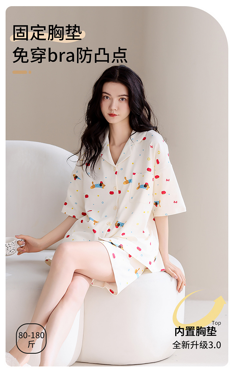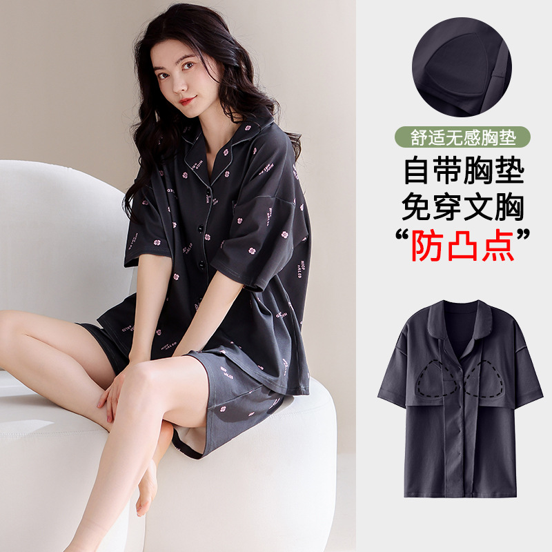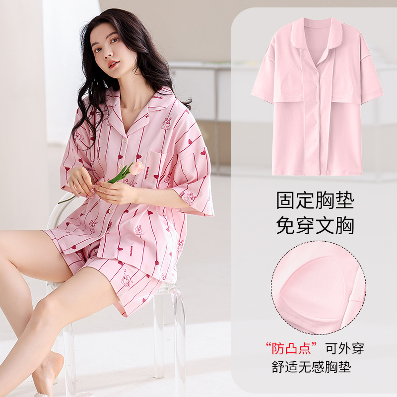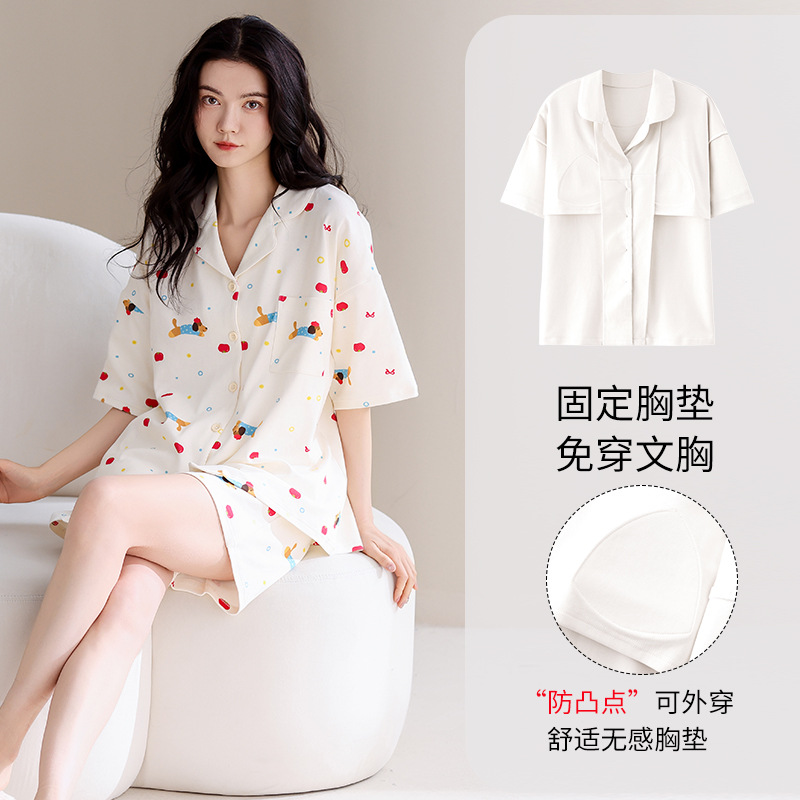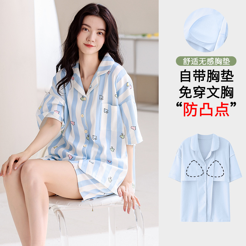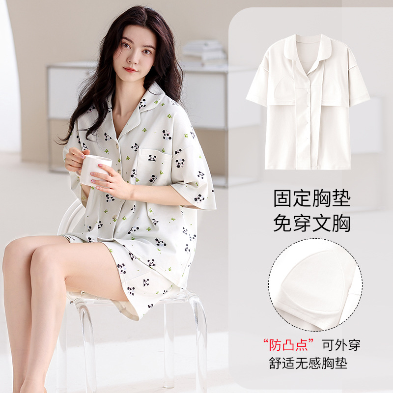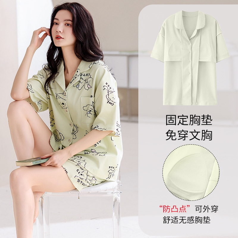 가슴 패드가 있는 여름 여성용 순면 잠옷 반팔 반바지 2025 새로운 스타일은 귀여운 가정복 세트 여름 외부에서 착용 가능스토어 가기