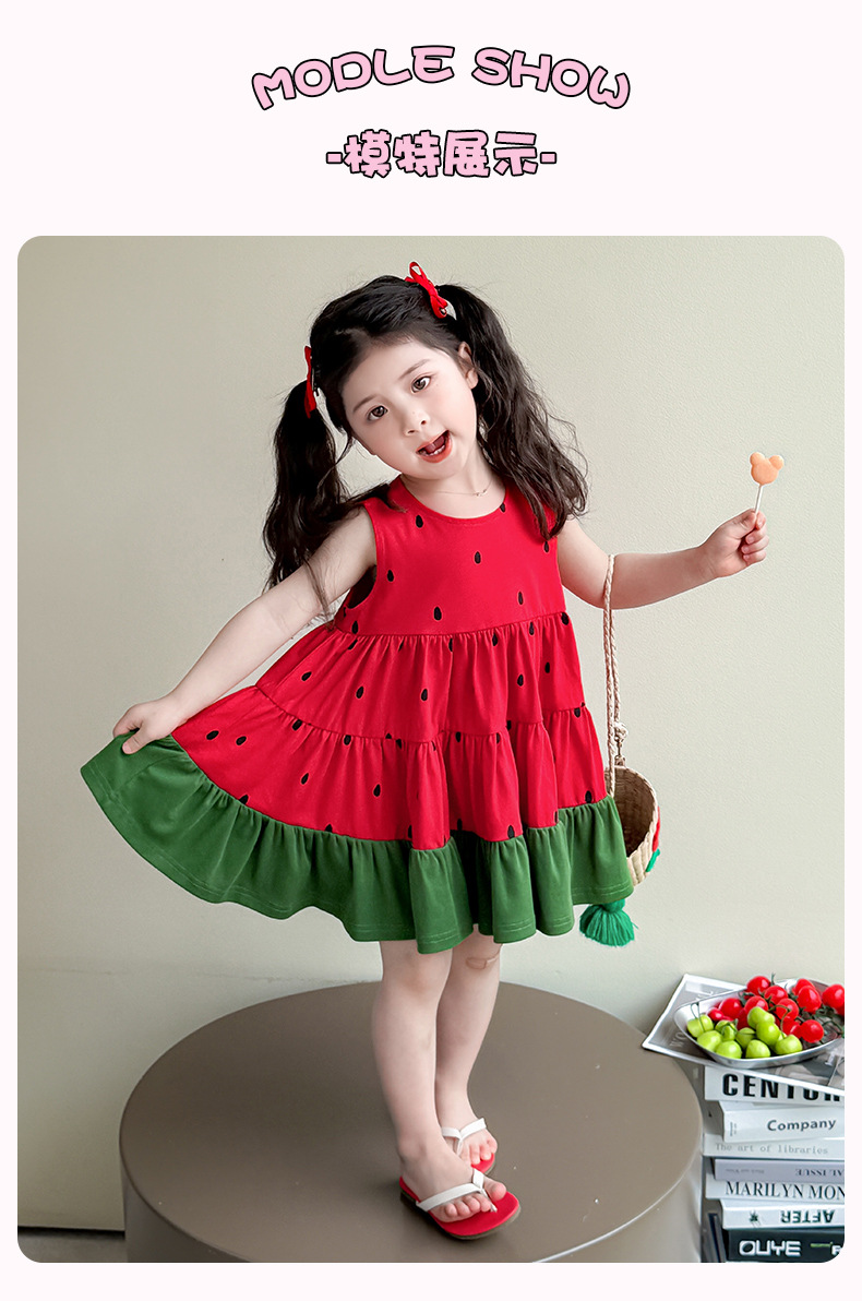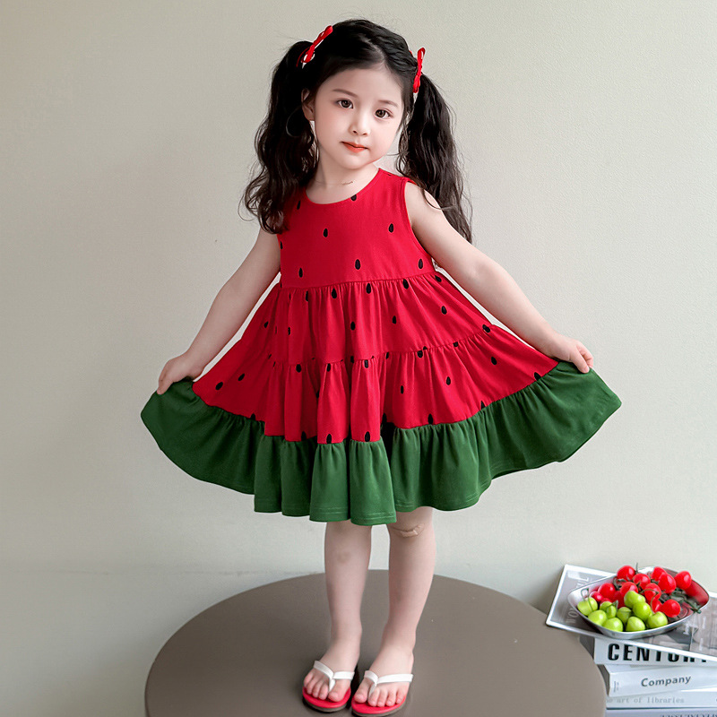 여자 조끼 드레스 여름 2025 새로운 유행 어린이 아기 소녀 수박 접합 공주 스커트스토어 가기