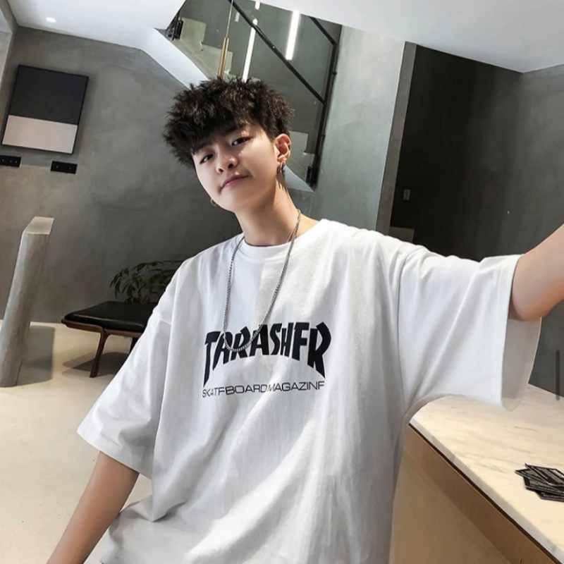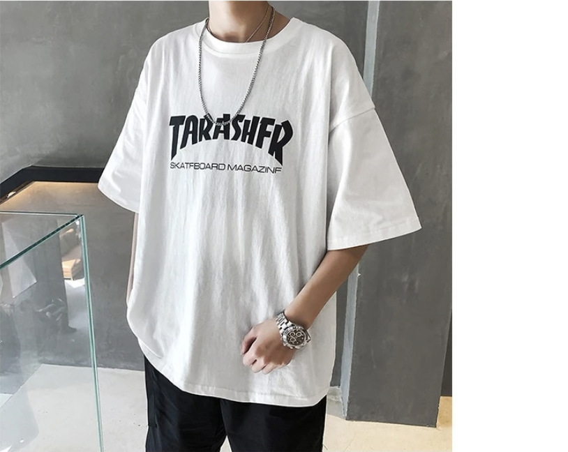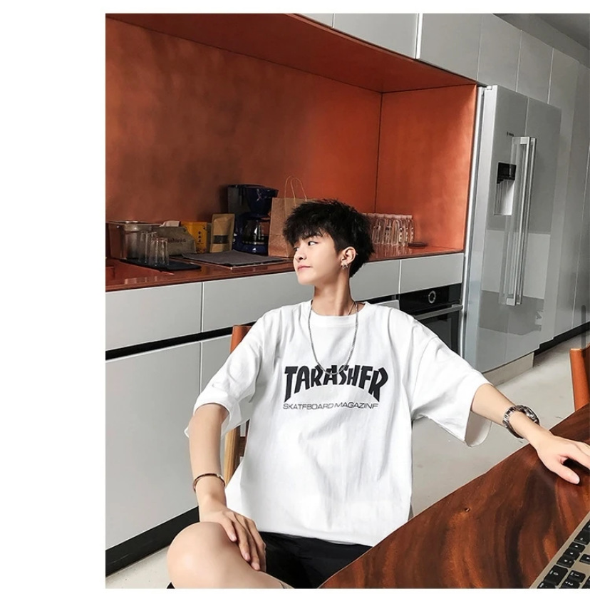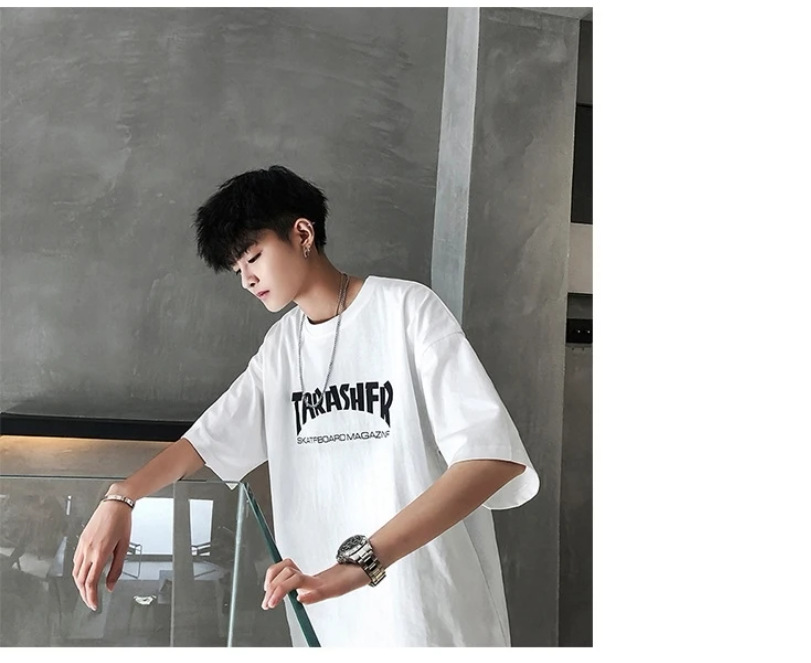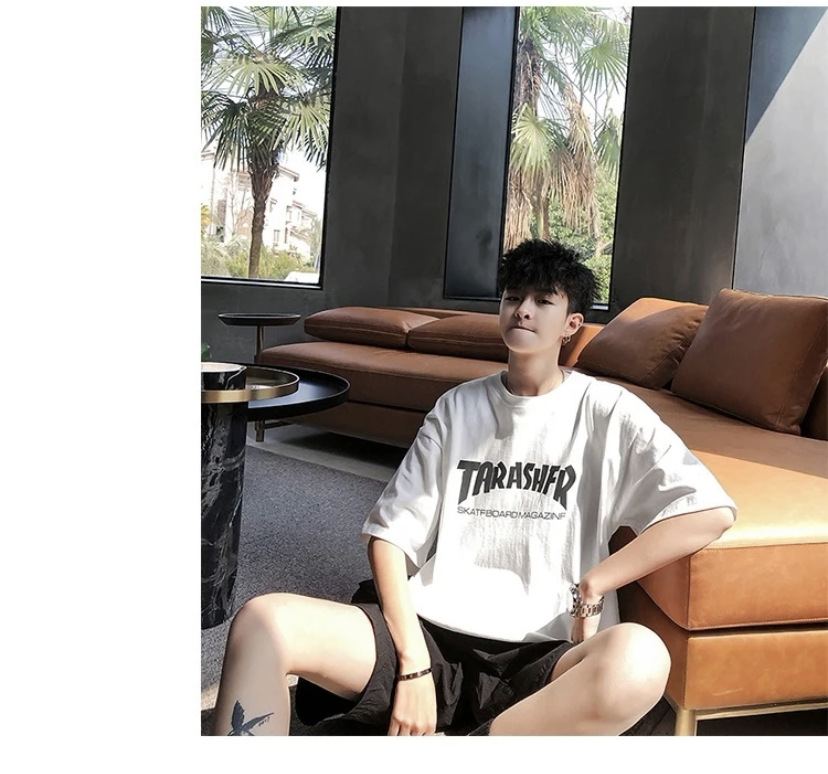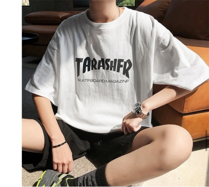 아메리칸 레트로 반팔 티셔츠 남성 여름 신작 헤비급 한국식 오른쪽 어깨 반팔 소년과 청소년 느슨한 옷