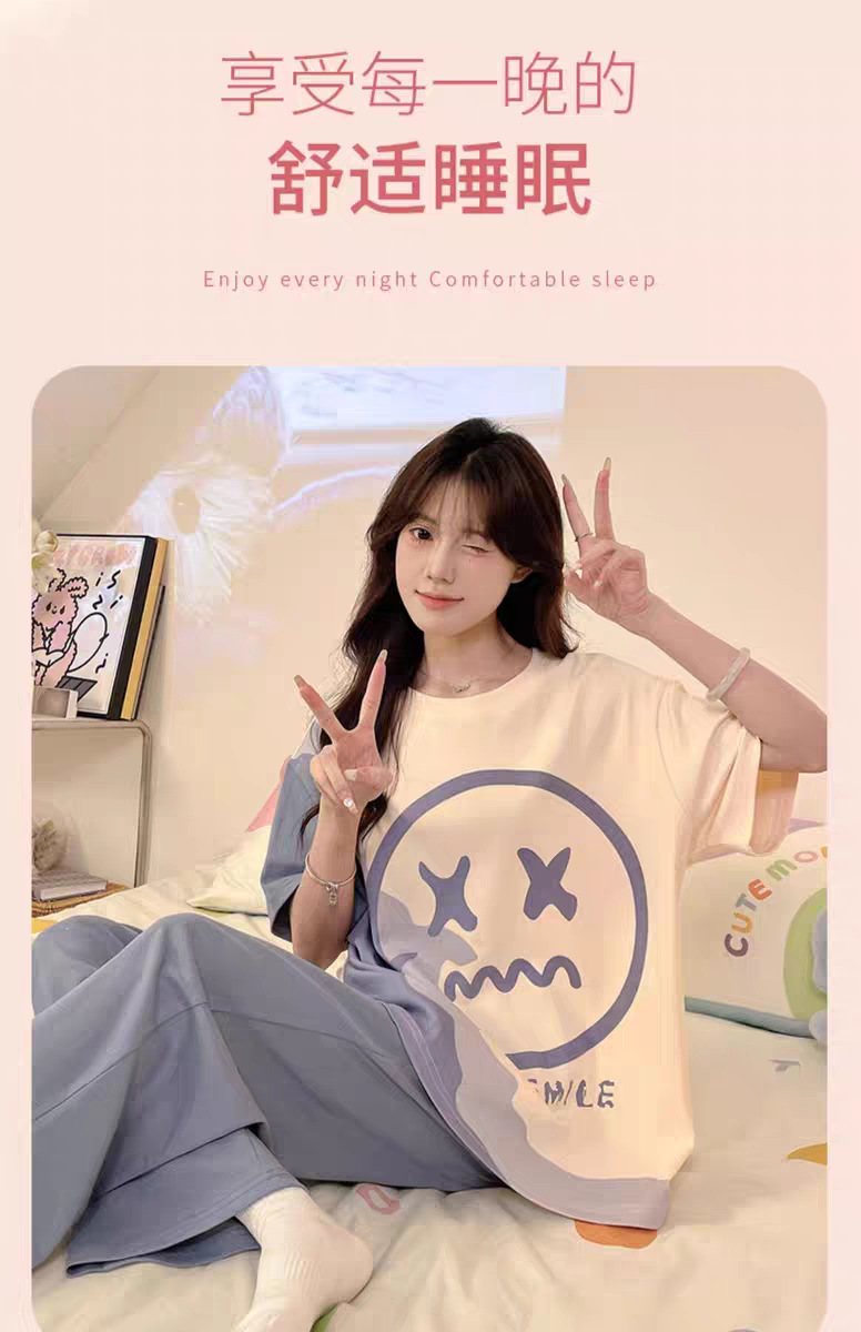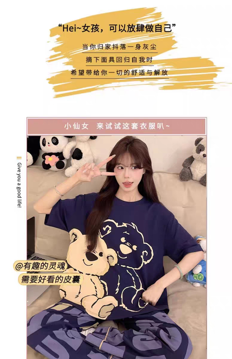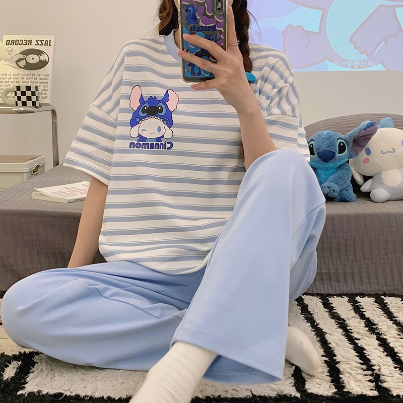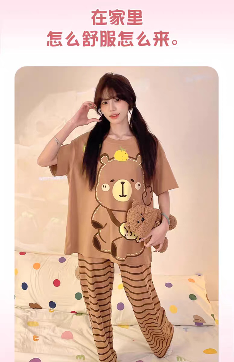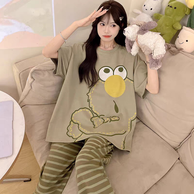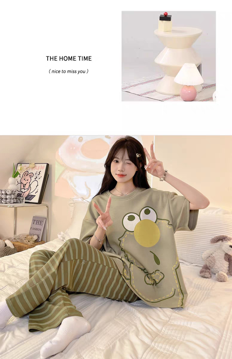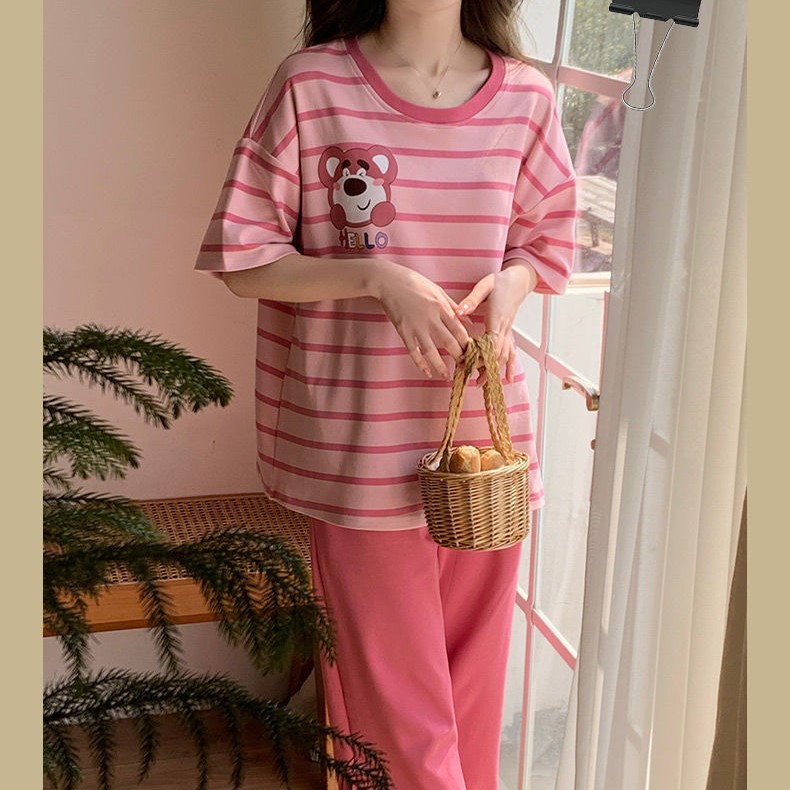 여성용 잠옷 여름 반팔 바지 만화 플러스 사이즈 봄, 가을 느슨한 학생 잠옷 여성 여름 홈웨어 세트스토어 가기