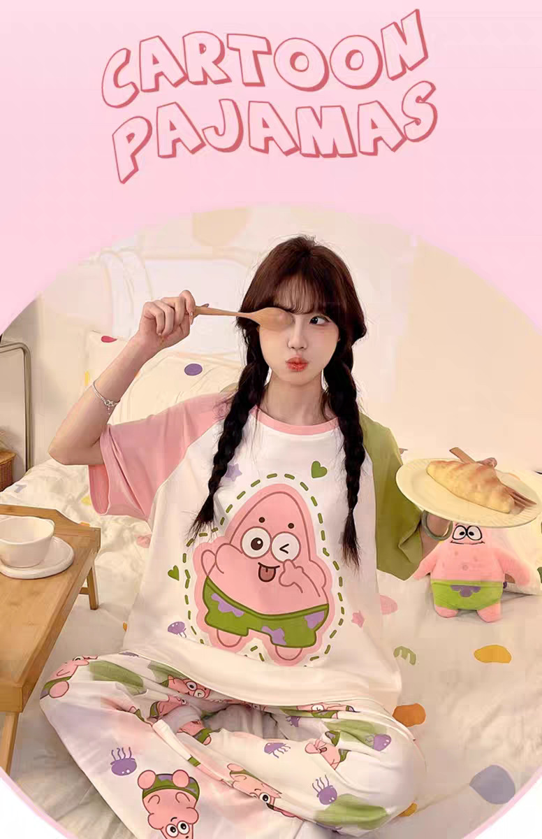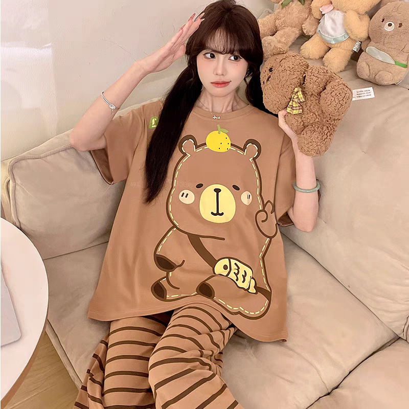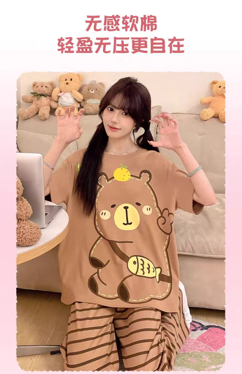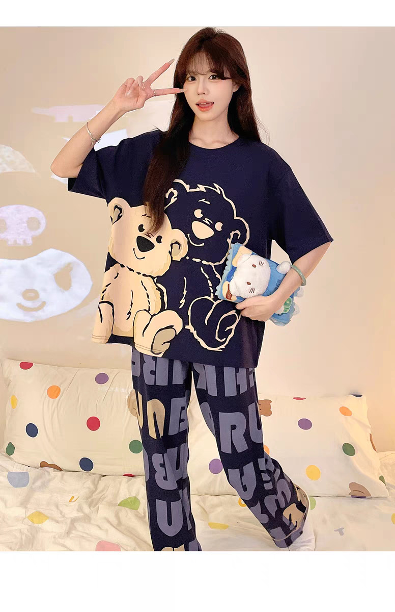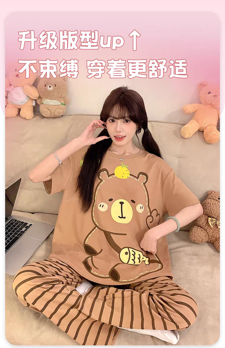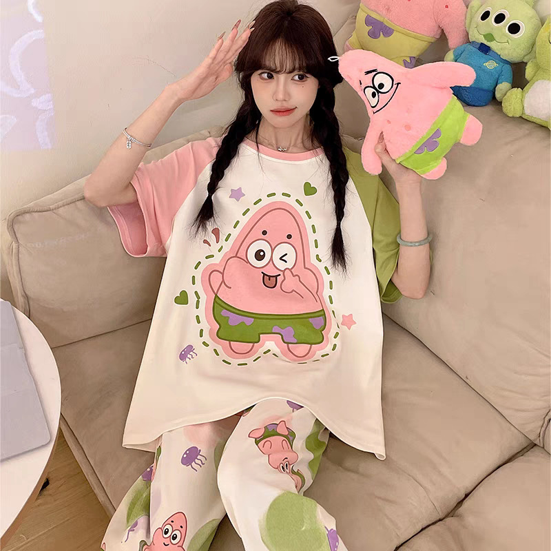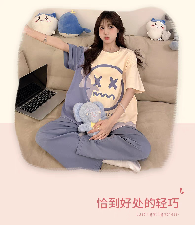 여성용 잠옷 여름 반팔 바지 만화 플러스 사이즈 봄, 가을 느슨한 학생 잠옷 여성 여름 홈웨어 세트스토어 가기