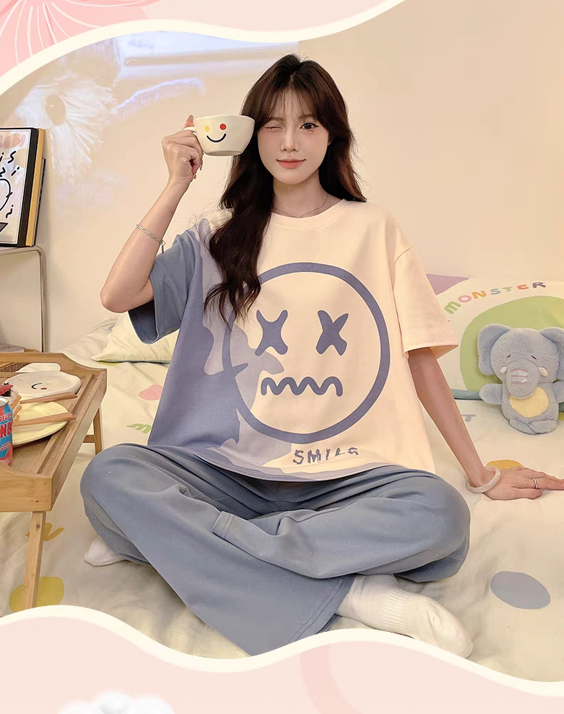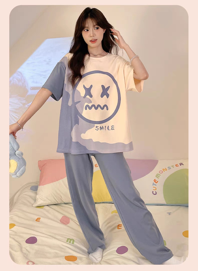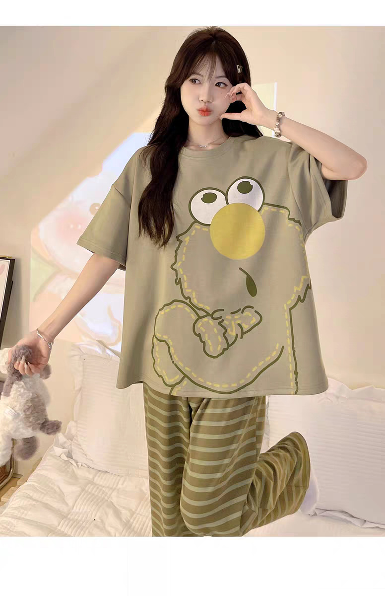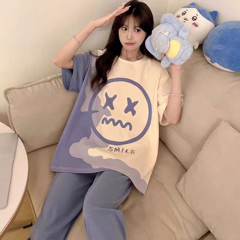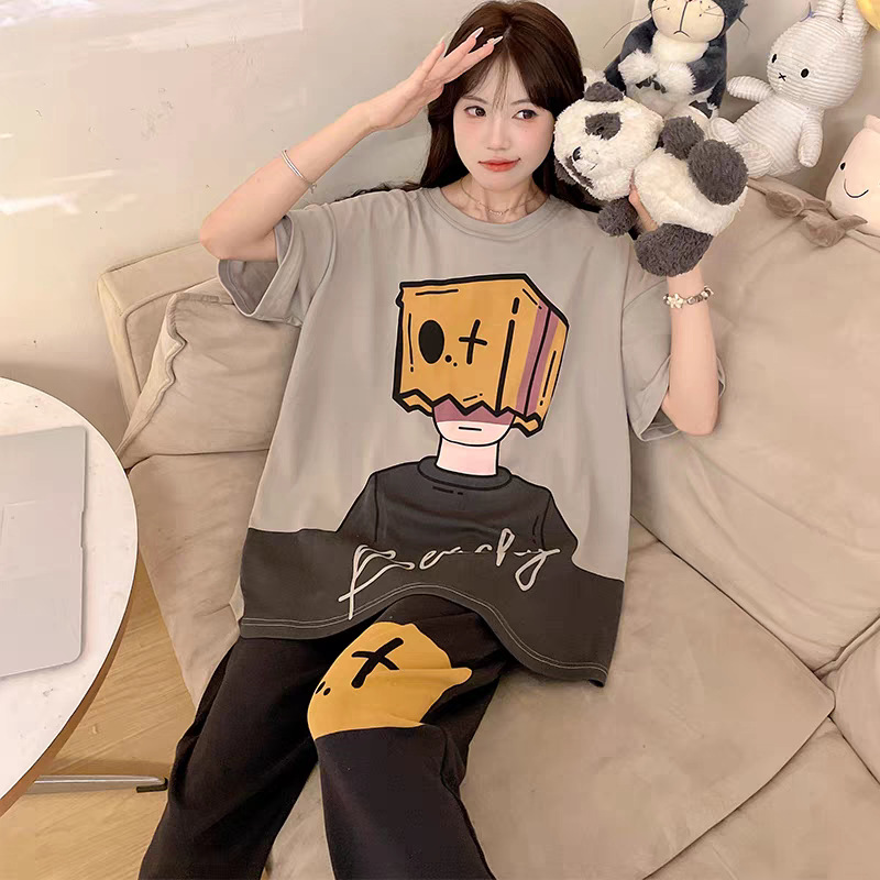 여성용 잠옷 여름 반팔 바지 만화 플러스 사이즈 봄, 가을 느슨한 학생 잠옷 여성 여름 홈웨어 세트