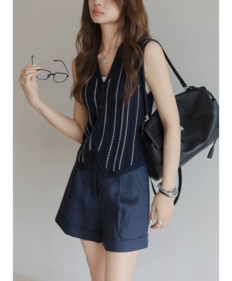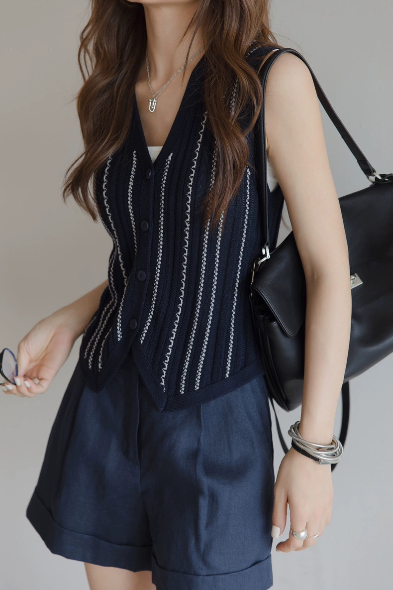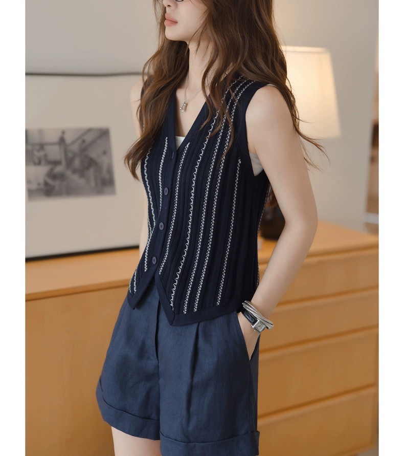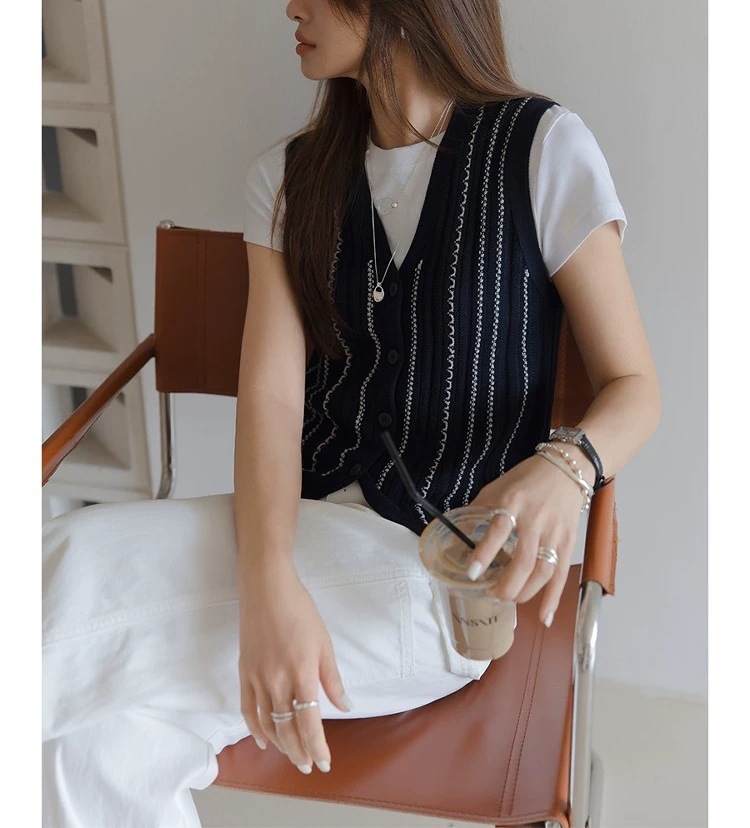 올드 머니 스타일 브이넥 2색 브레이드 버튼 민소매 조끼 니트 가디건 여성 패셔너블 슬림핏 탑스토어 가기