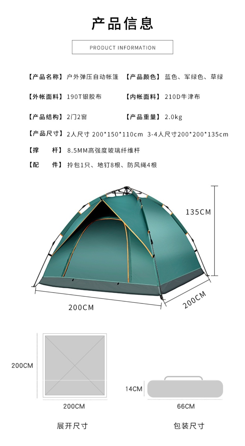 • 2인용 자동 위장색 + 방습 패드 + 베개 2개(탄성 텐트)
