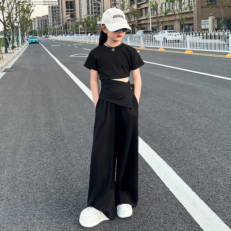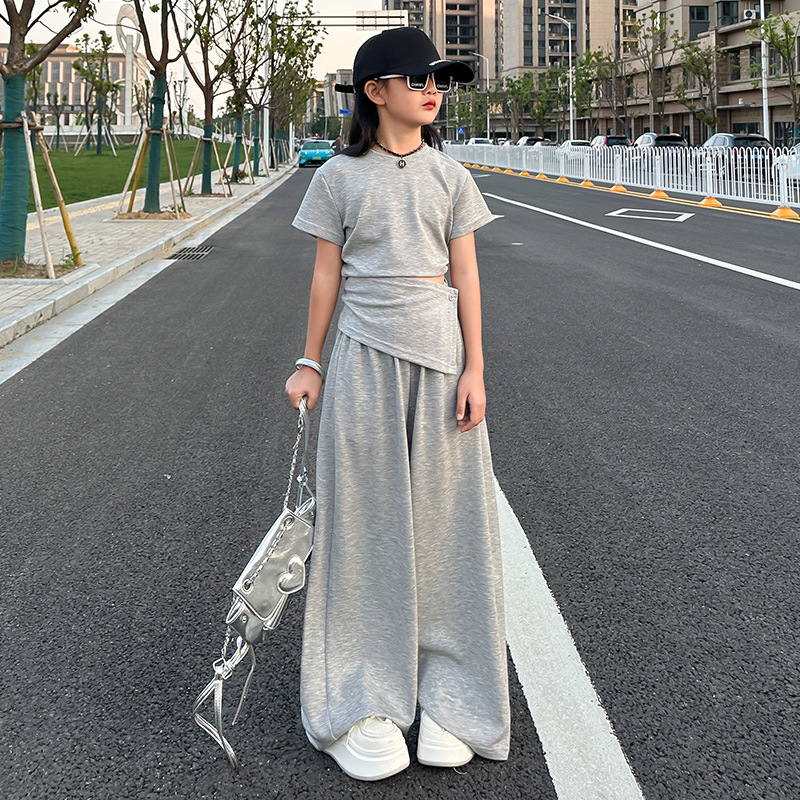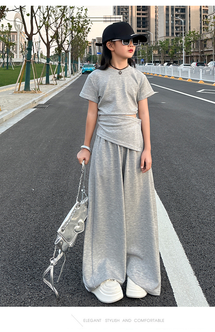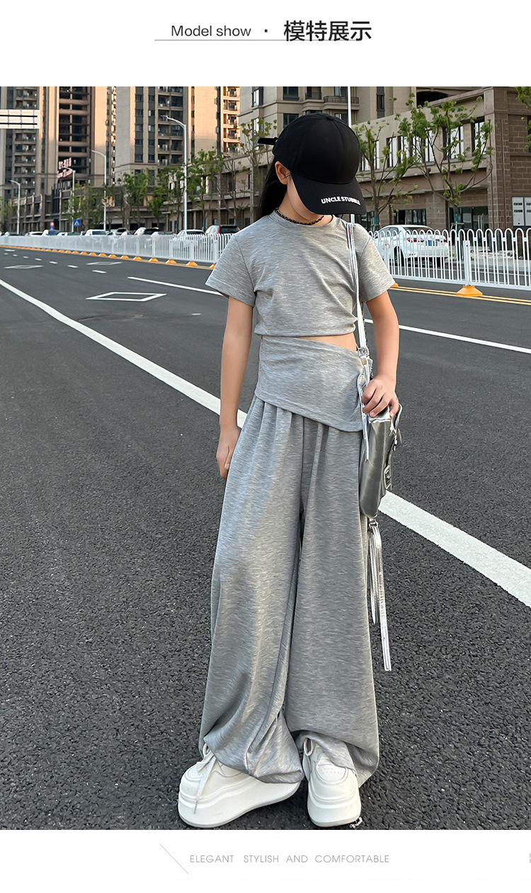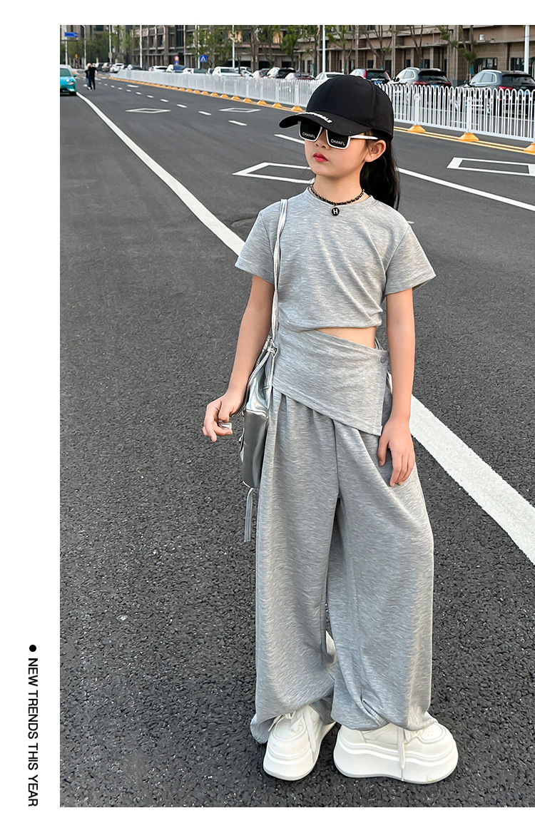 여자 2025 회색 양복 허리 노출 반팔 티셔츠 여름 디자인 캐주얼 바지 와이드 레그 팬츠 달콤하고 시원한 투피스 세트