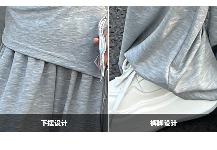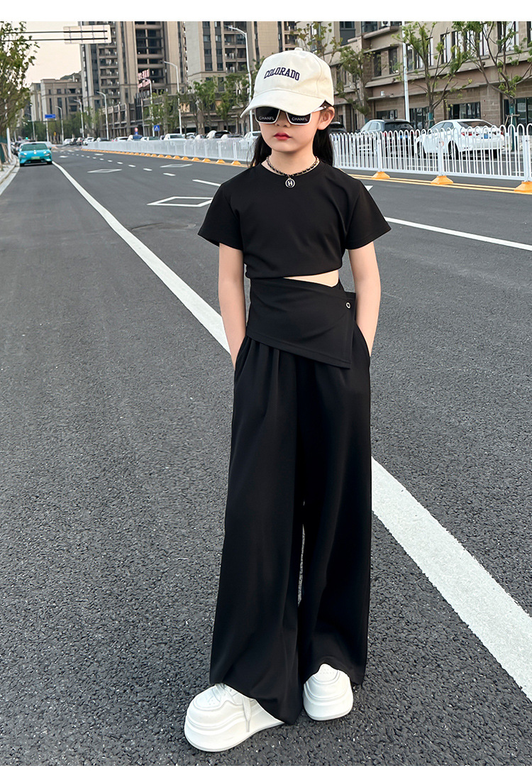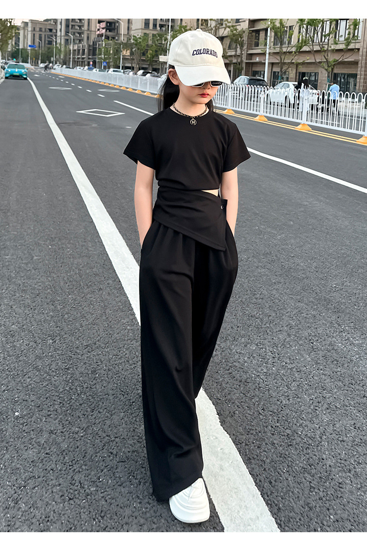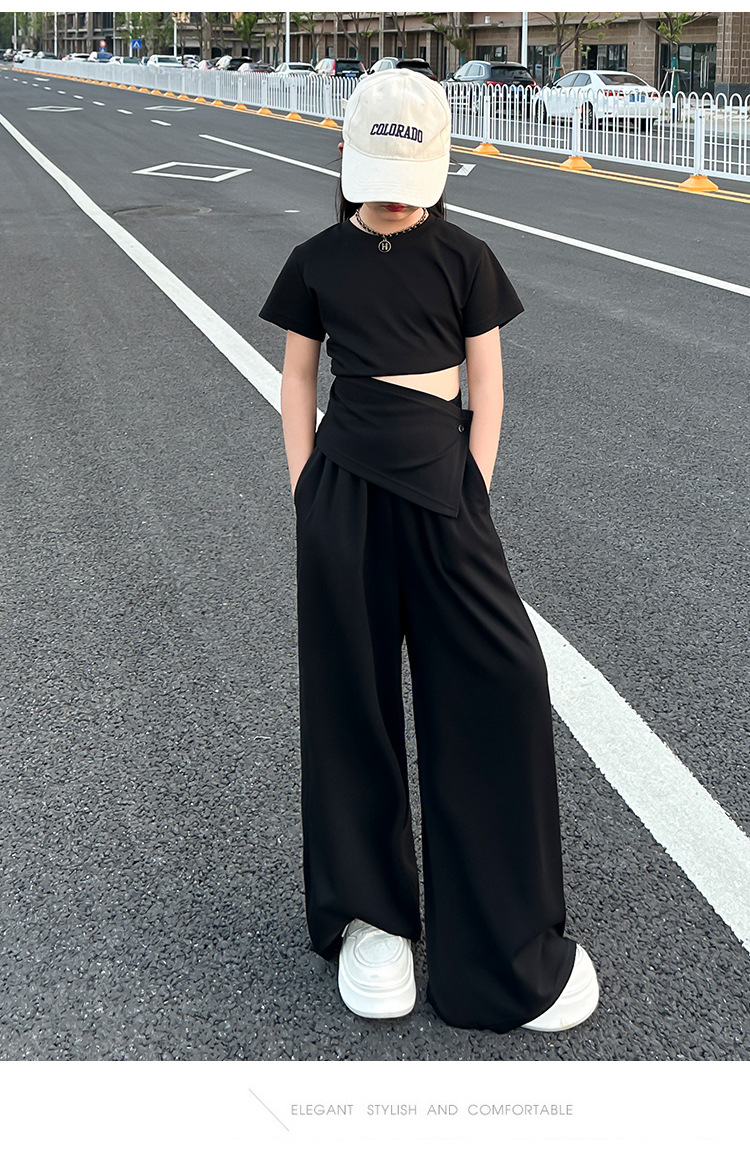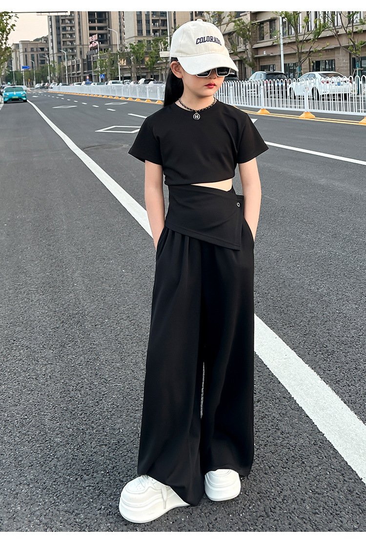 여자 2025 회색 양복 허리 노출 반팔 티셔츠 여름 디자인 캐주얼 바지 와이드 레그 팬츠 달콤하고 시원한 투피스 세트