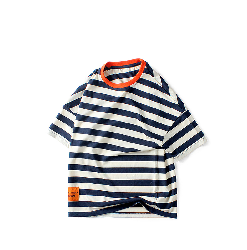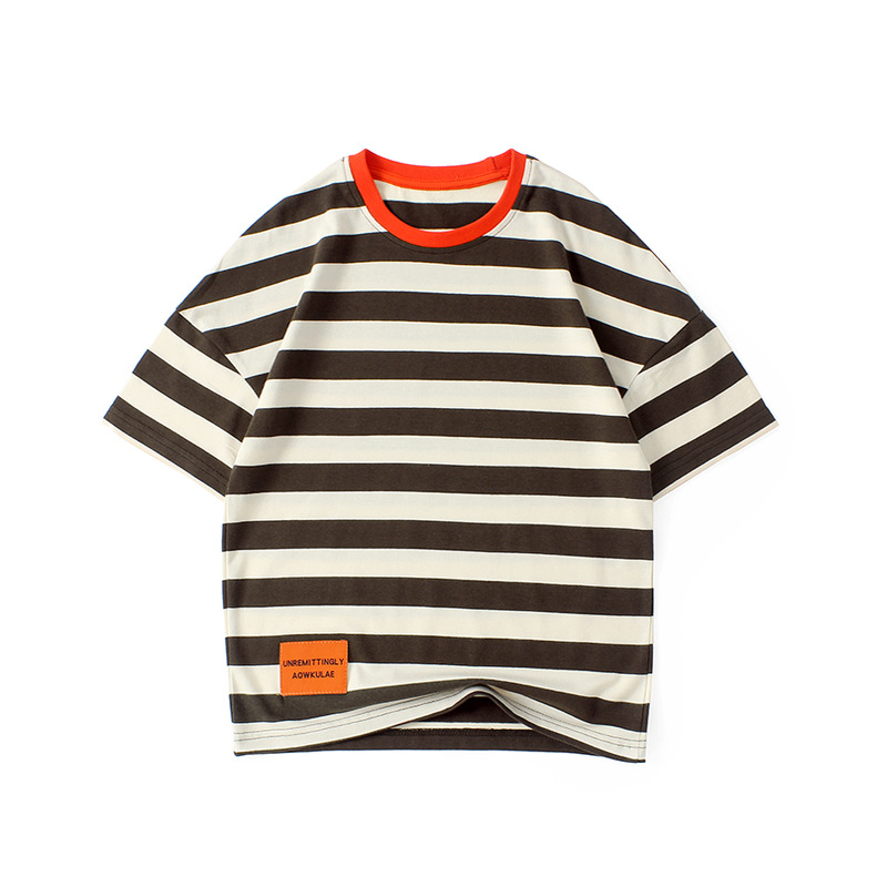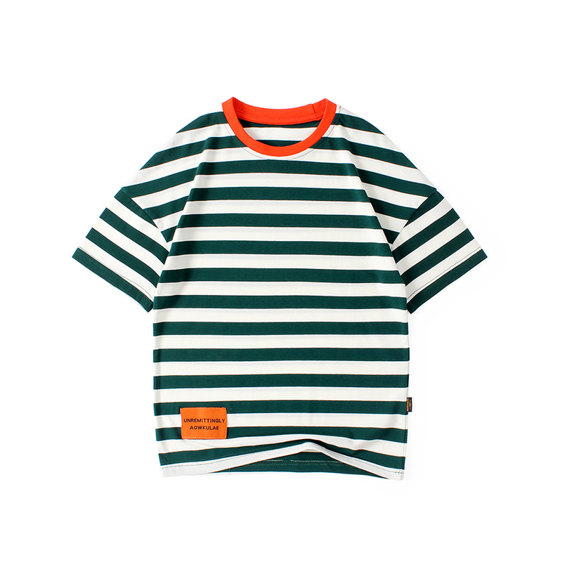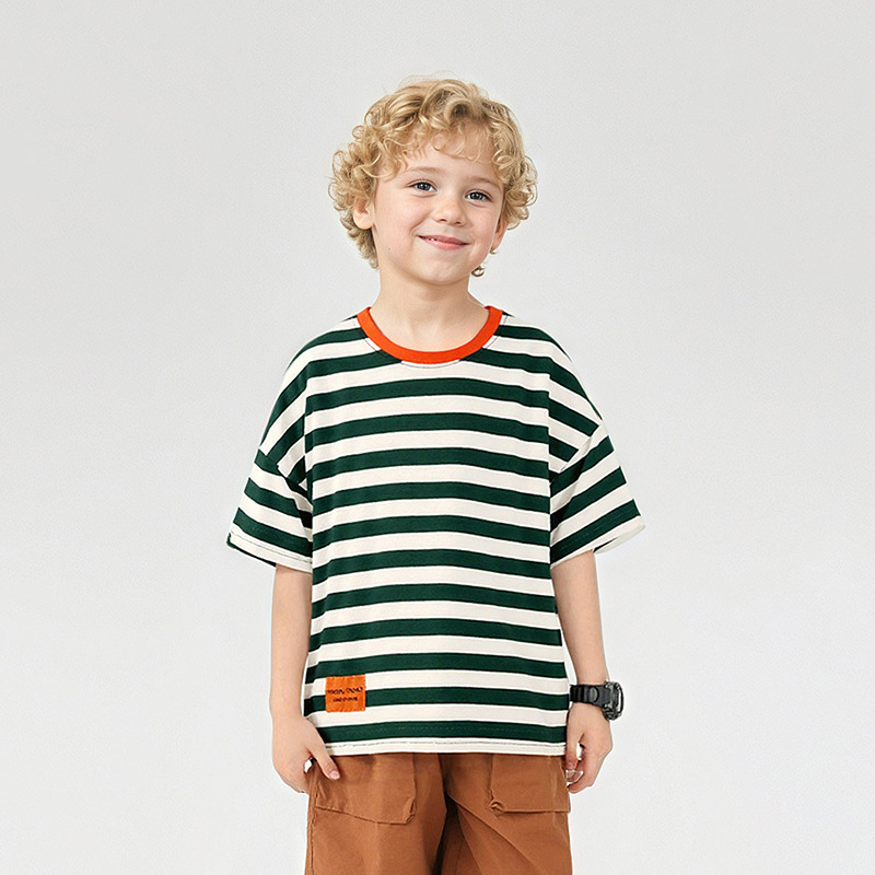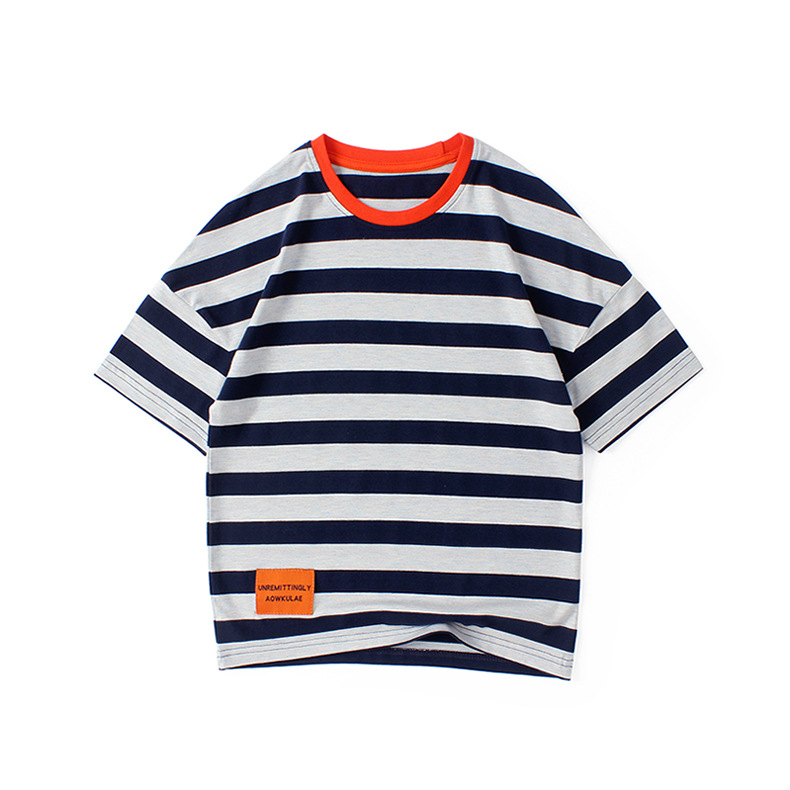 여름 아동복 한국어 버전 새로운 아동 스포츠 반팔 큰 아동 유행 줄무늬 탑 소년 반팔 티셔츠 도매스토어 가기