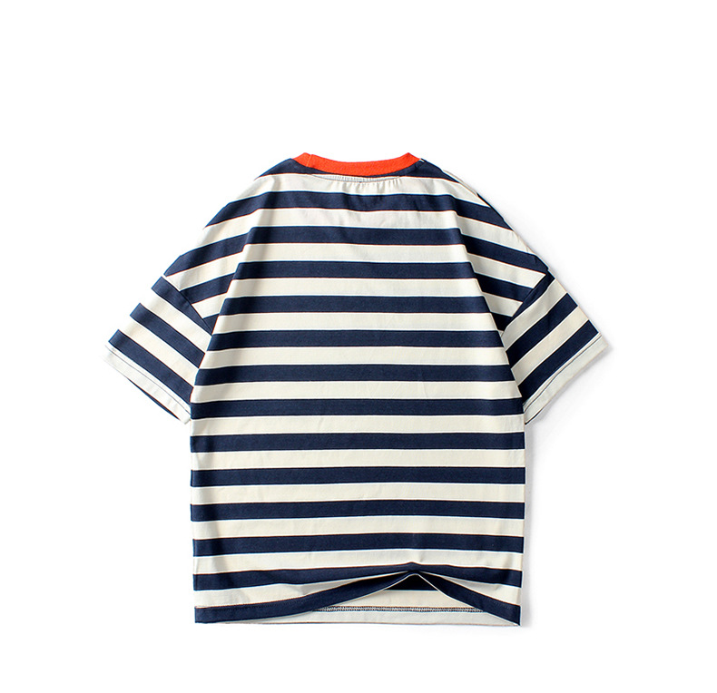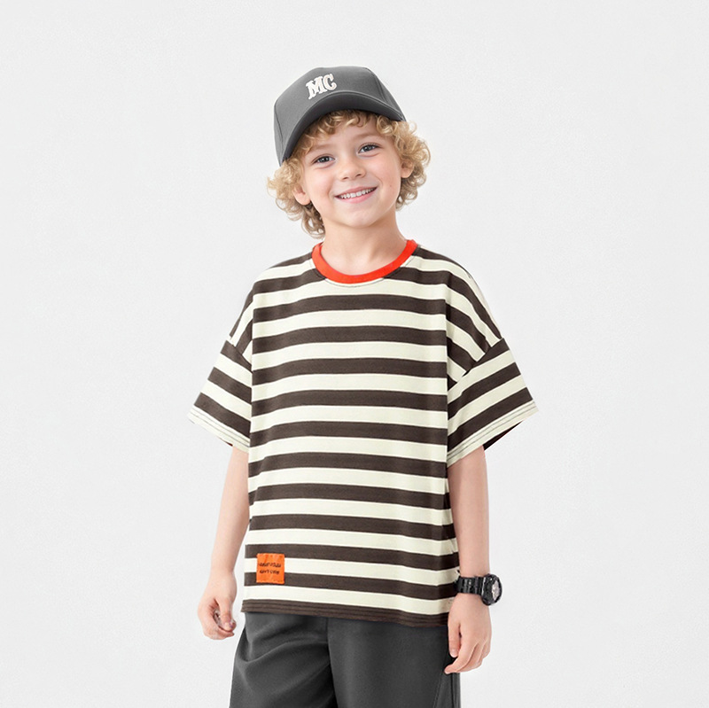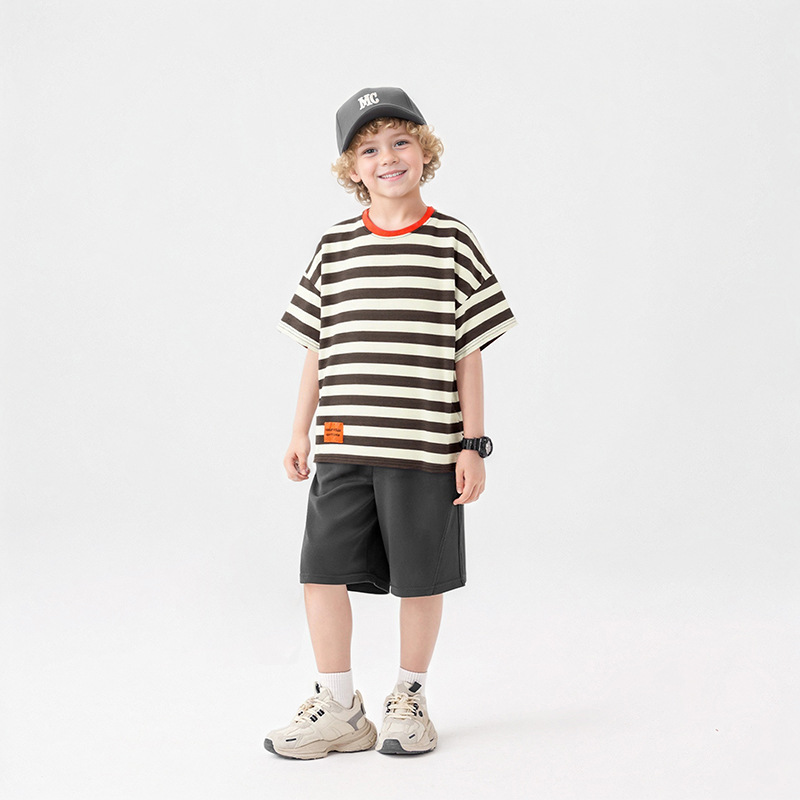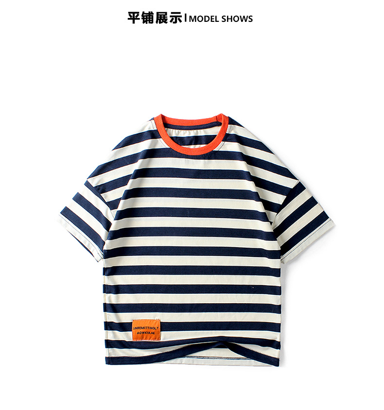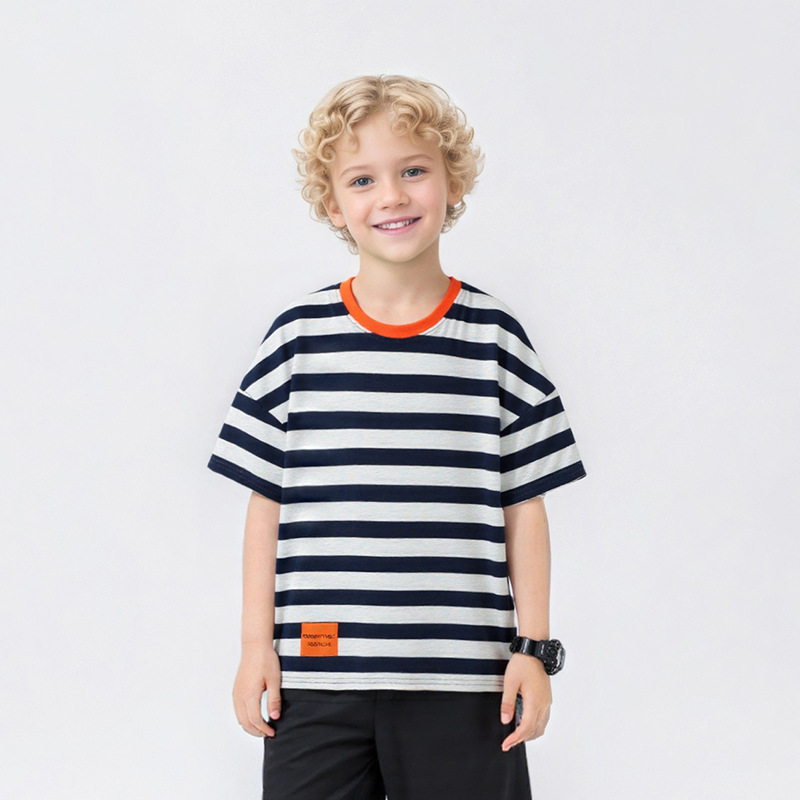 여름 아동복 한국어 버전 새로운 아동 스포츠 반팔 큰 아동 유행 줄무늬 탑 소년 반팔 티셔츠 도매스토어 가기