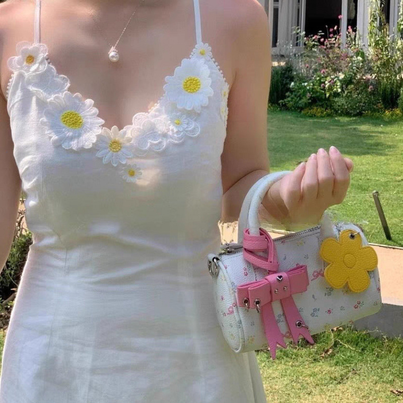 꽃무늬 보스턴 핸드백 2025 신작 소녀 귀여운 리본 원통형 가방 통근 숄더 크로스백스토어 가기