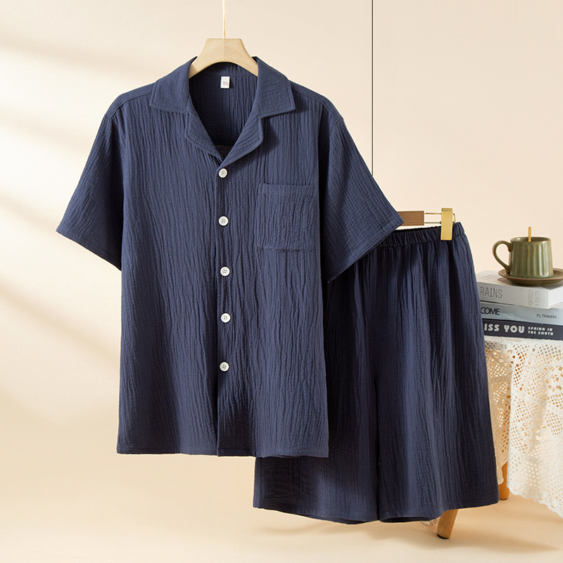 남성용 여름 잠옷, 순면 이중 거즈 반팔 반바지, 얇은 단색 대형 홈웨어 세트, 외부 착용 가능스토어 가기