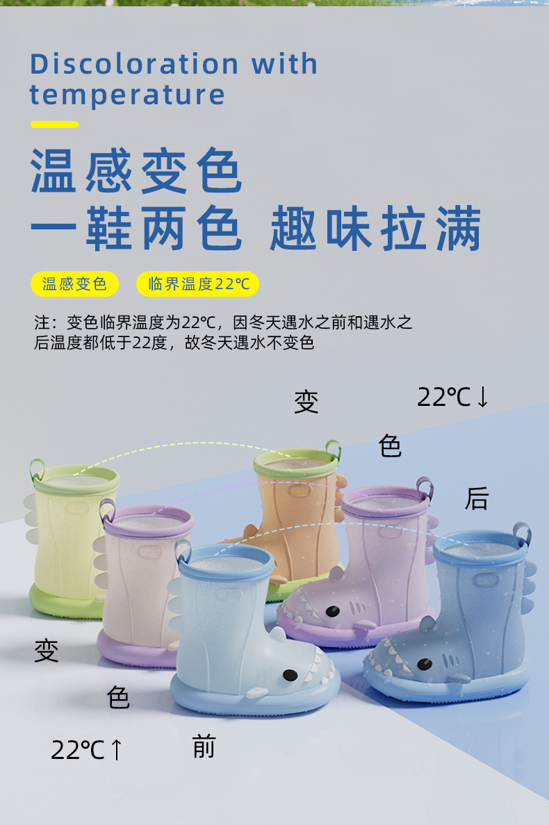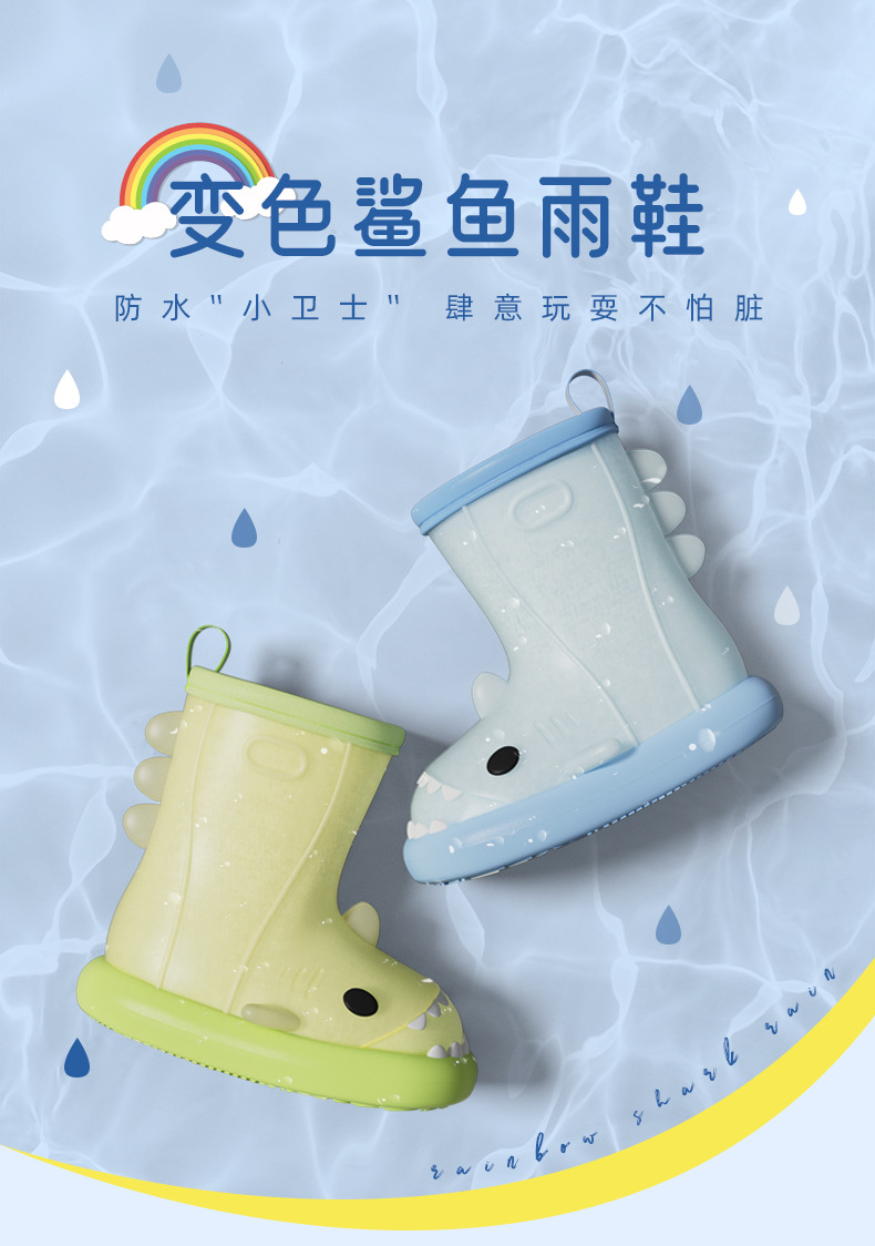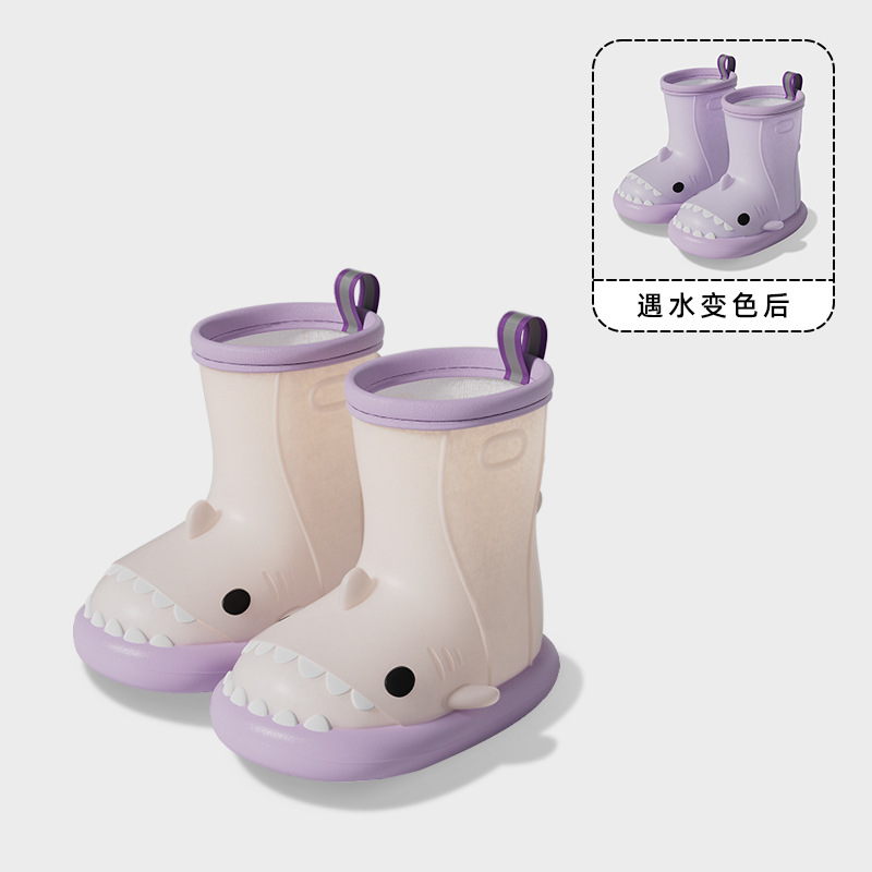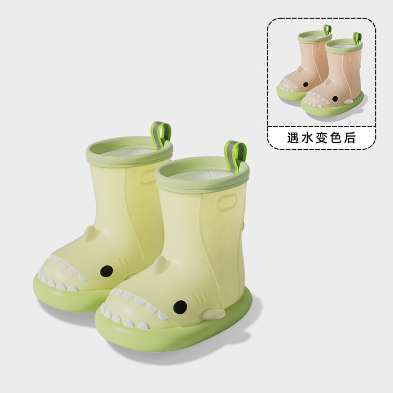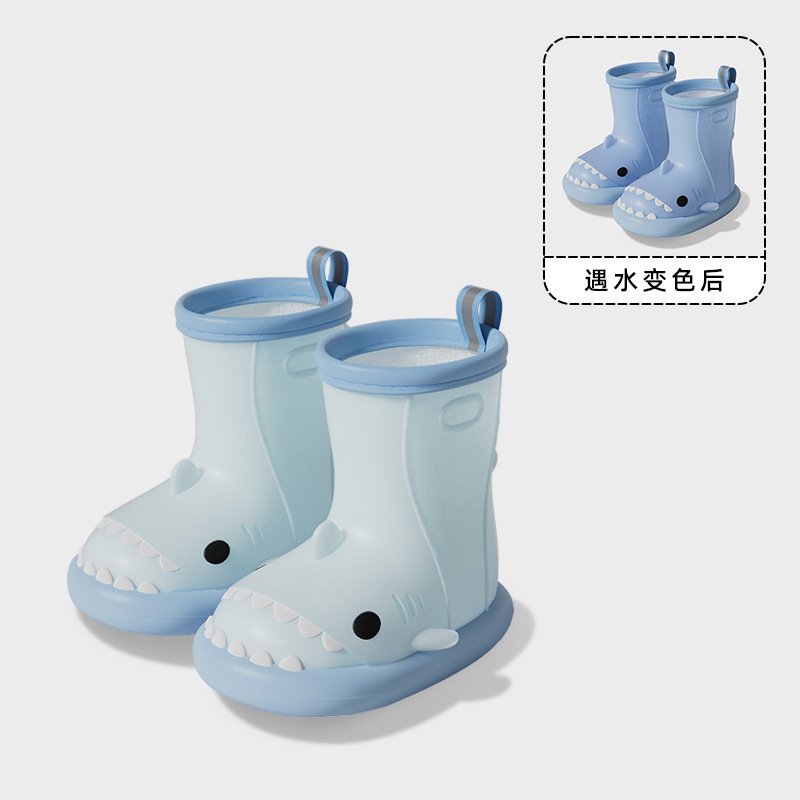 남아 및 여아용 샤크 색상 변경 장화, 만화 유아 및 어린이 장화, 귀여운 아기 야외 고무 신발 및 물 신발