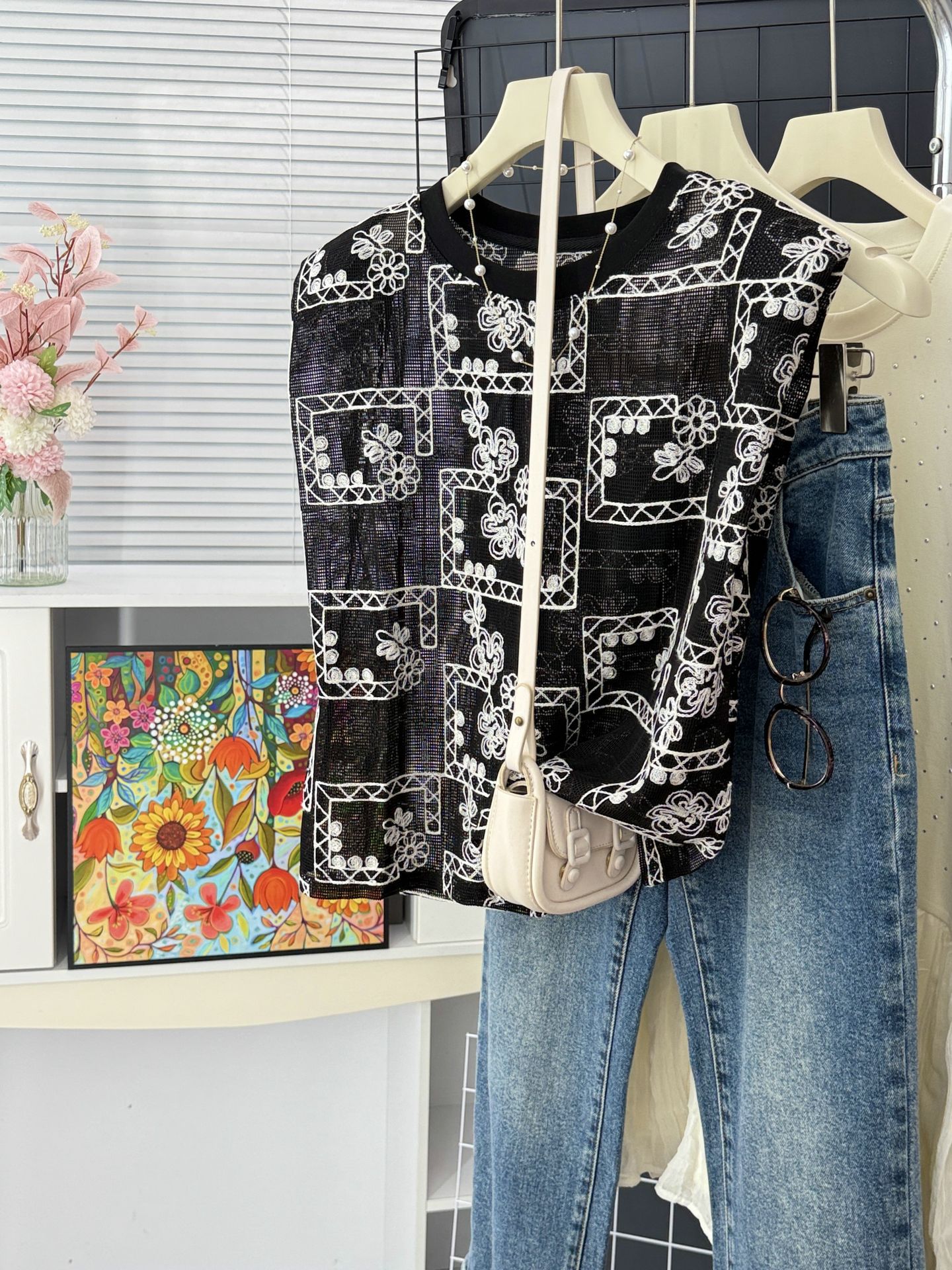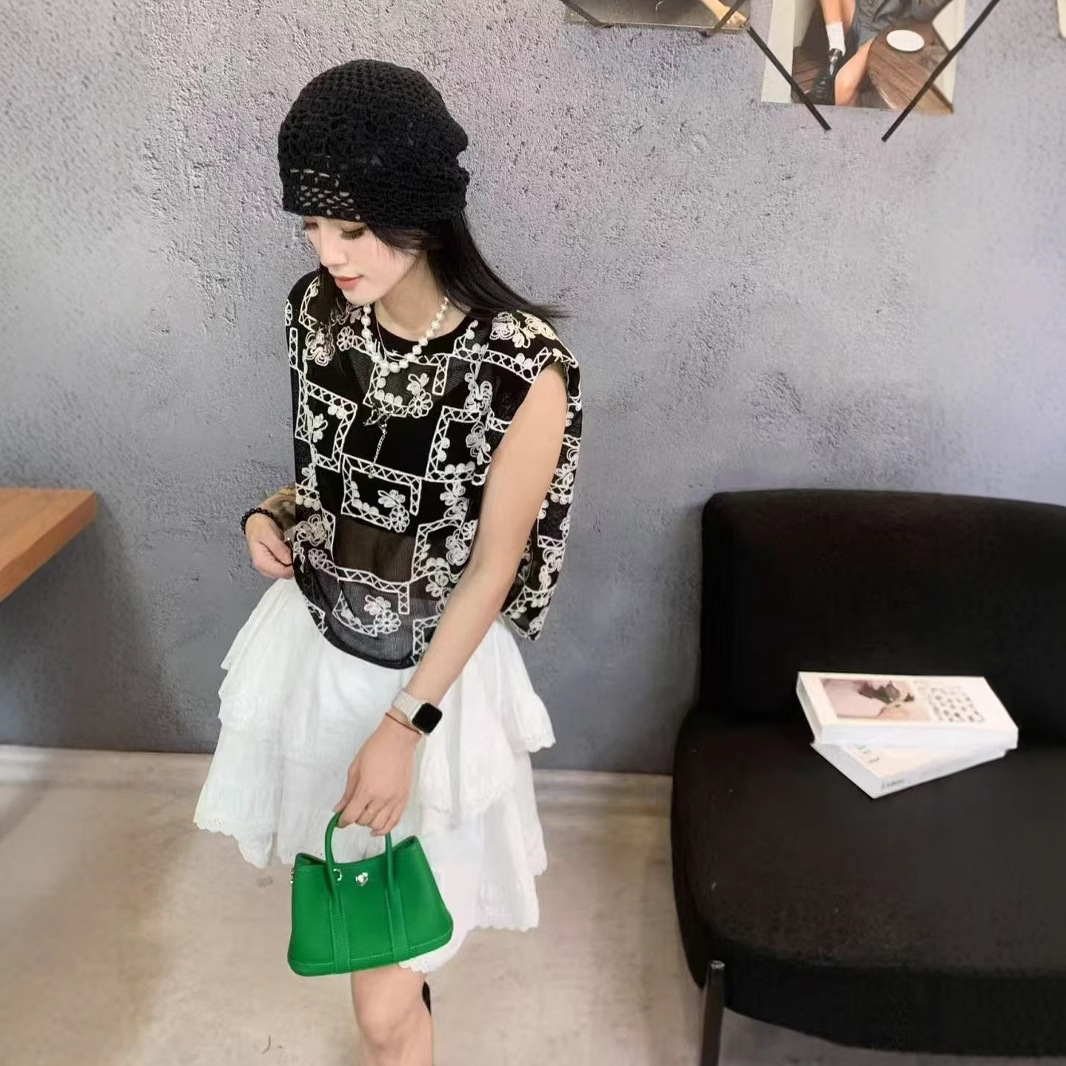 유럽 스테이션 2025 여름 신작 패셔너블한 메쉬 자수 약간 반투명 라운드 넥 캐주얼 플라이 슬리브 탑 여성용 시폰 셔츠