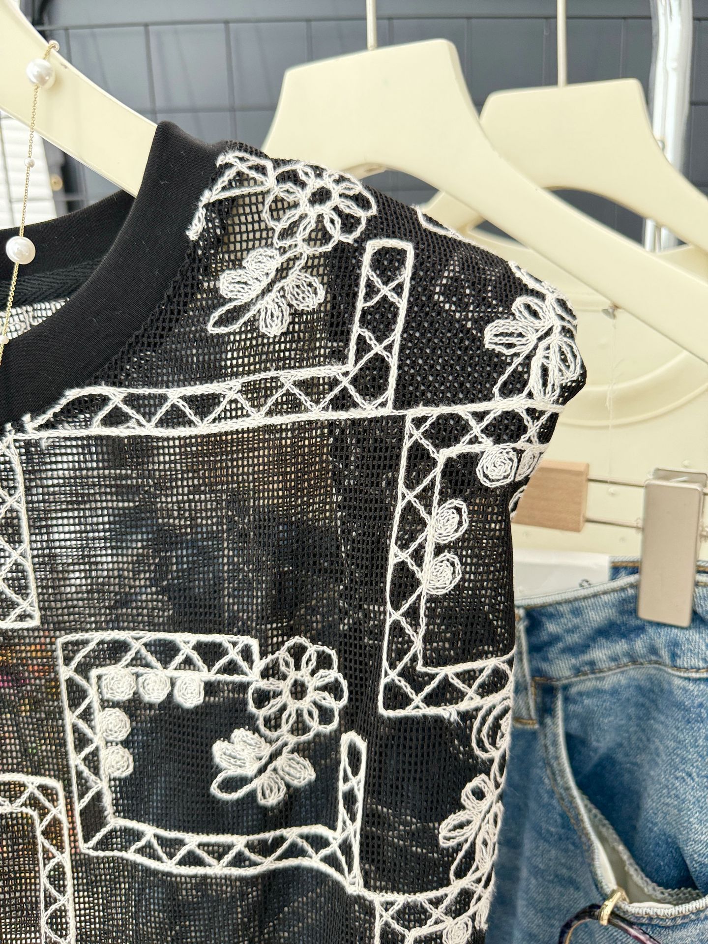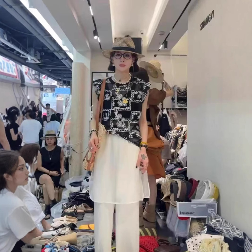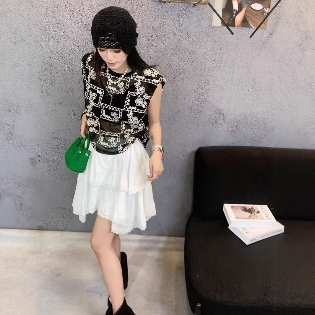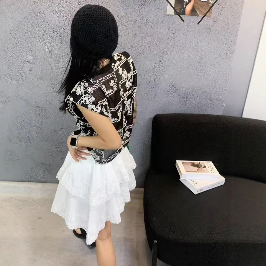 유럽 스테이션 2025 여름 신작 패셔너블한 메쉬 자수 약간 반투명 라운드 넥 캐주얼 플라이 슬리브 탑 여성용 시폰 셔츠스토어 가기
