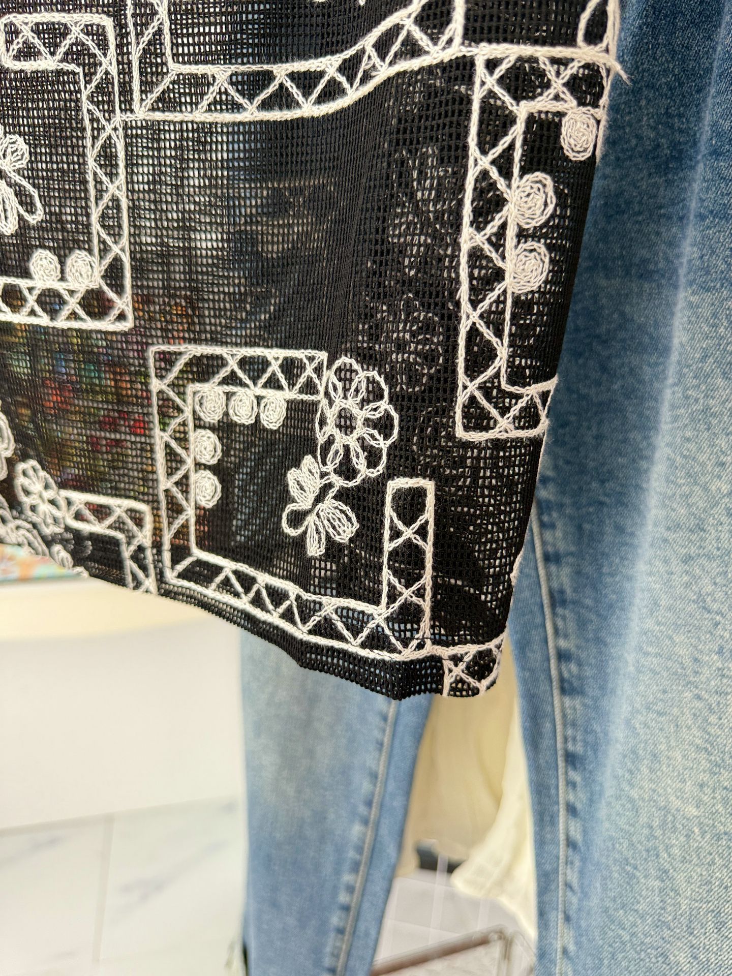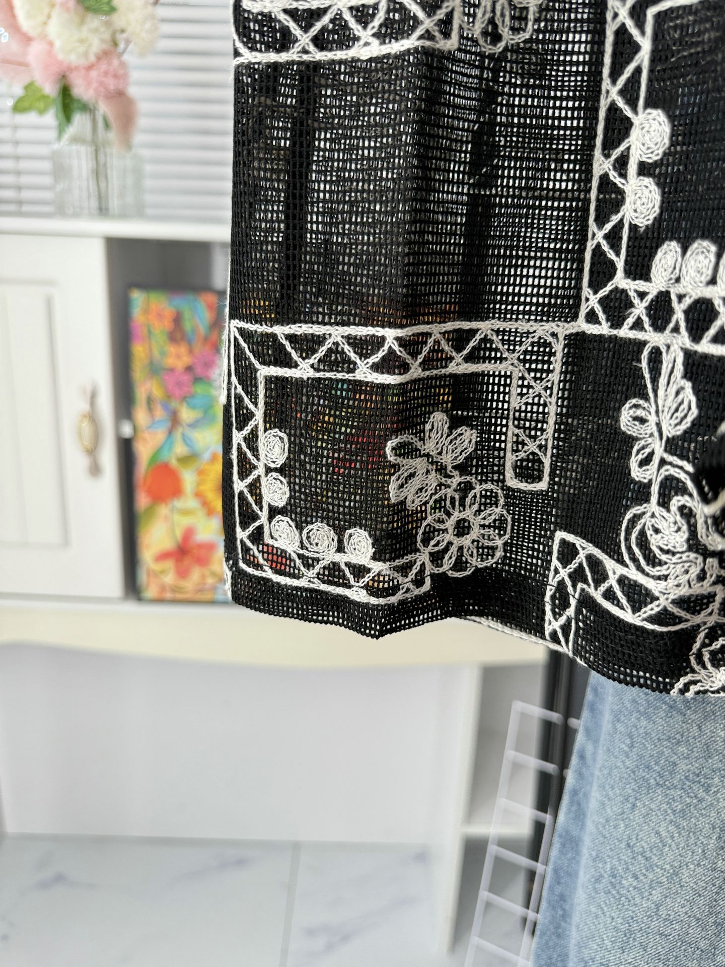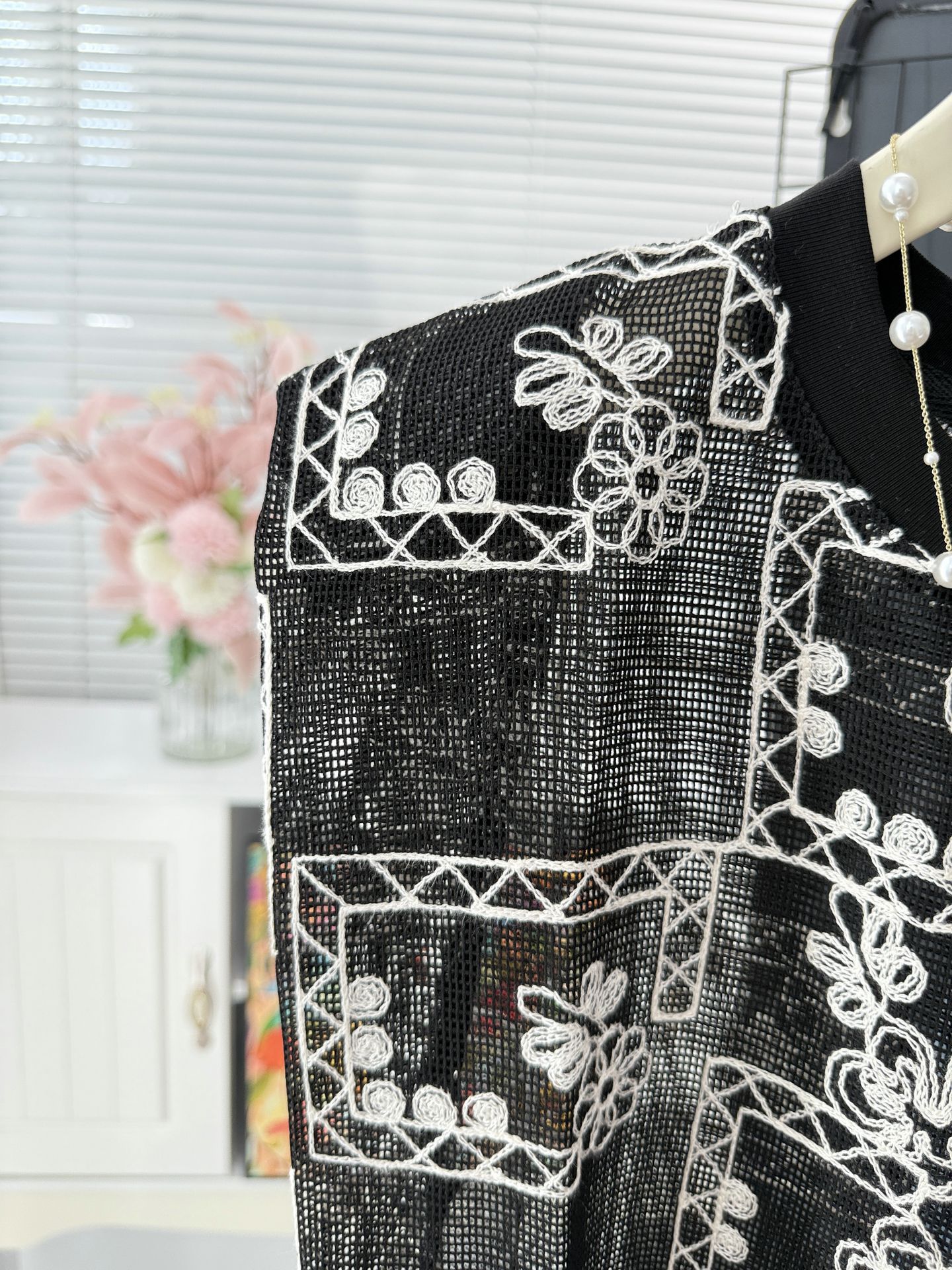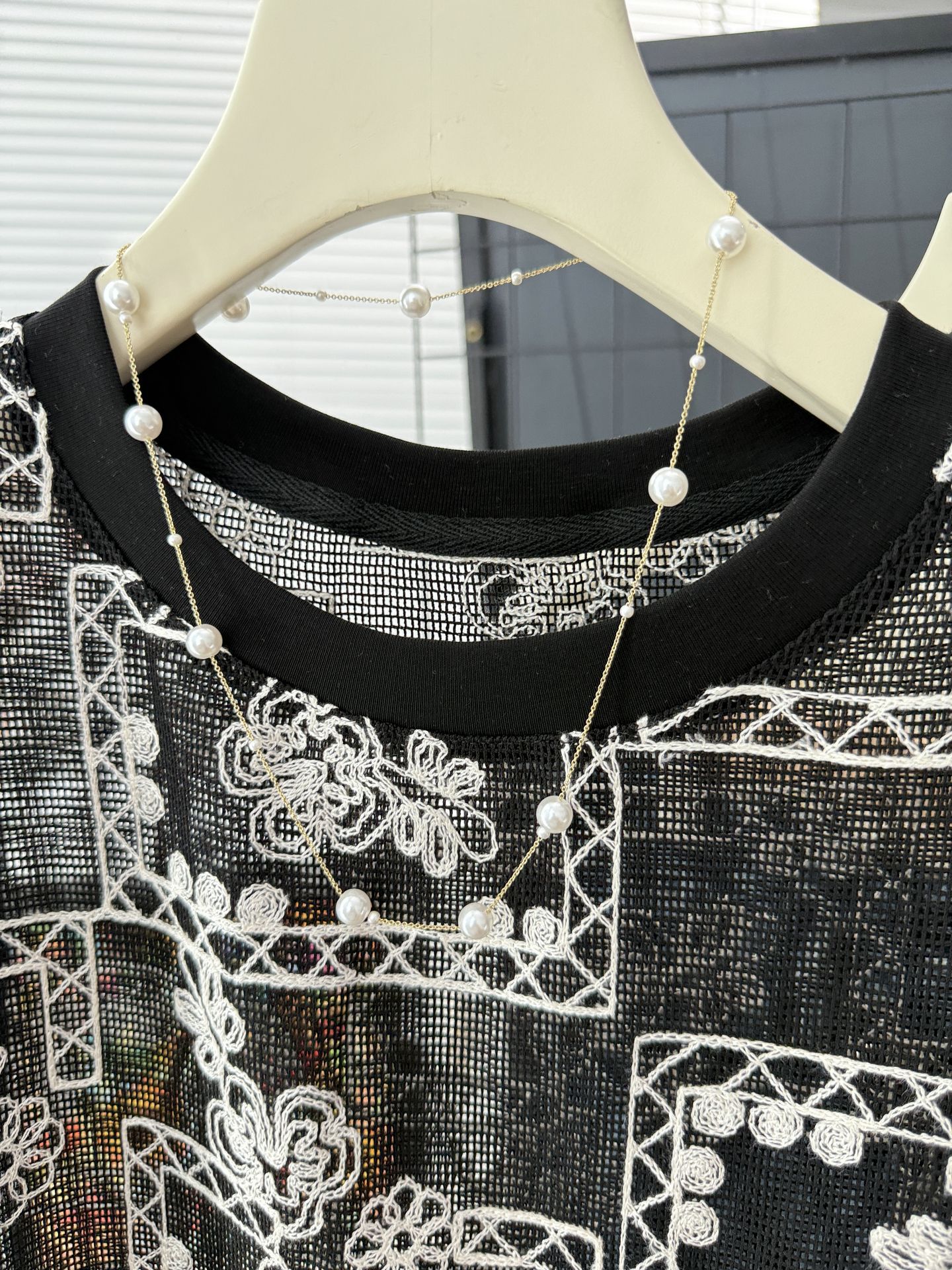 유럽 스테이션 2025 여름 신작 패셔너블한 메쉬 자수 약간 반투명 라운드 넥 캐주얼 플라이 슬리브 탑 여성용 시폰 셔츠스토어 가기