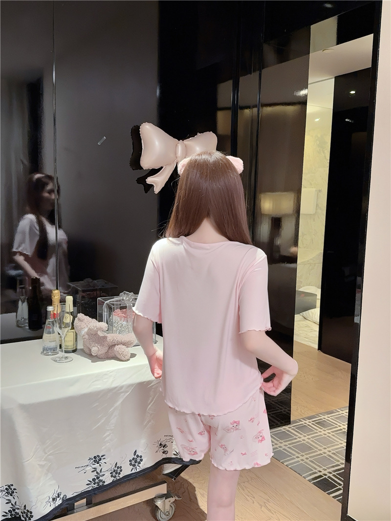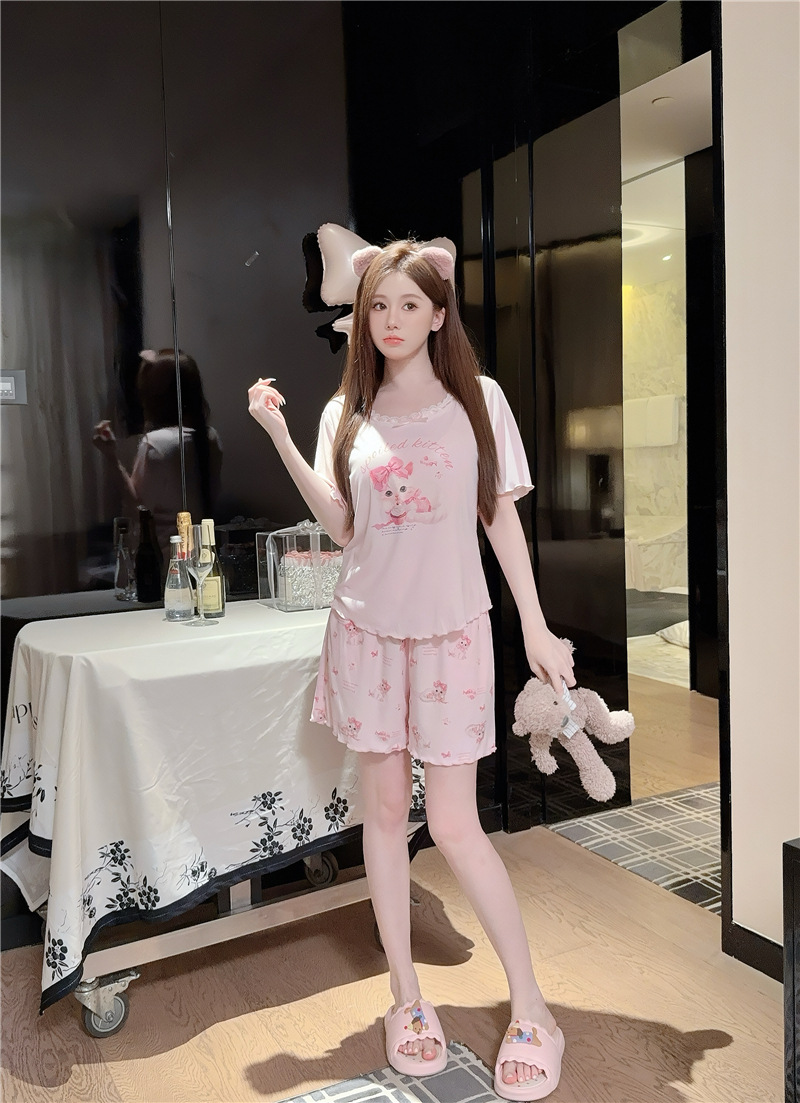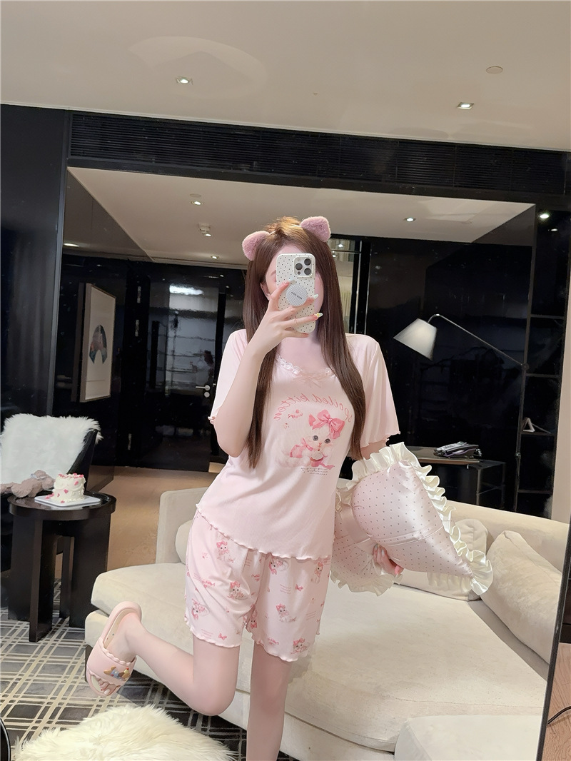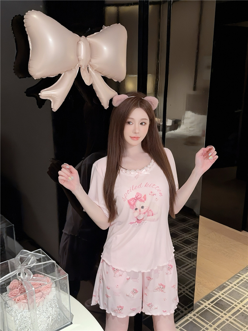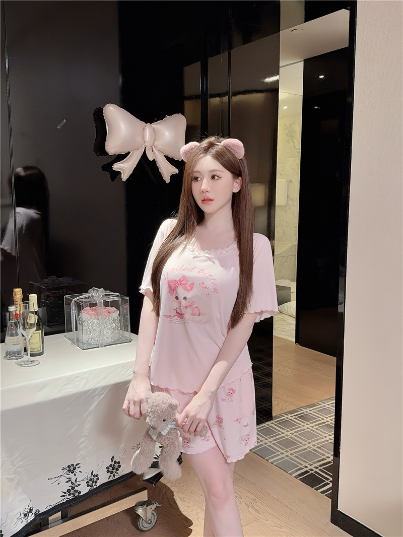 여성용 잠옷 여름 미세 스레드 모달 코튼 핑크 고양이 프린트 편안한 반팔 반바지 세트 가슴 코튼 홈웨어스토어 가기