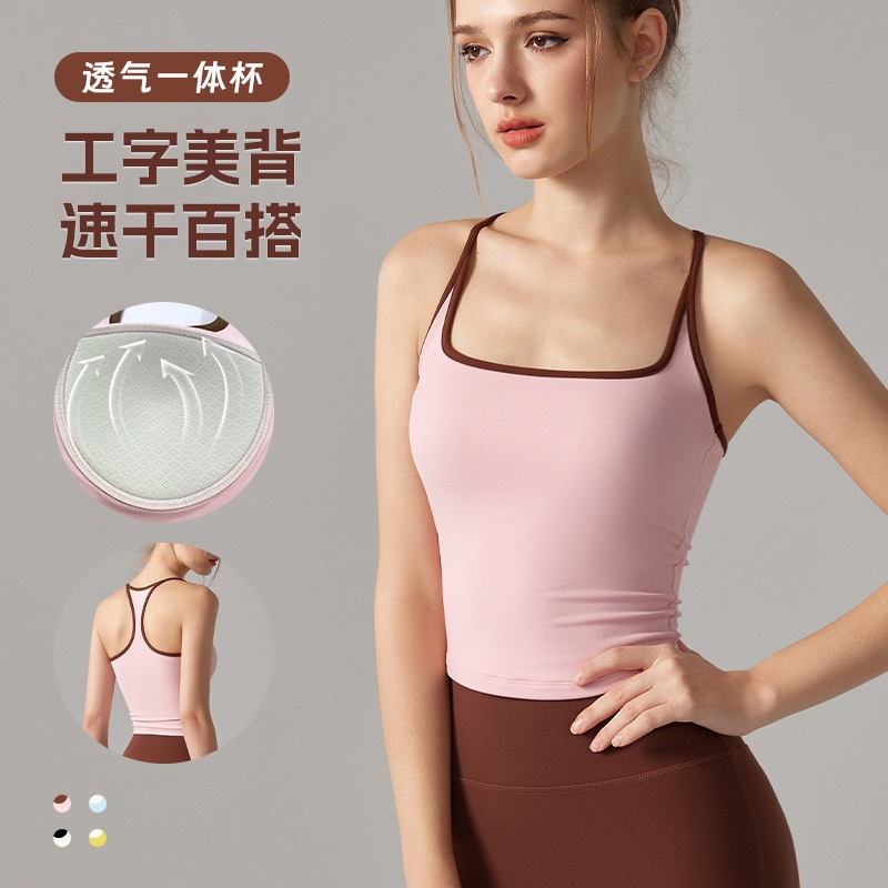 배색 I자형 등 스포츠 브라, 피부친화적인 누드 필라테스 피트니스 브라, 얇은 멜빵, 통기성 요가조끼