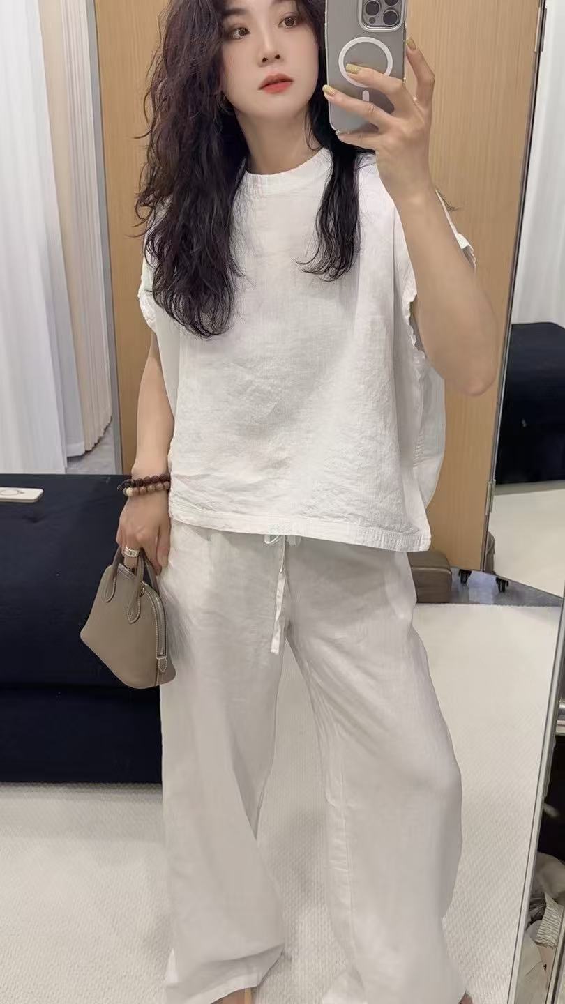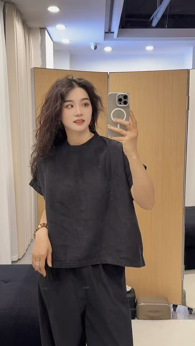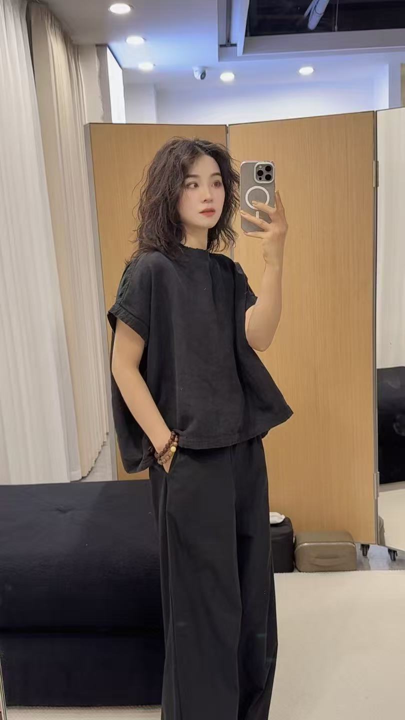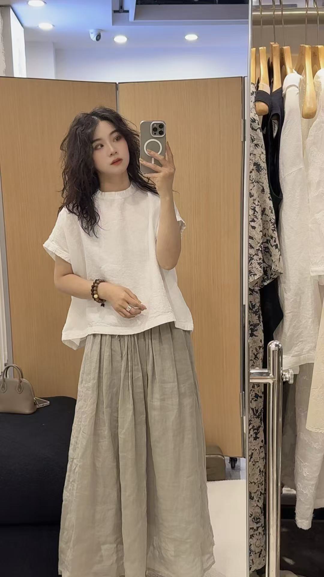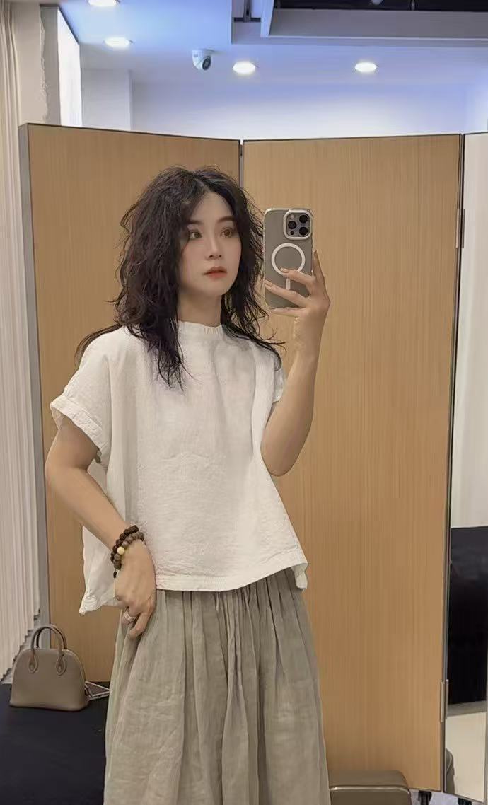 2025 여름 한국 스타일 느슨하고 간단한 대마 작은 플라잉 슬리브 스탠드 칼라 솔리드 컬러 풀오버 티셔츠 여성용 다용도 셔츠 Q652