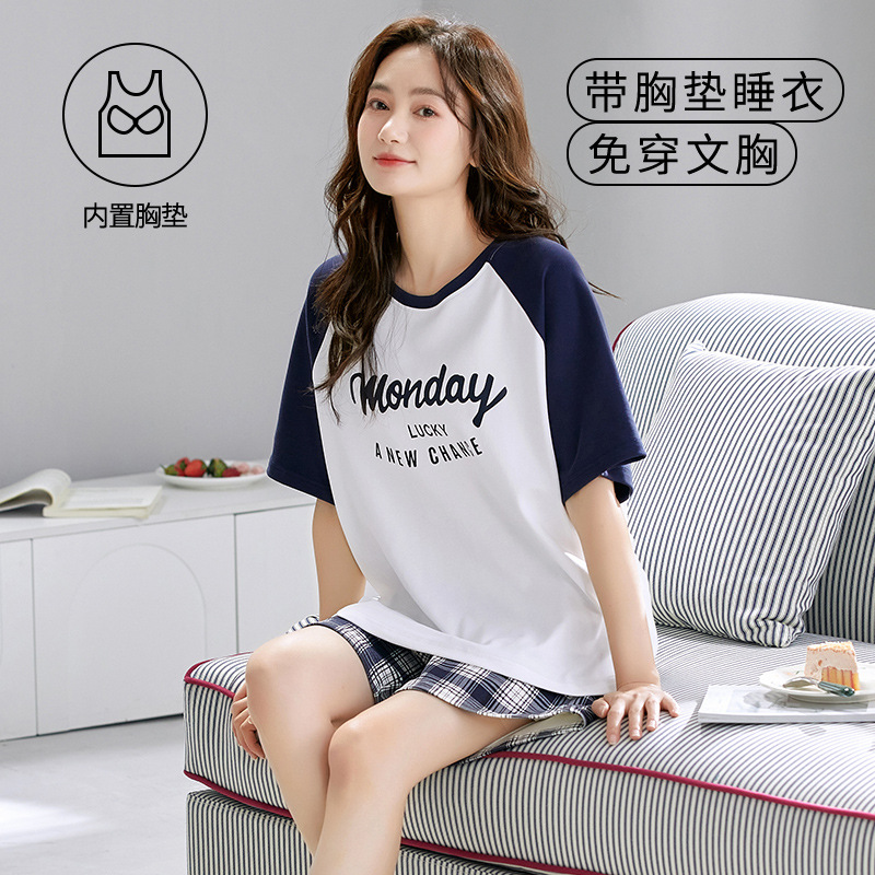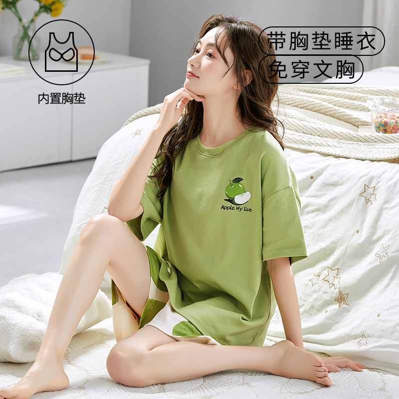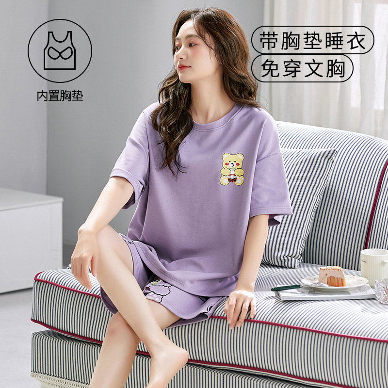 여성용 여름 잠옷, 고정형 가슴 패드가 있는 반팔 반바지 투피스 세트, 외출복으로도 착용 가능, 헐렁한 핏의 캐주얼 홈웨어