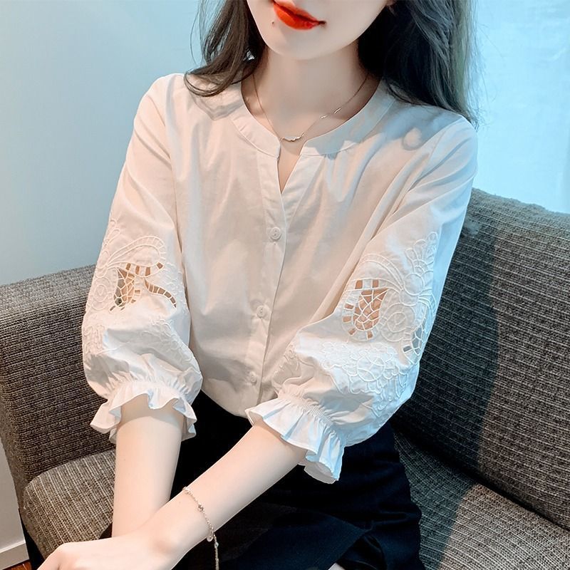 여름 반팔 쉬폰 셔츠 여성 2025 새로운 퍼프 슬리브 미드 슬리브 탑 세련된 5부 소매 셔츠스토어 가기
