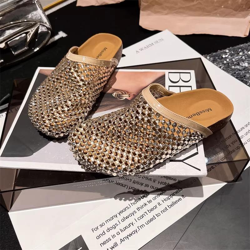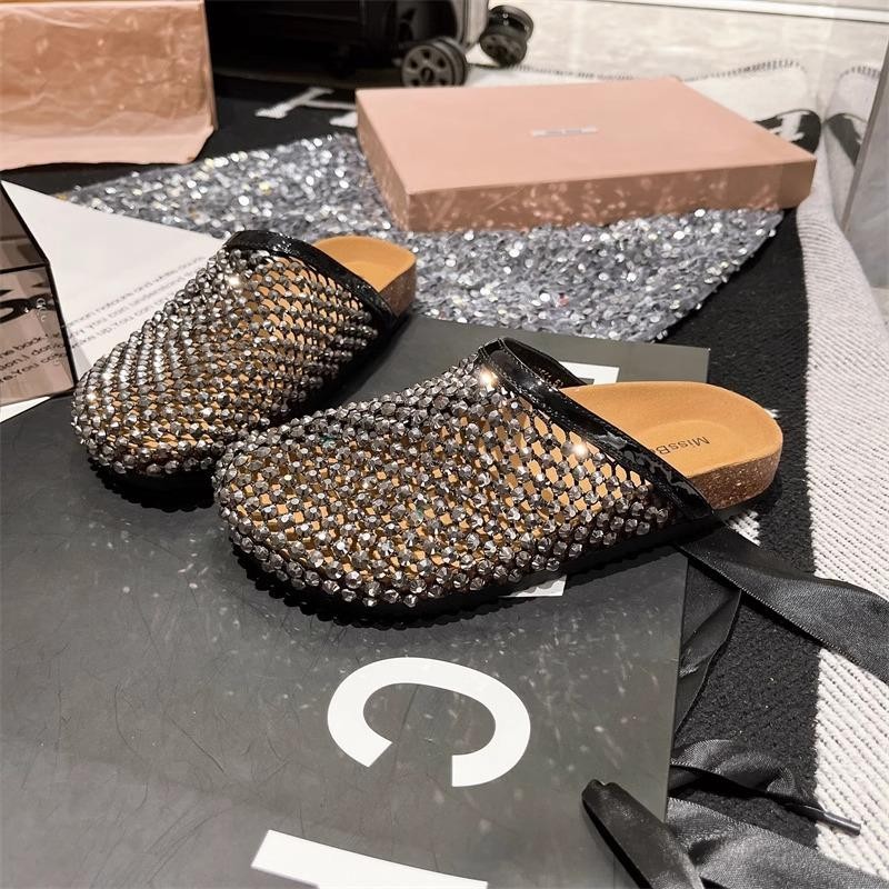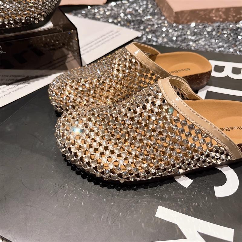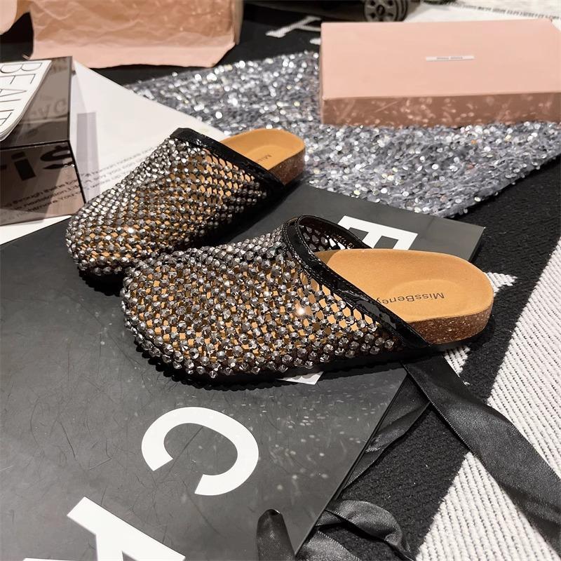 2025 여름 라인스톤 풀 다이아몬드 통기성 망사 중공 아우터 발가락 반슬리퍼 샌들 버켄스탁 플랫 여성화스토어 가기
