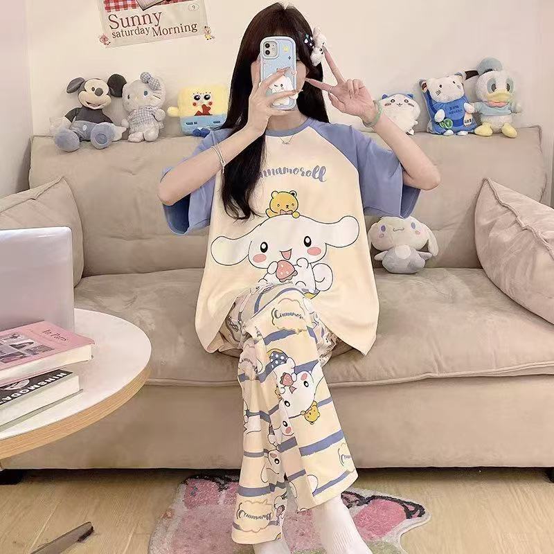 여성을위한 잠옷 여름 2025 새로운 반팔 바지 얇은 달콤한 귀여운 만화 느슨한 캐주얼 홈웨어 세트
