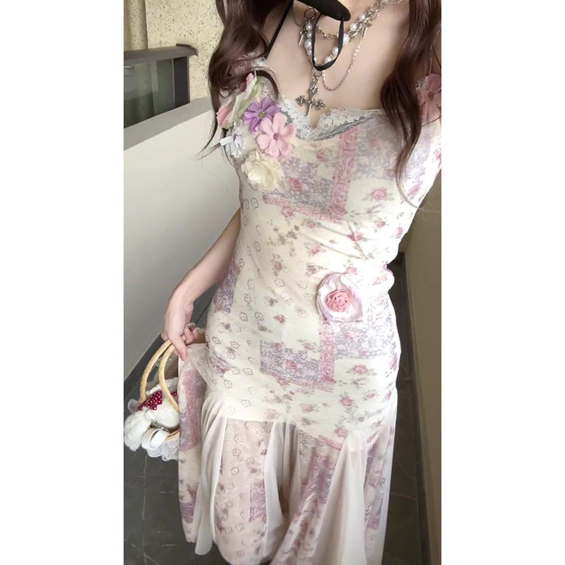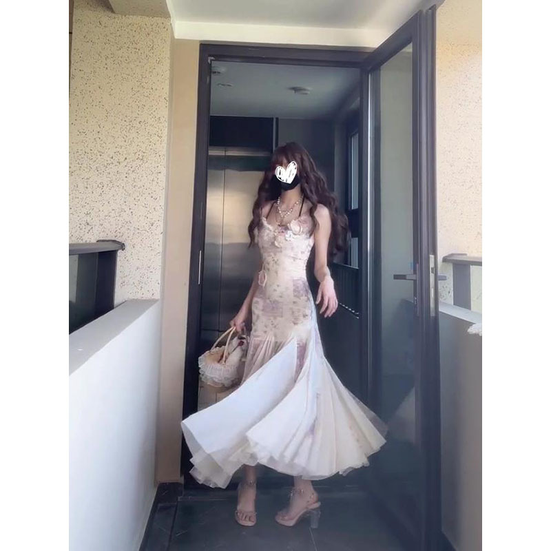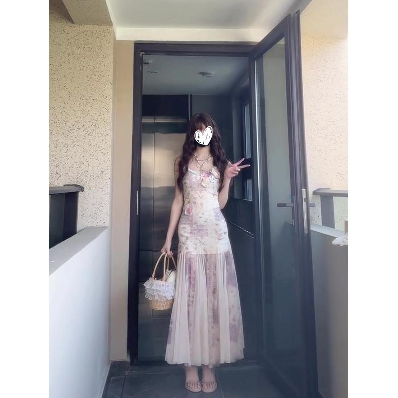여름 해변 휴가를위한 여성용 프렌치 스타일 메쉬 서스펜더 드레스 순수한 욕망 아름다운 허리 커버 엉덩이 피쉬 테일 롱 스커트스토어 가기