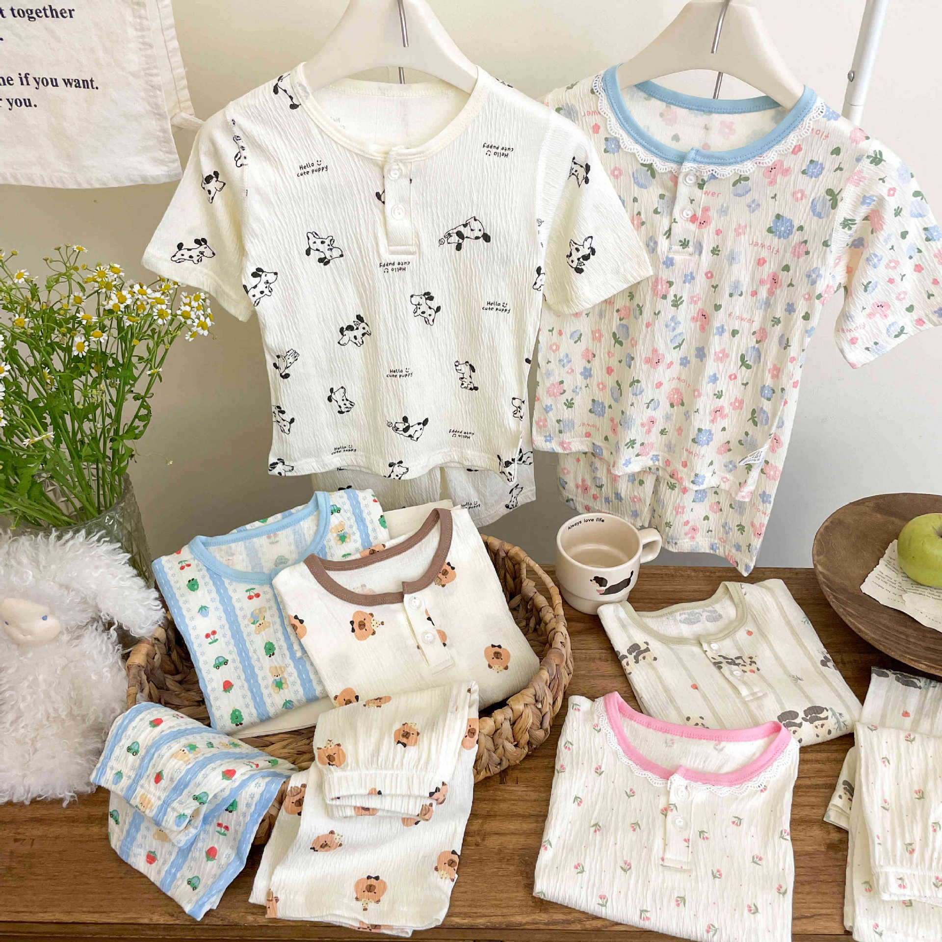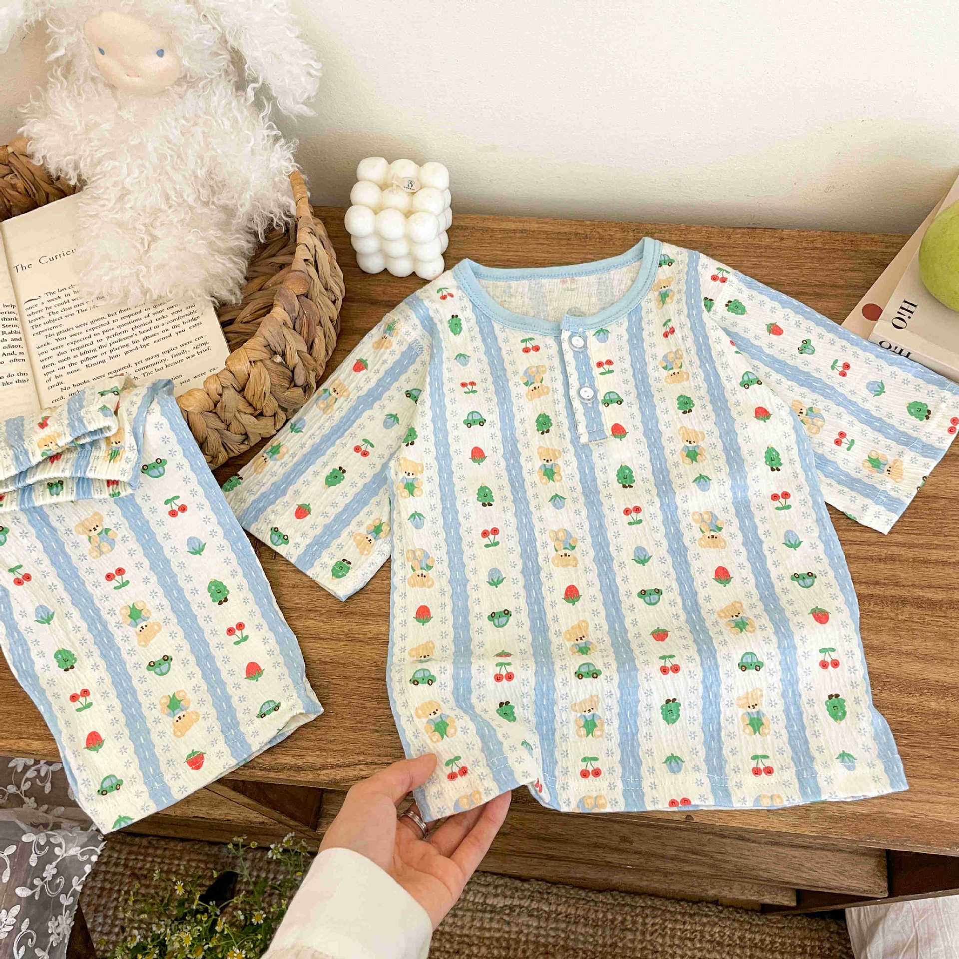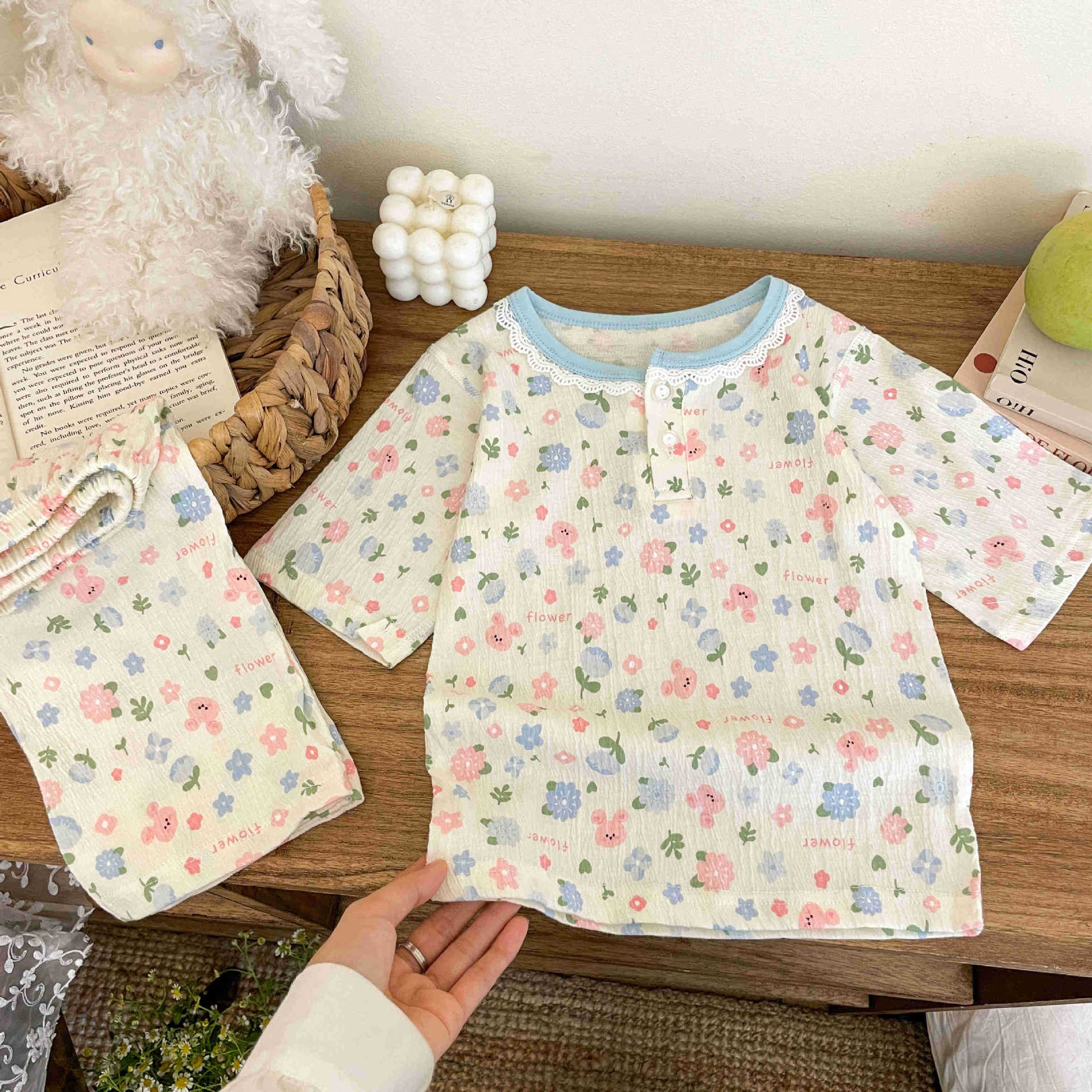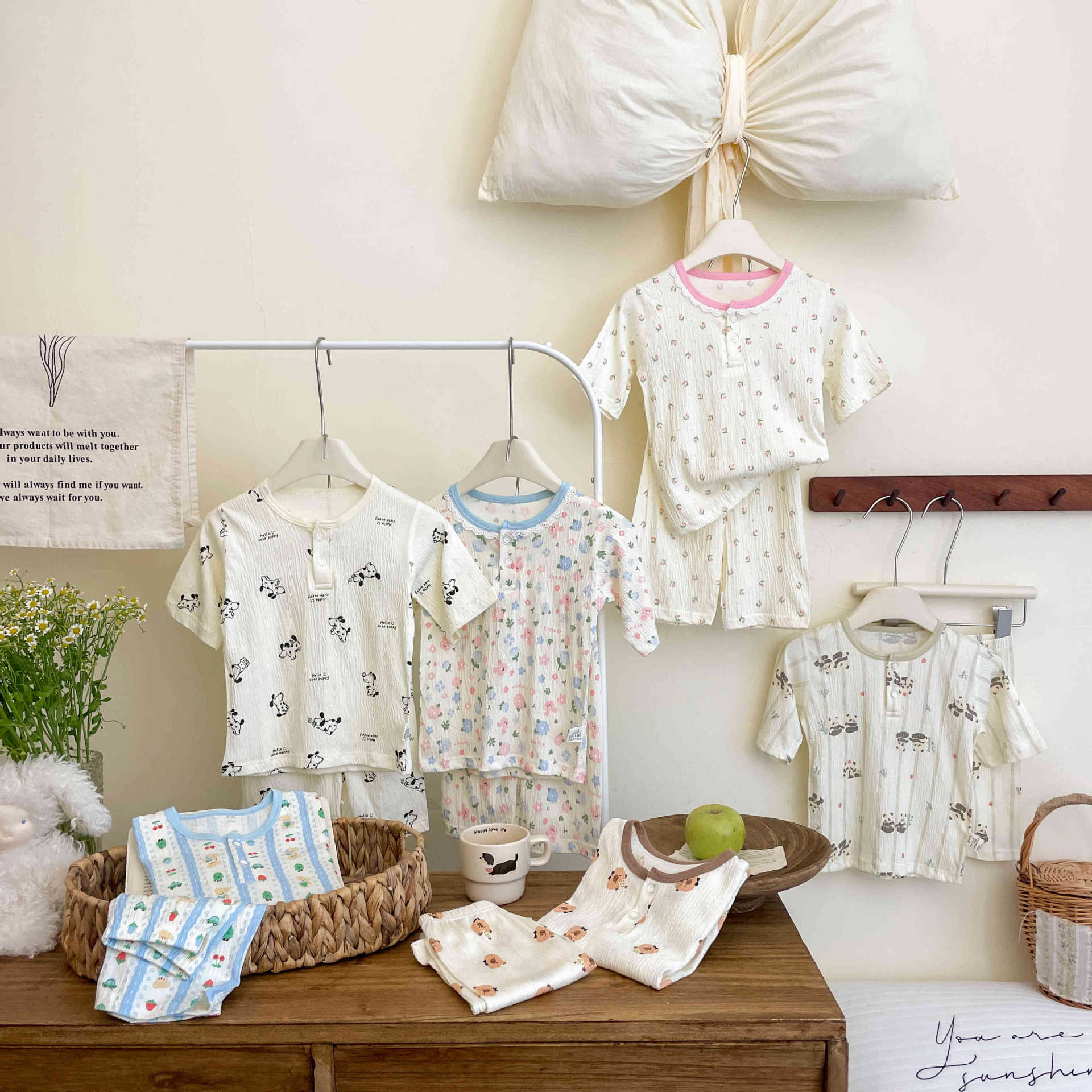 여름 얇은 주름진 면화 아기 순면 에어컨 의류 세트 스플릿 잠옷 소년과 소녀 7부 소매 가정 의류스토어 가기