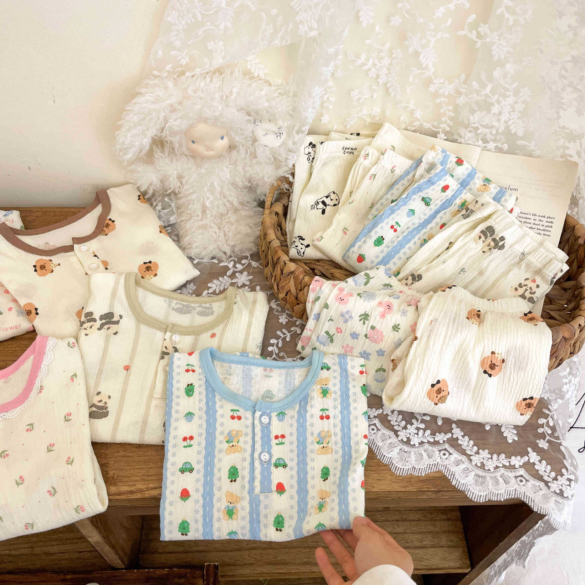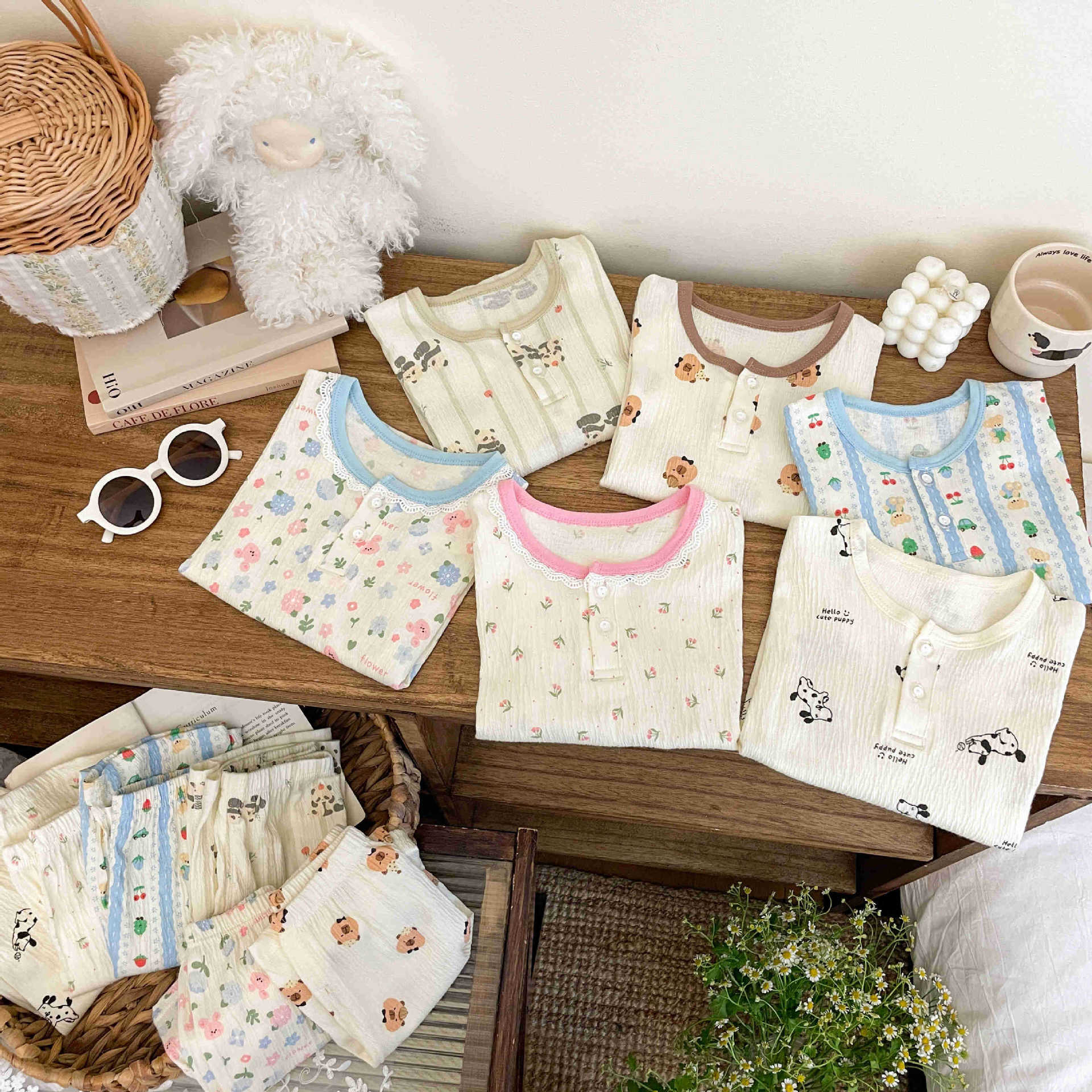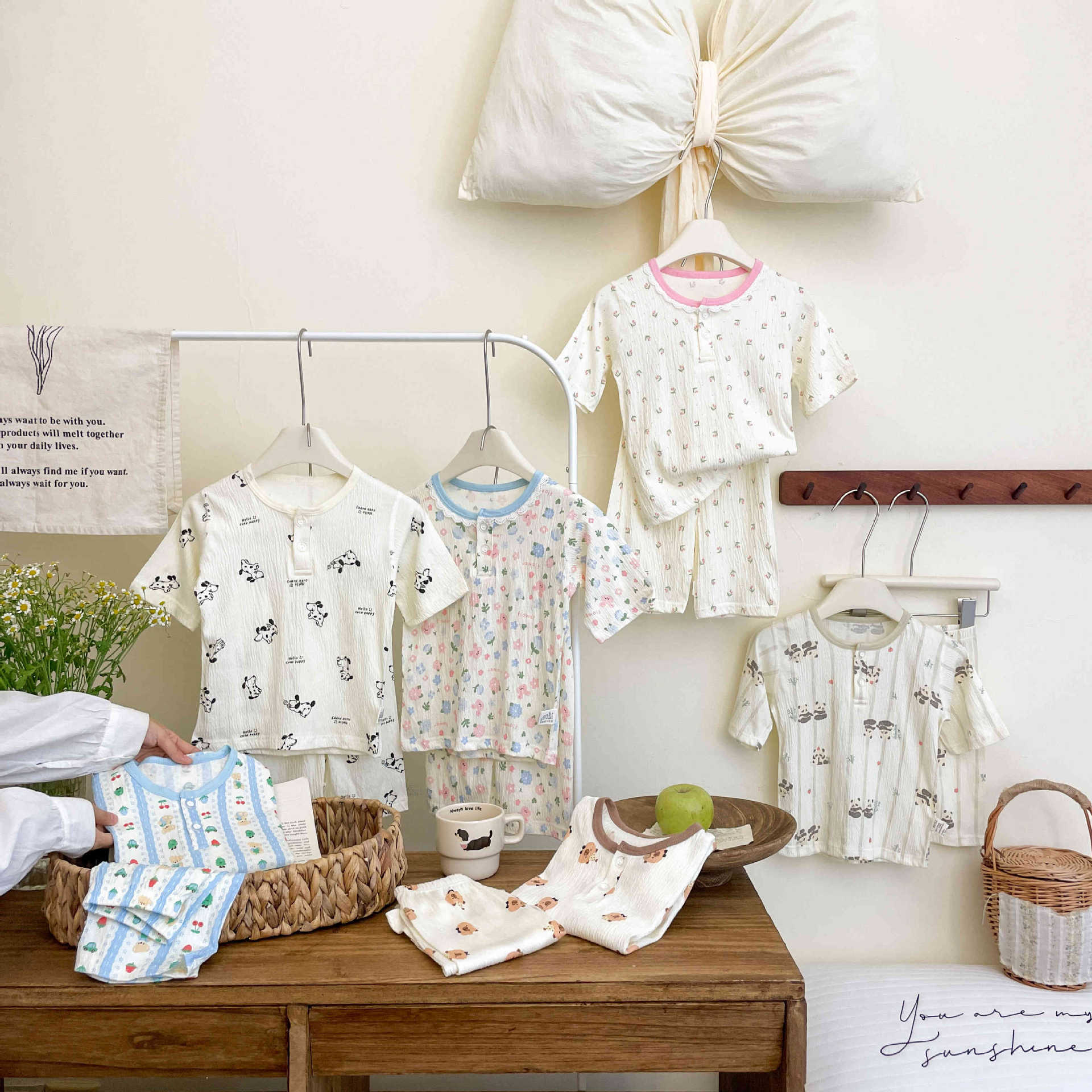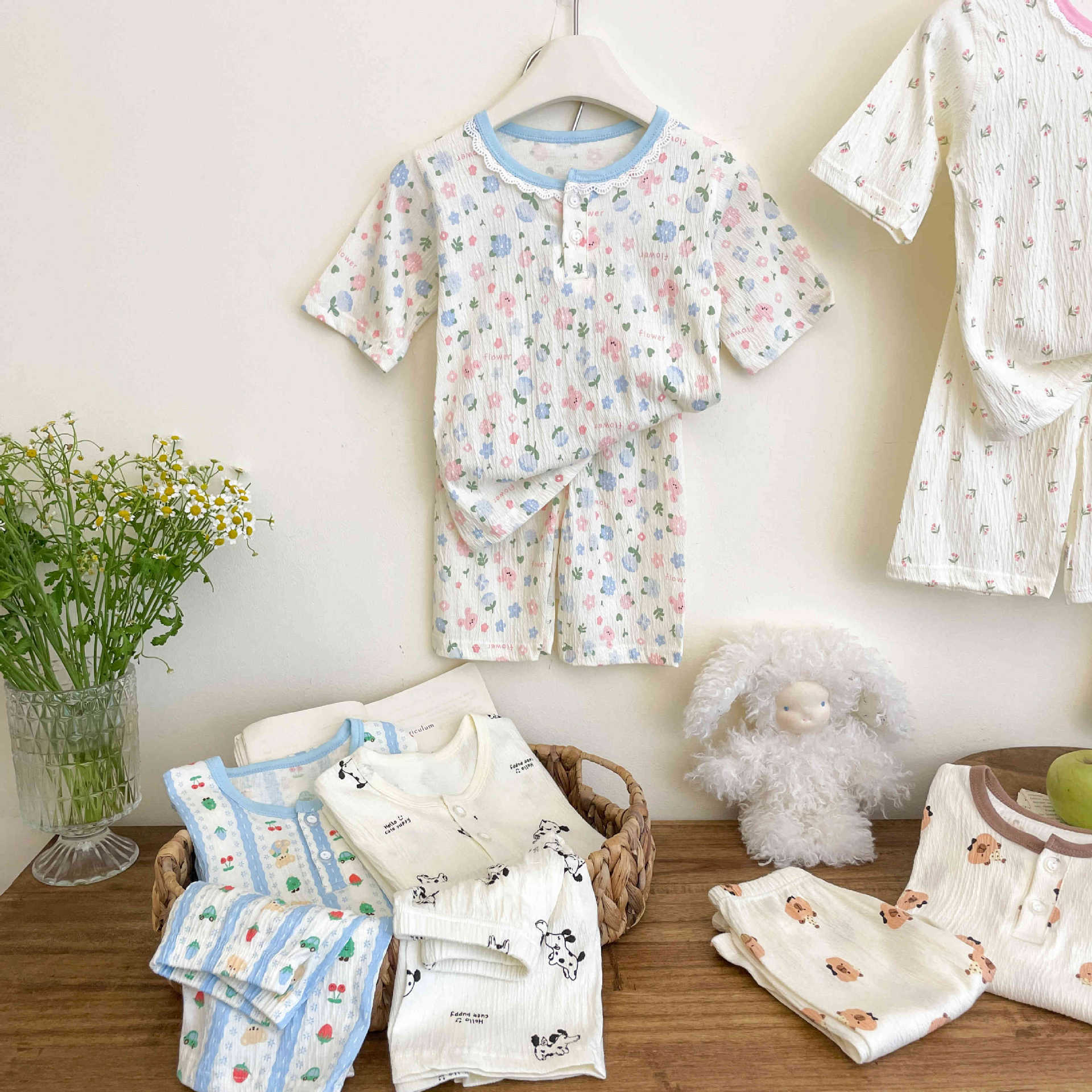 여름 얇은 주름진 면화 아기 순면 에어컨 의류 세트 스플릿 잠옷 소년과 소녀 7부 소매 가정 의류스토어 가기