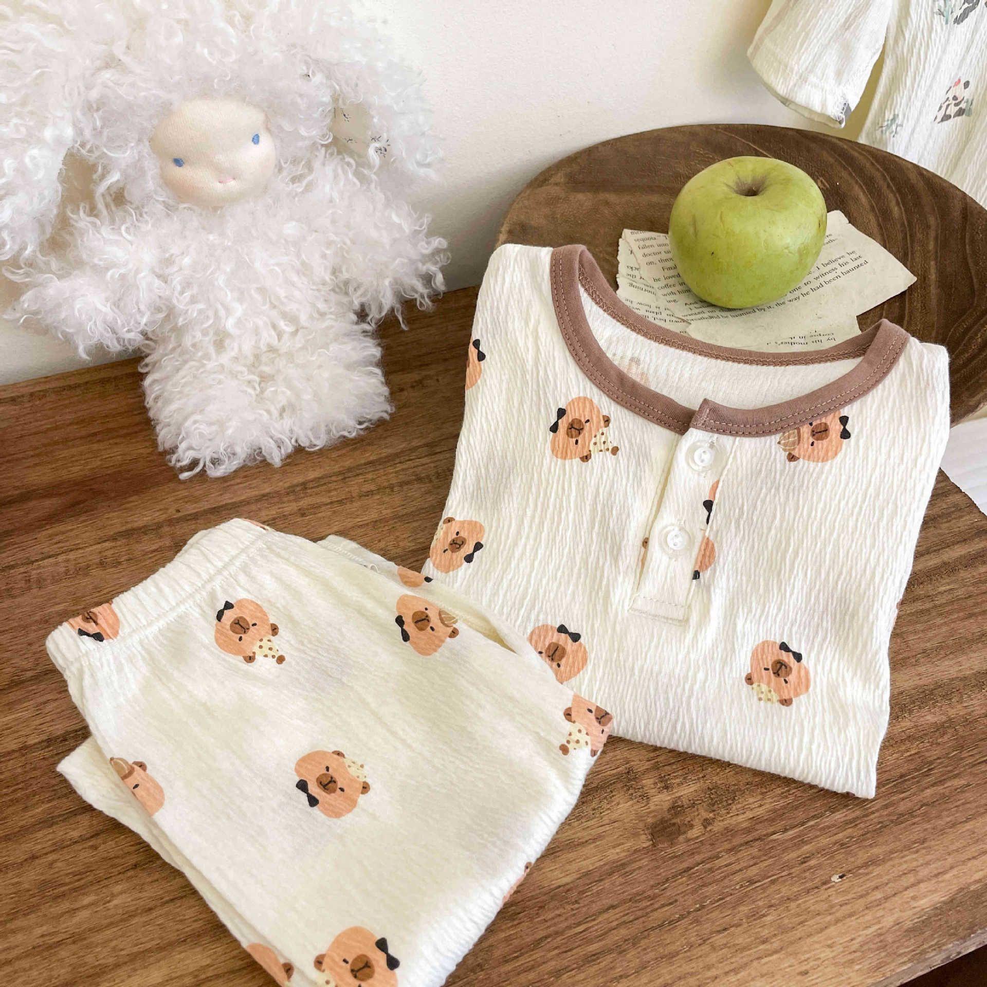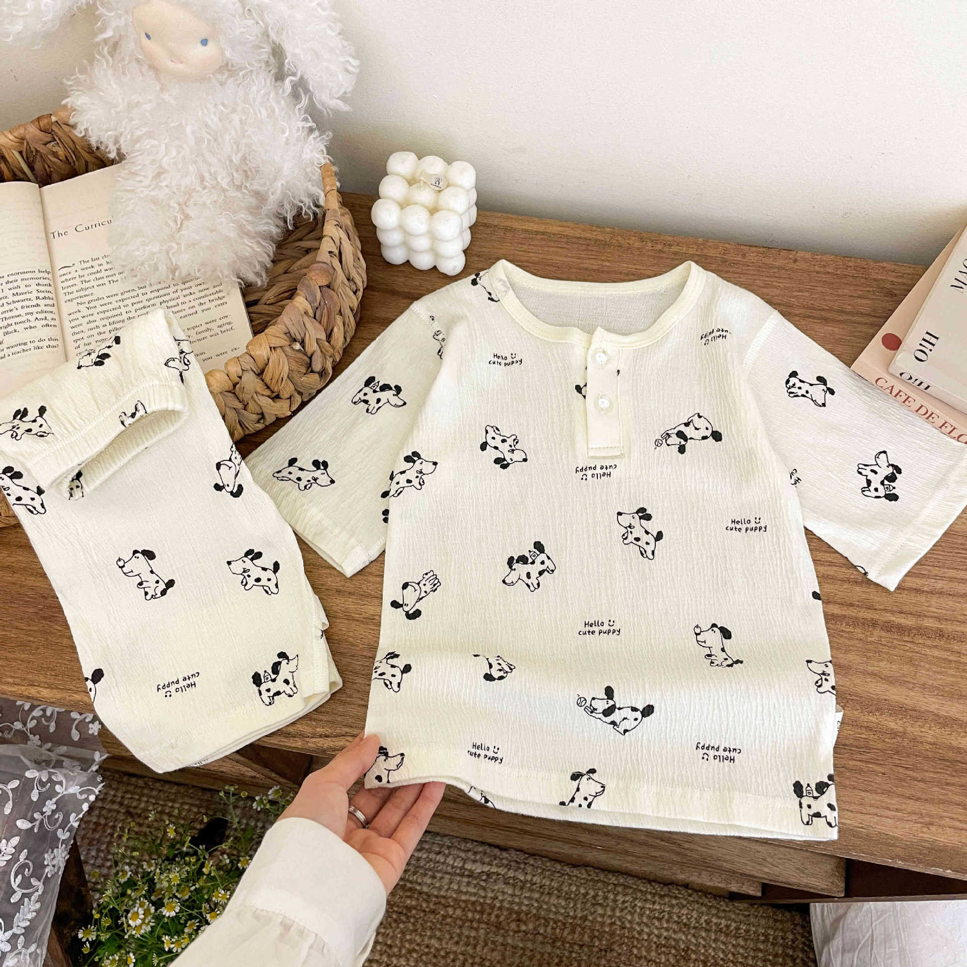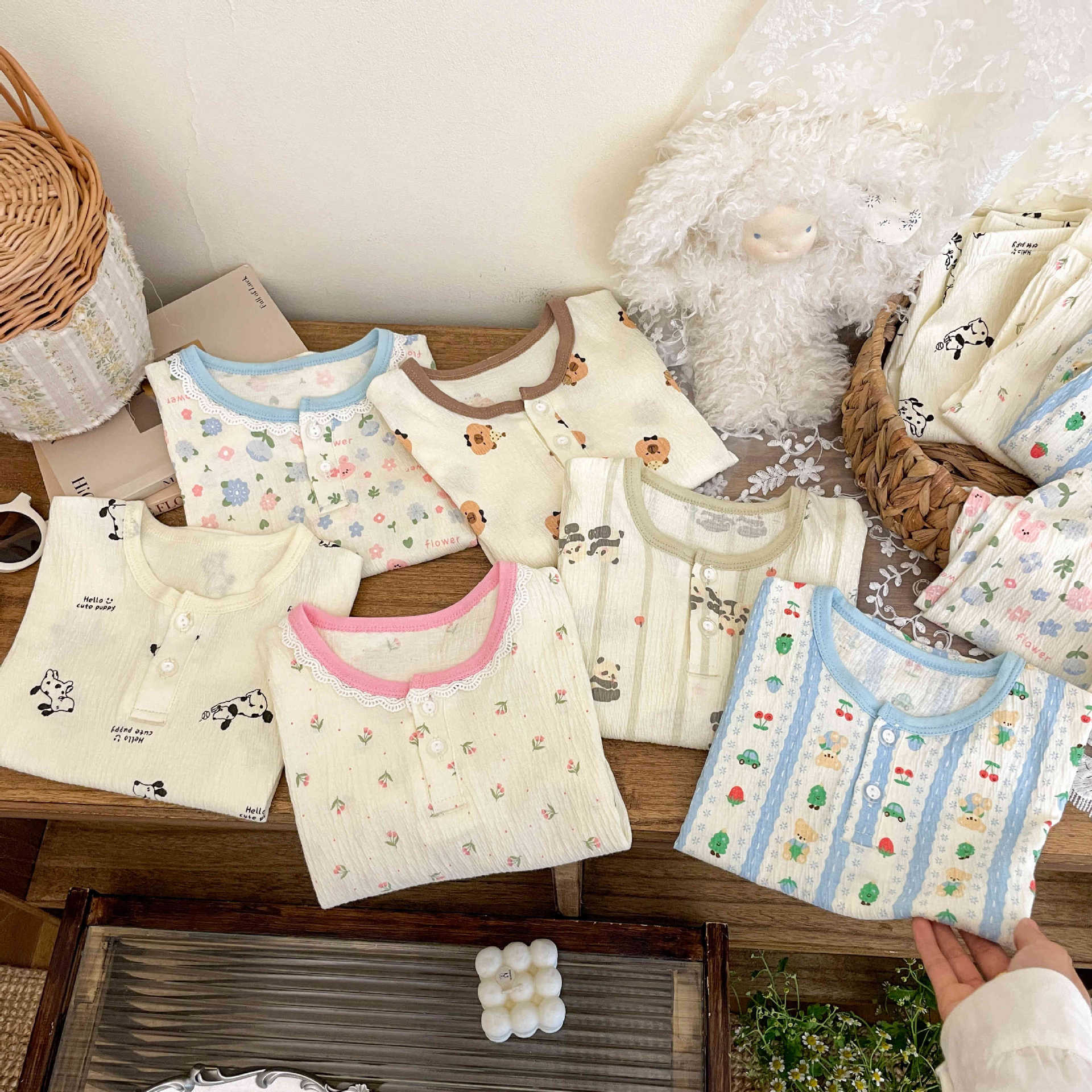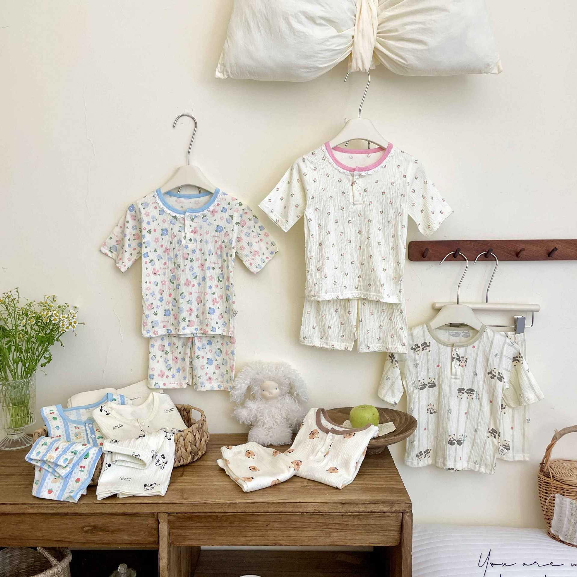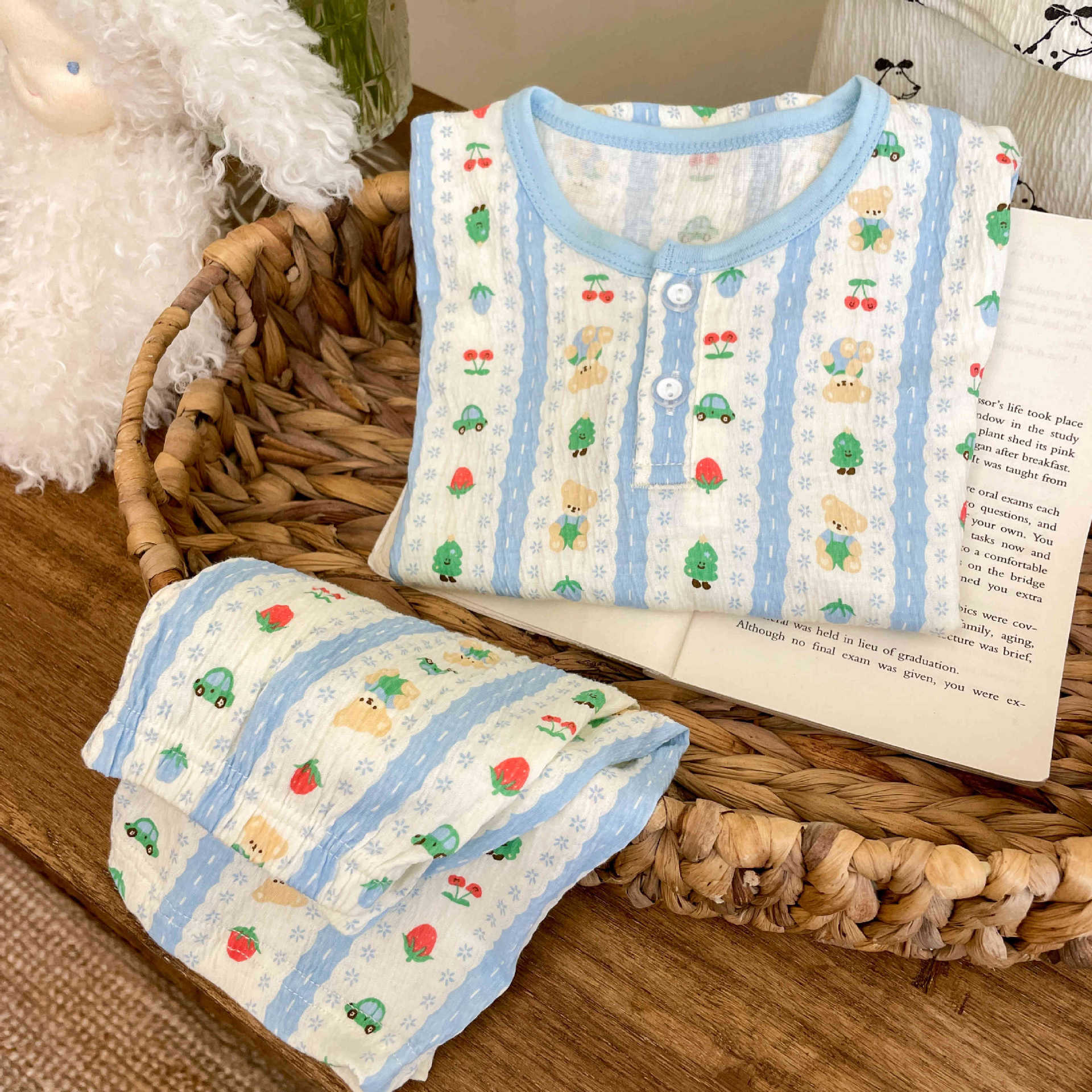 여름 얇은 주름진 면화 아기 순면 에어컨 의류 세트 스플릿 잠옷 소년과 소녀 7부 소매 가정 의류스토어 가기