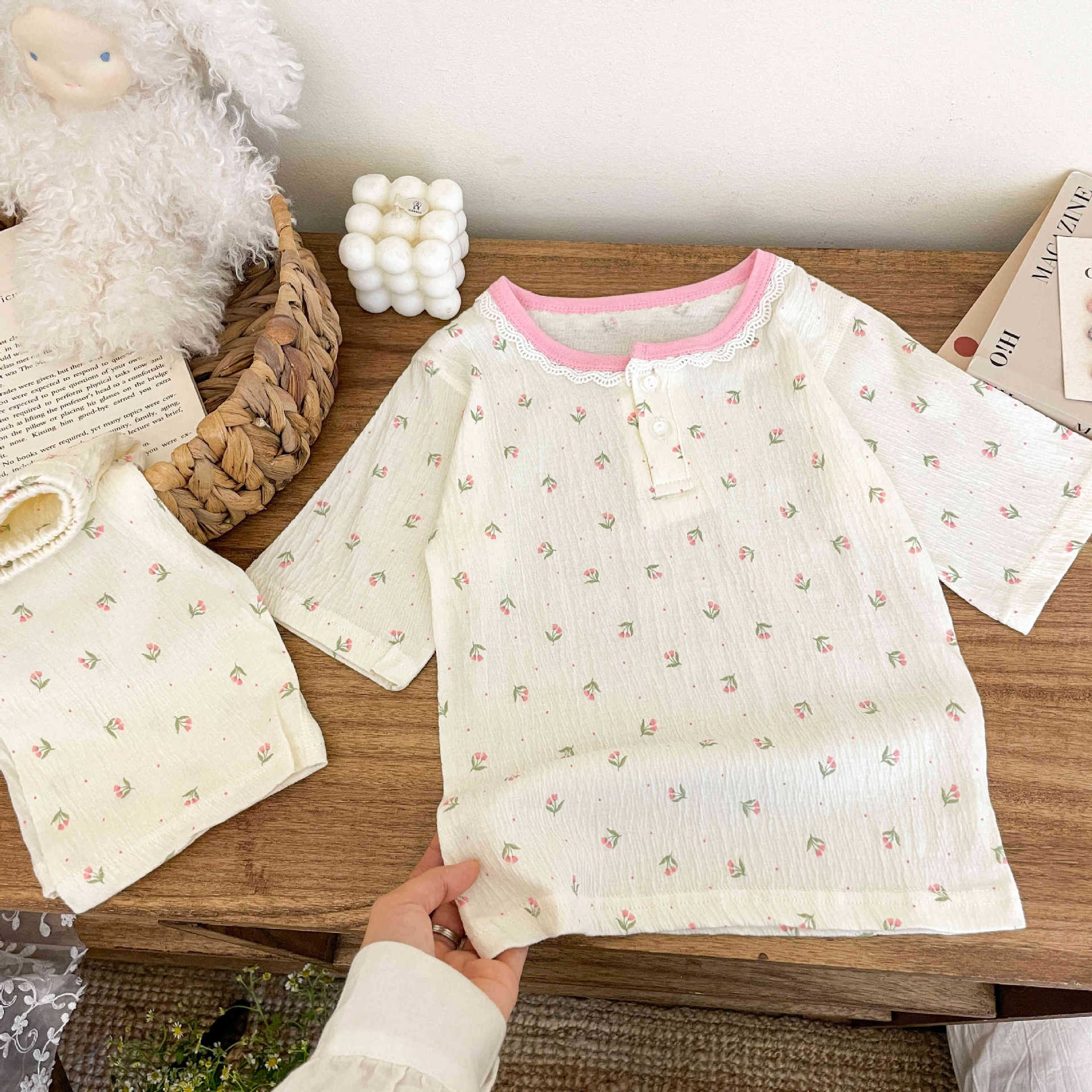 여름 얇은 주름진 면화 아기 순면 에어컨 의류 세트 스플릿 잠옷 소년과 소녀 7부 소매 가정 의류