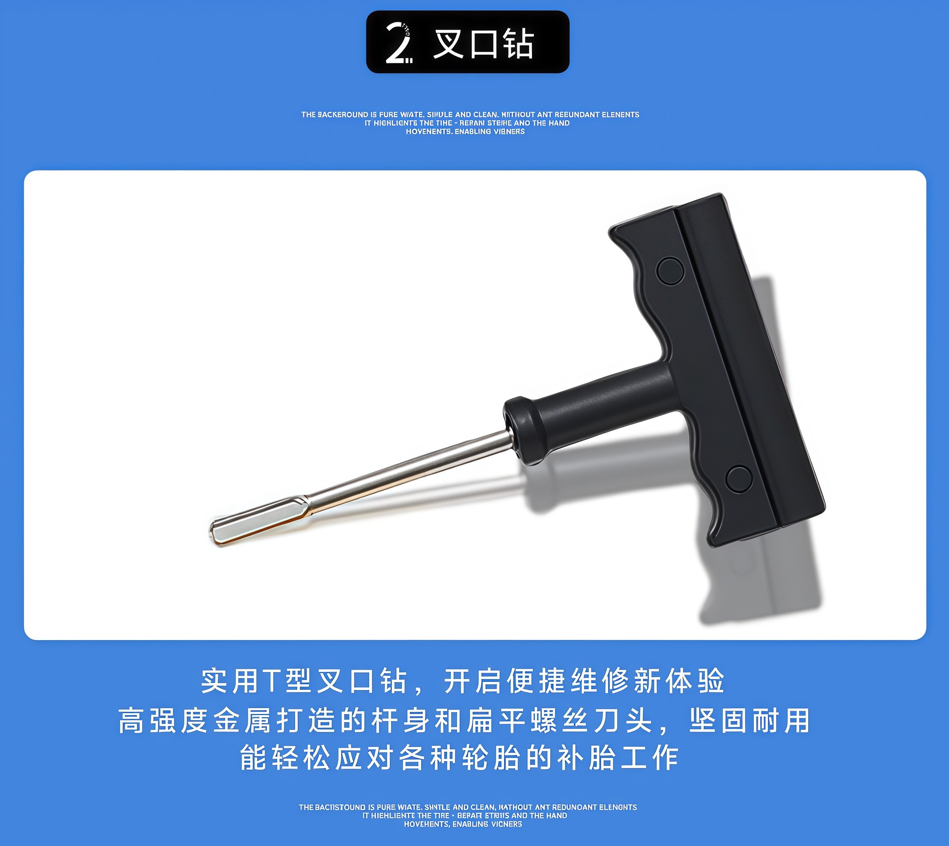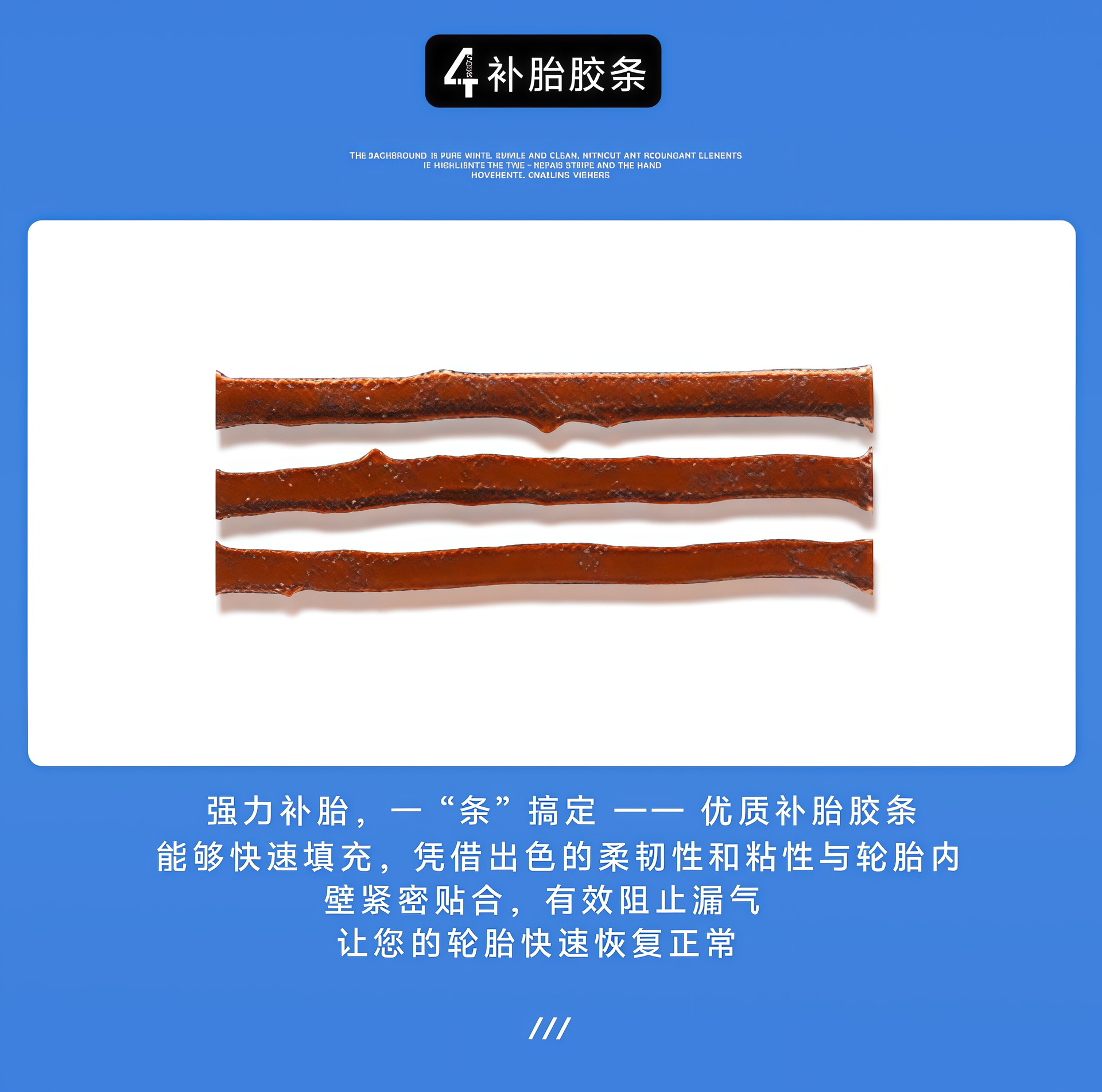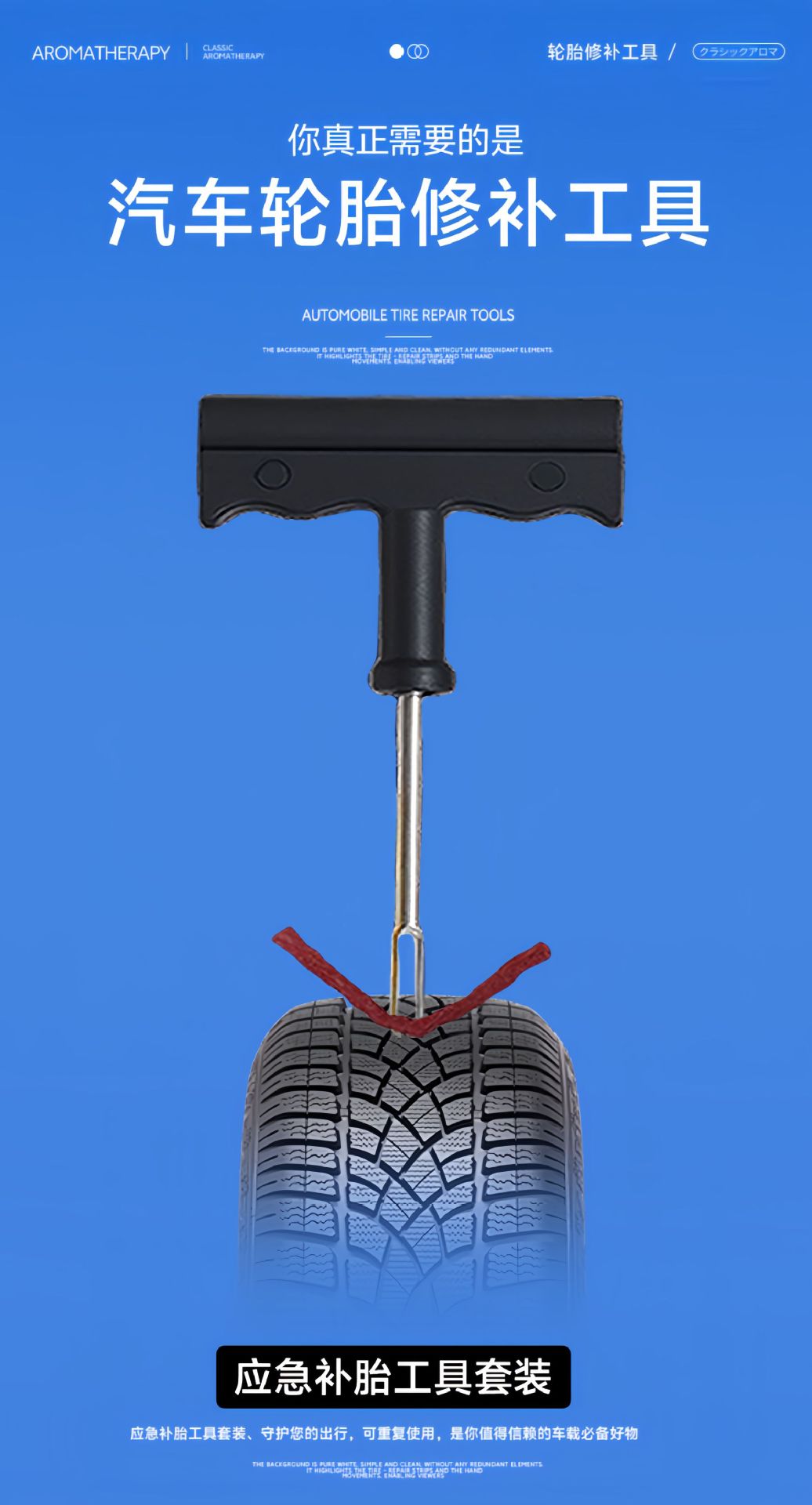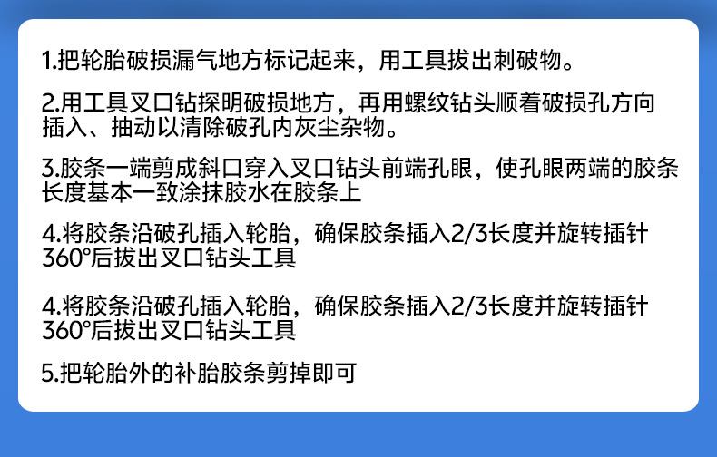 4.将带胶条的插针沿破孔插入轮胎,确保胶条插入2/3长度(必须确定冷补胶条穿透胎体,避免充气后滑出),并旋转插针360度后拔出插针。