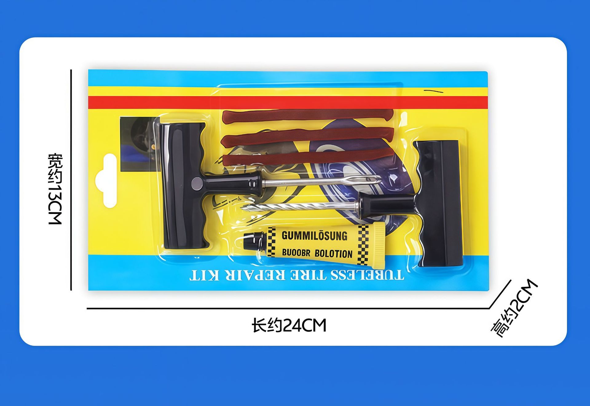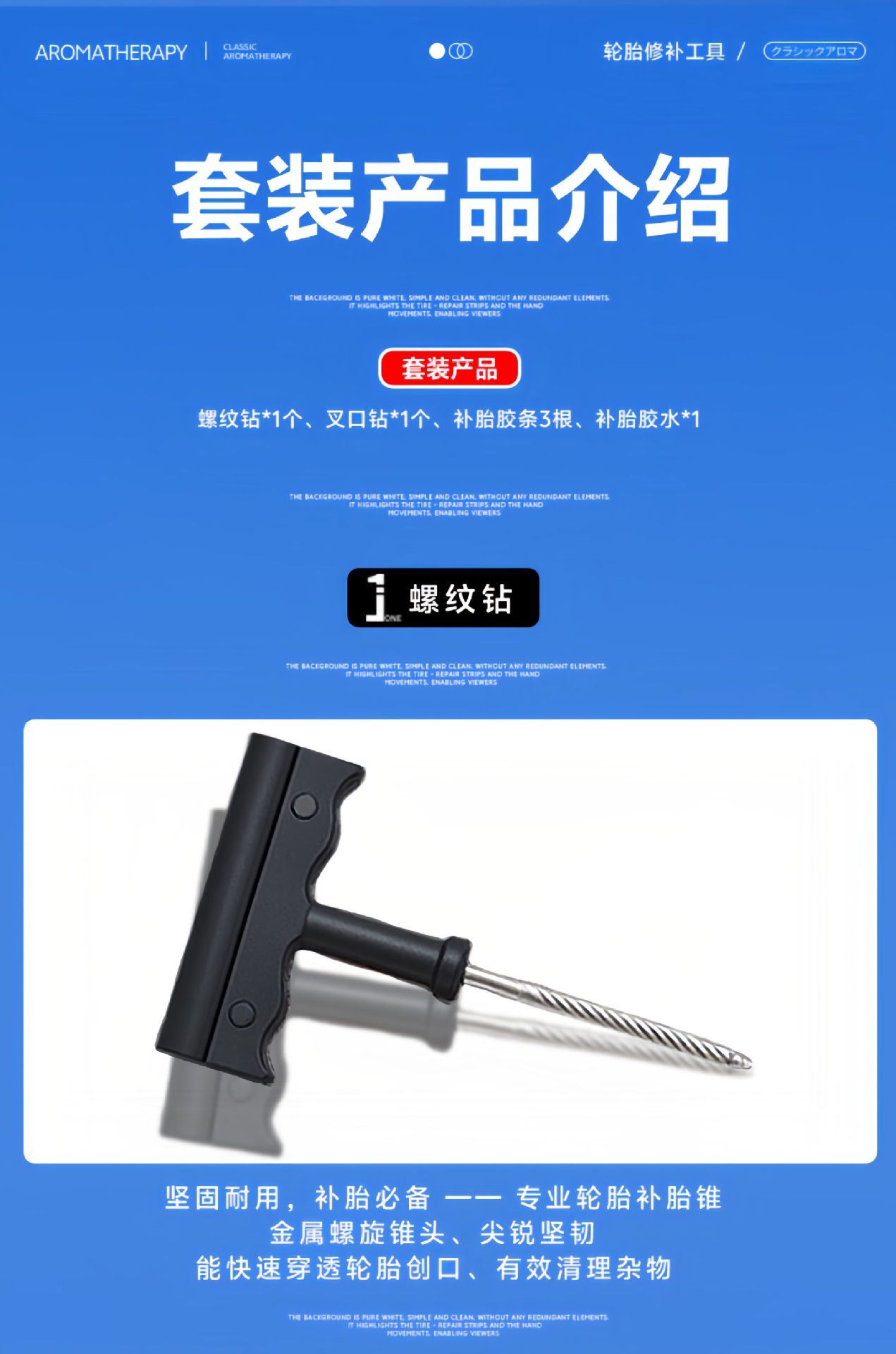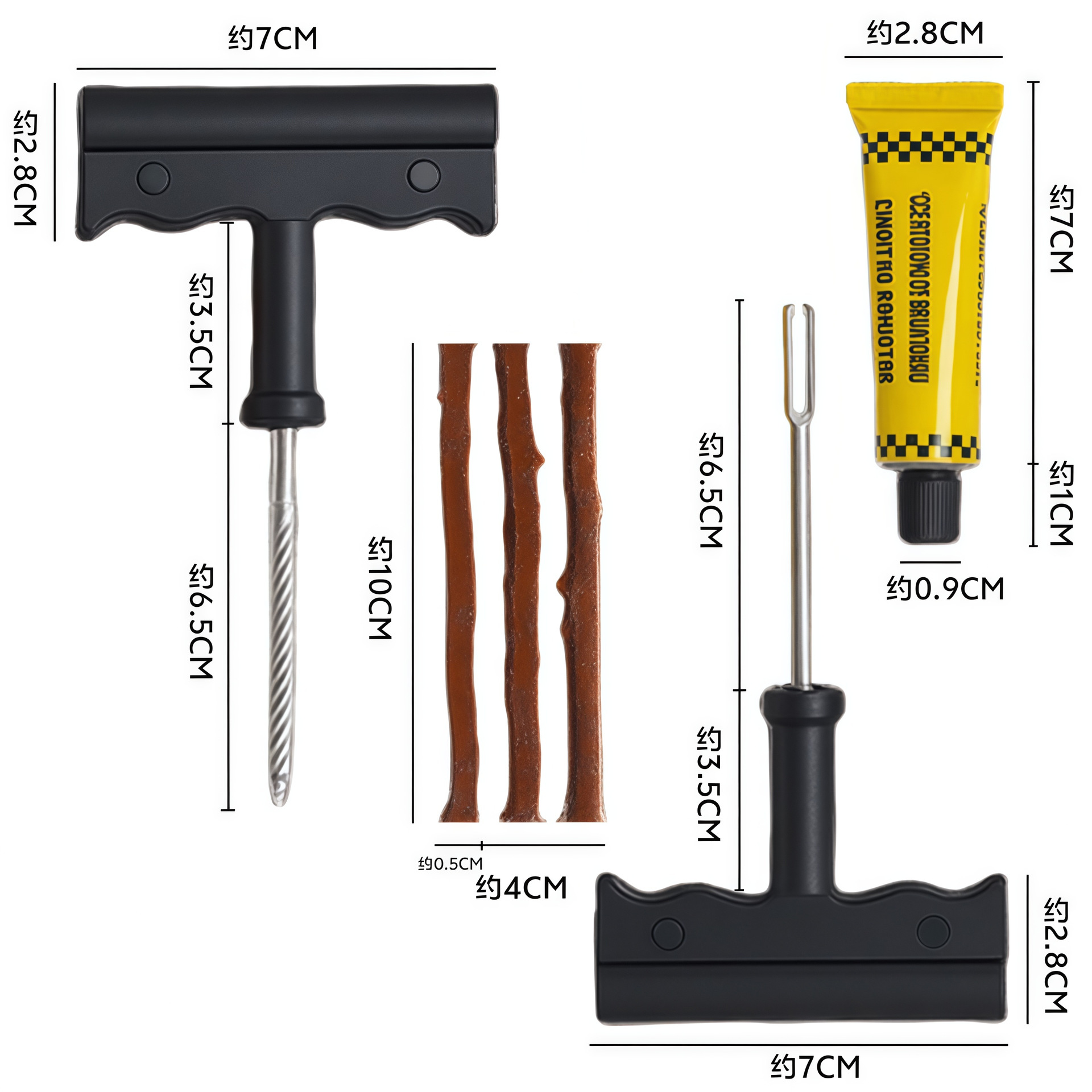 4.将带胶条的插针沿破孔插入轮胎,确保胶条插入2/3长度(必须确定冷补胶条穿透胎体,避免充气后滑出),并旋转插针360度后拔出插针。