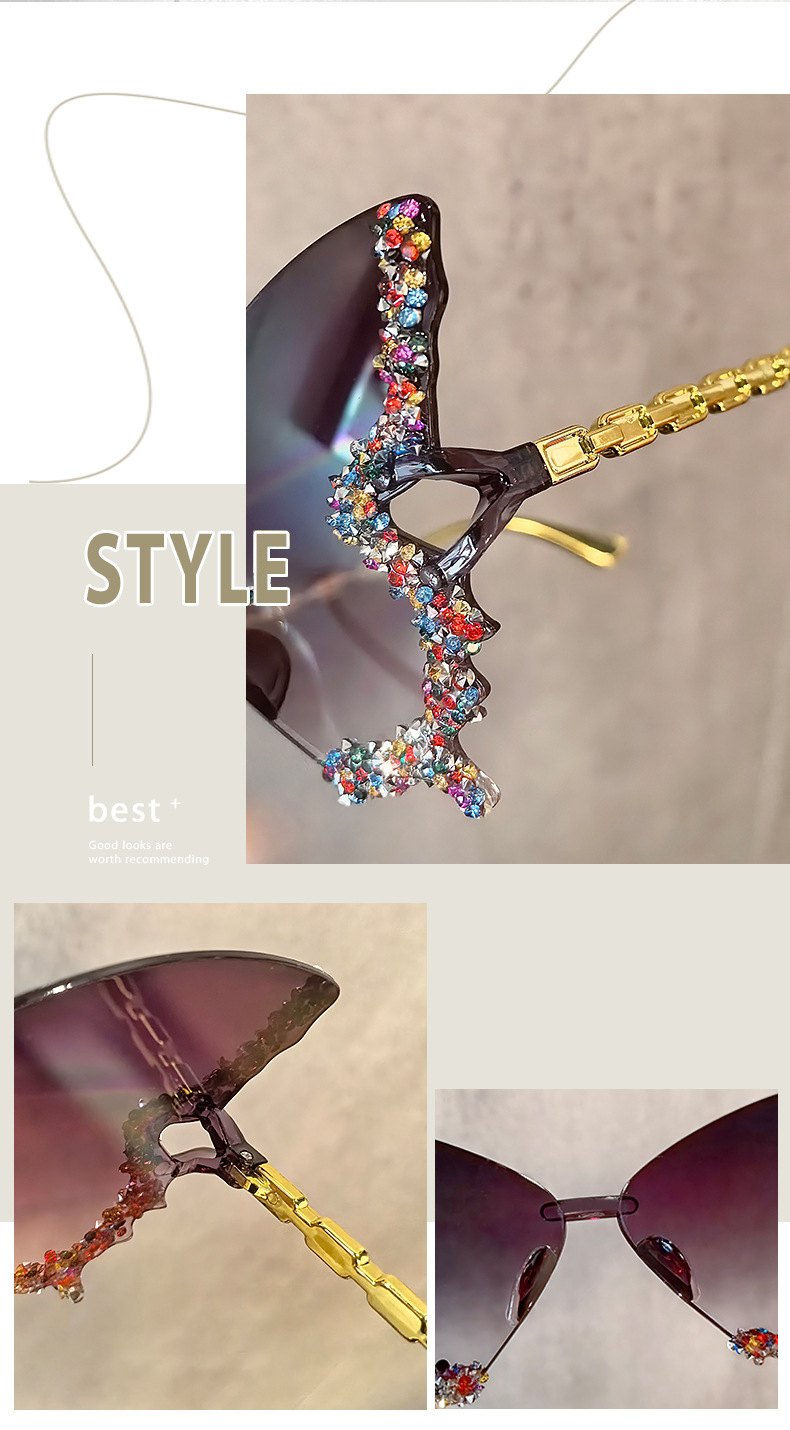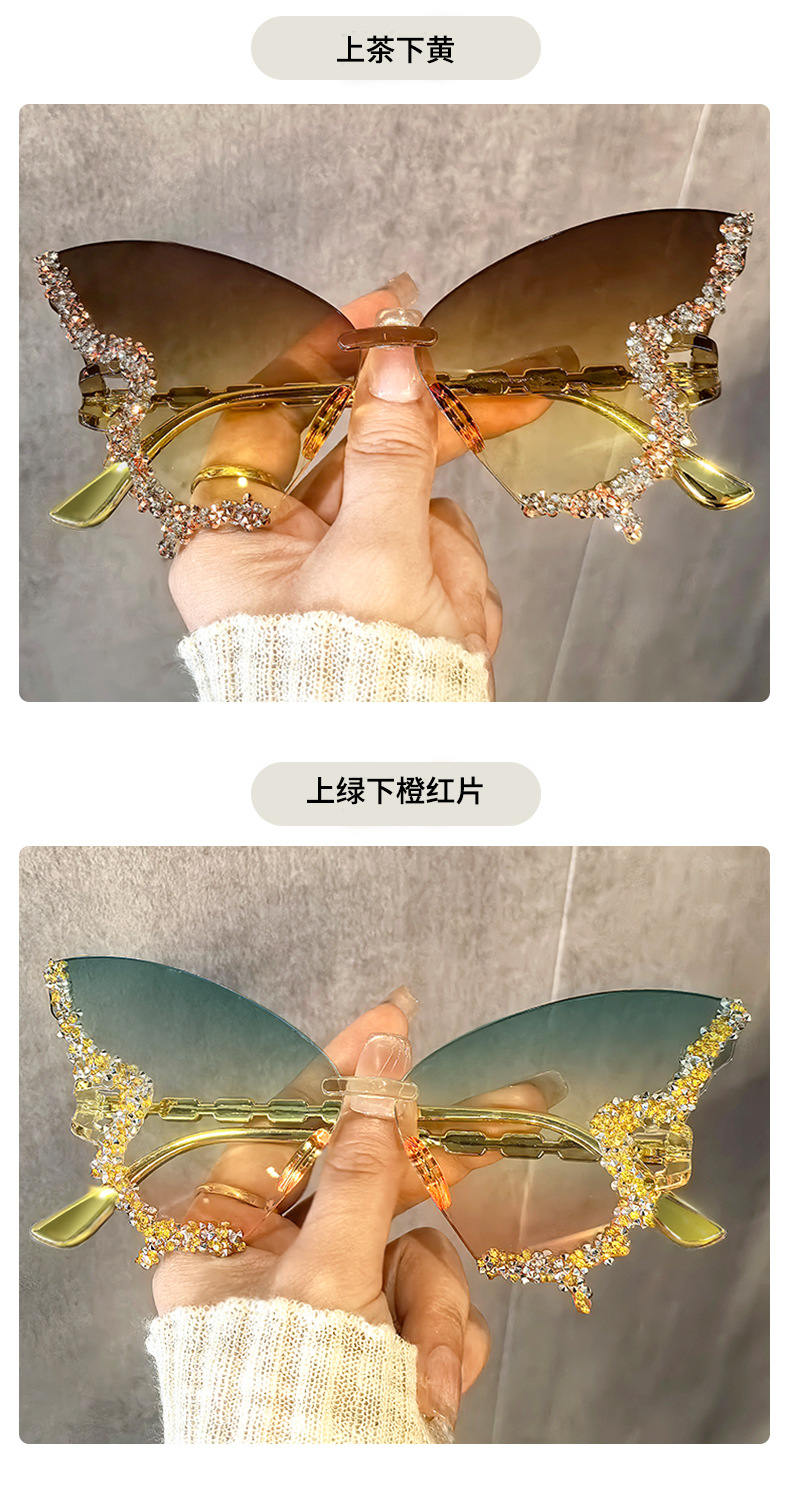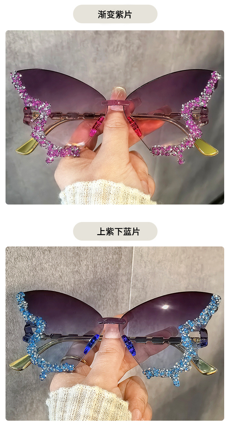 여성을 위한 국경 간 인기 나비 모양 다이아몬드가 박힌 무테 선글라스, 유럽 및 미국 파티 댄스 파티 맞춤형 패션쇼 재미있는 선글라스스토어 가기