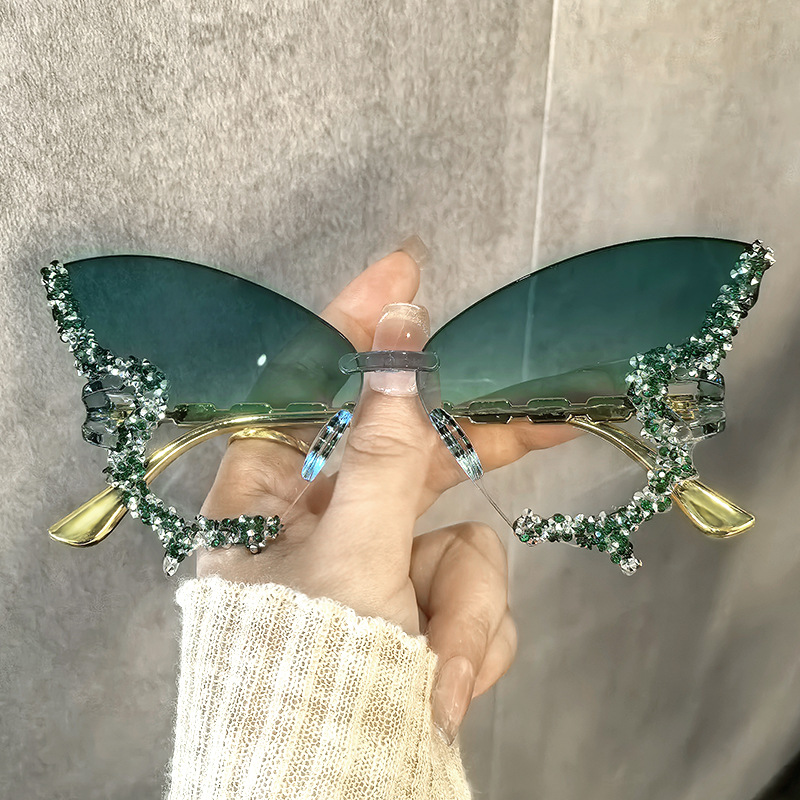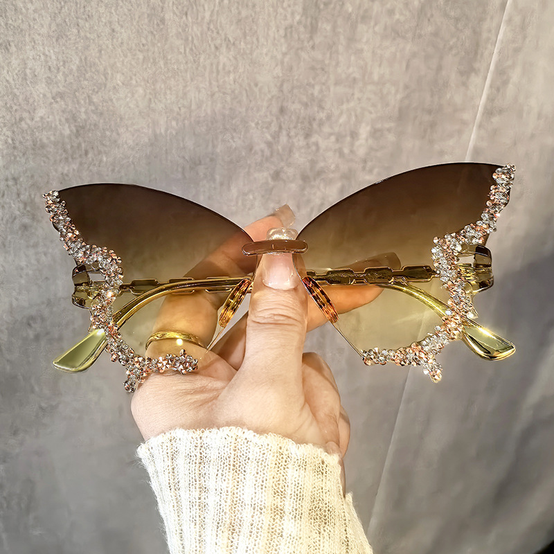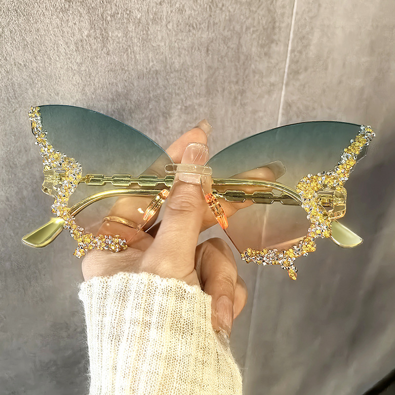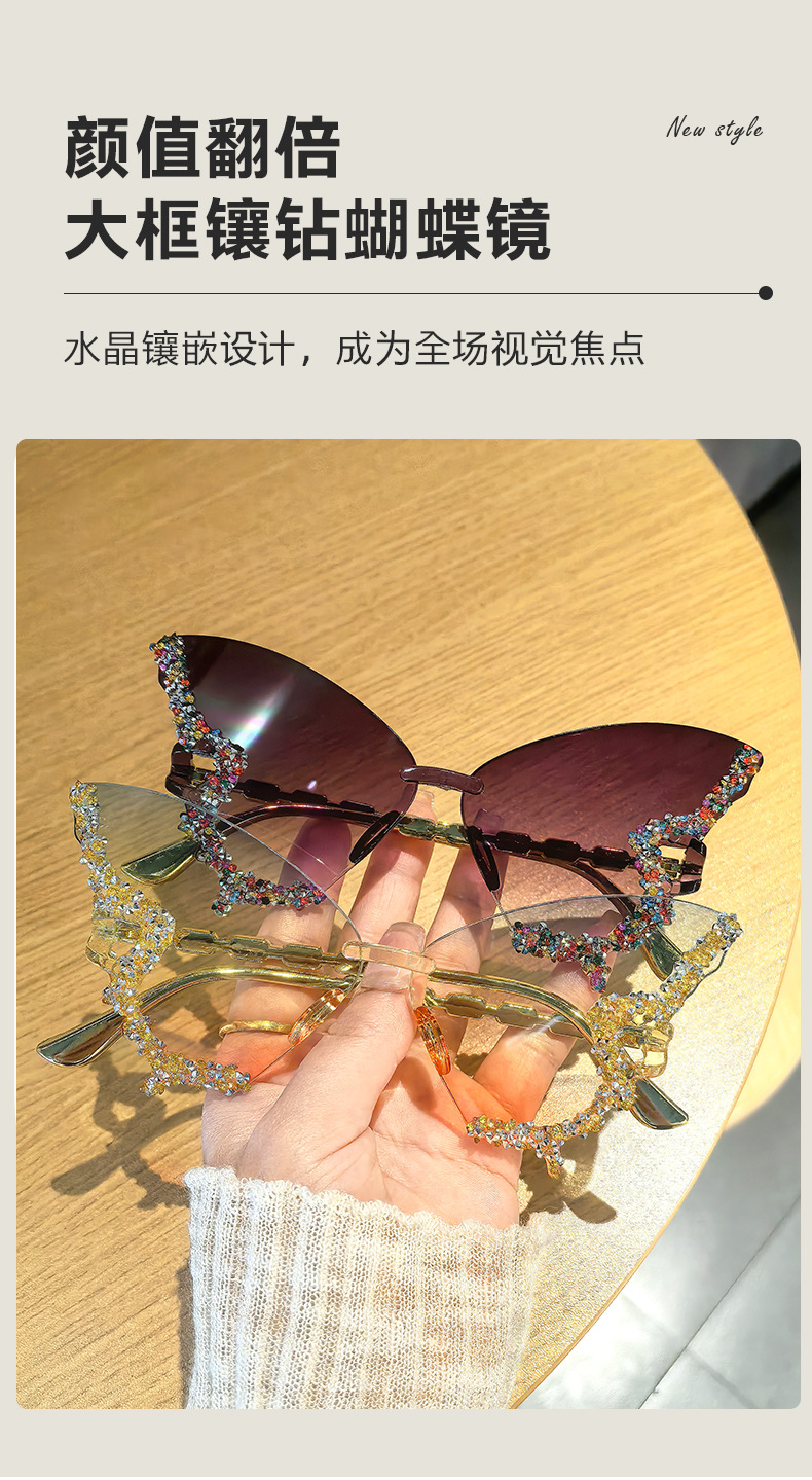 여성을 위한 국경 간 인기 나비 모양 다이아몬드가 박힌 무테 선글라스, 유럽 및 미국 파티 댄스 파티 맞춤형 패션쇼 재미있는 선글라스스토어 가기