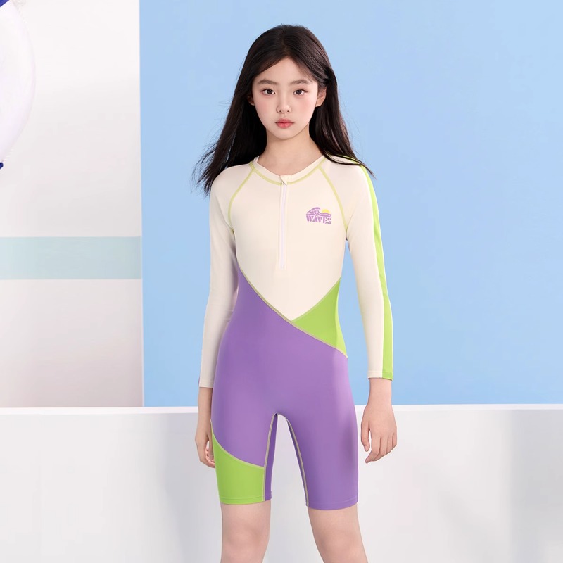 여성용 아동 수영복 2025 새로운 원피스 긴팔 반바지 중대형 어린이 전문 수영 훈련 자외선 차단제 속건성 수영복